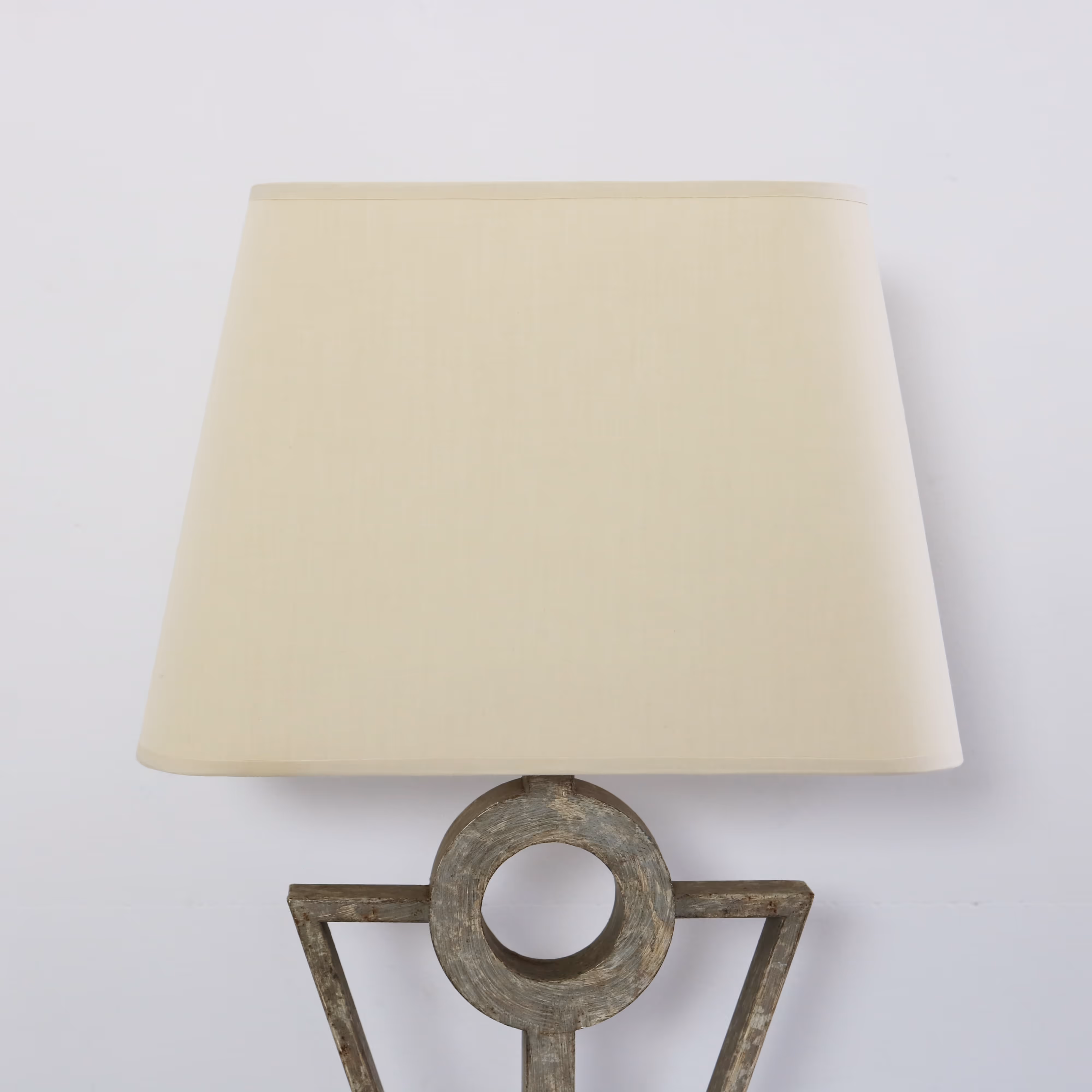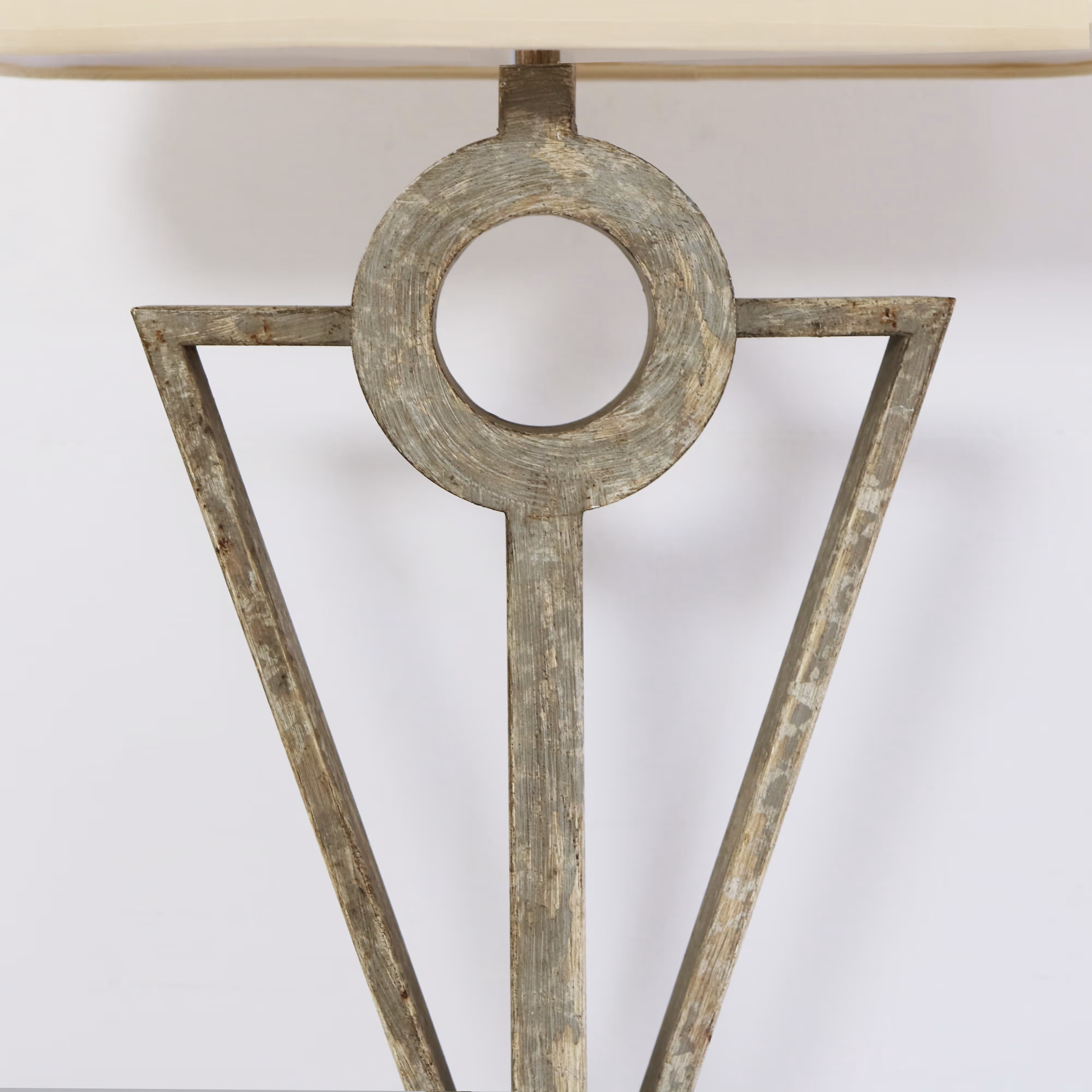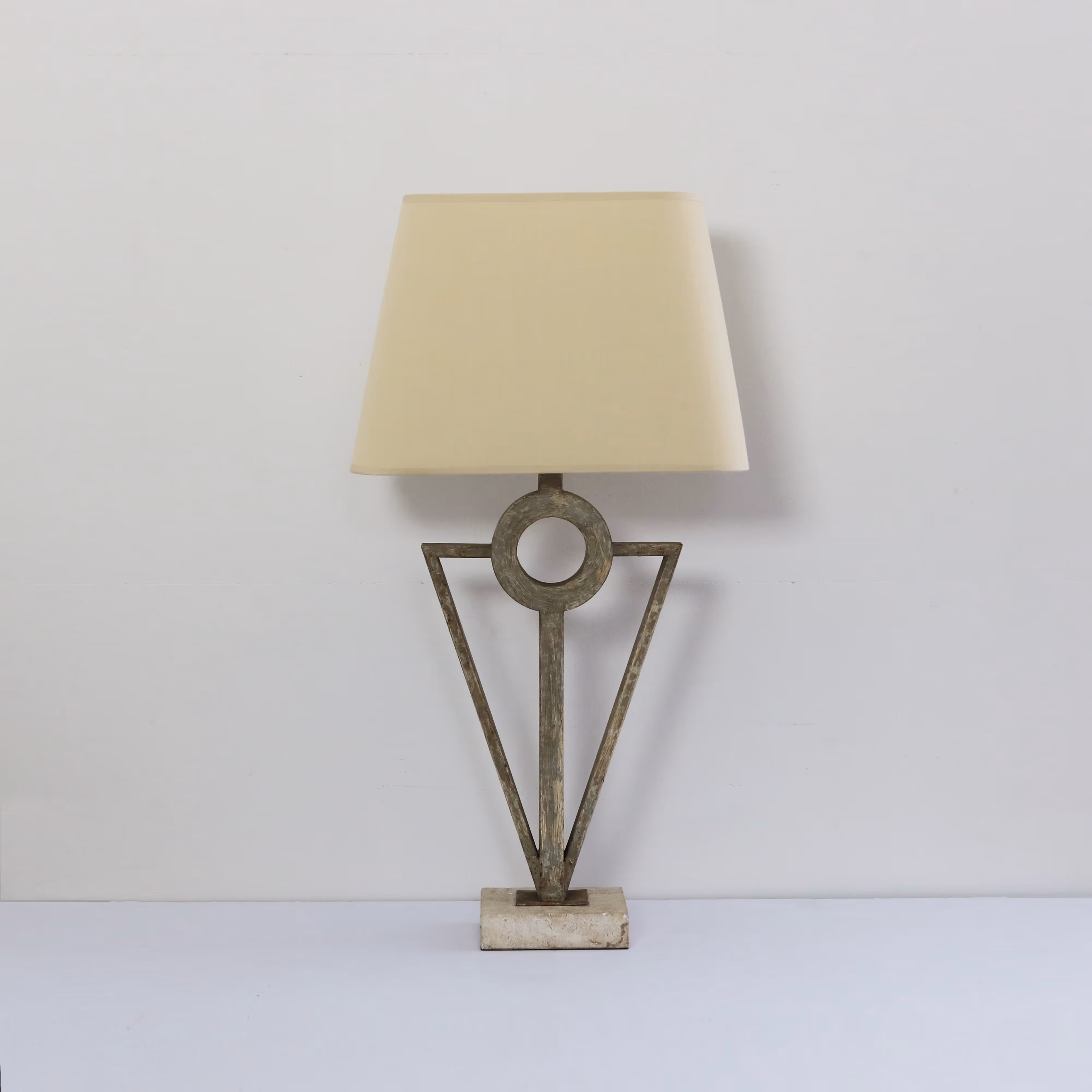 A pair of large geometric table lamps. Painted metal frames on stone bases.