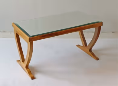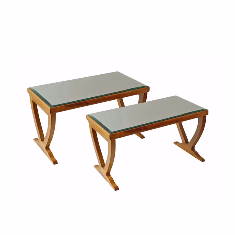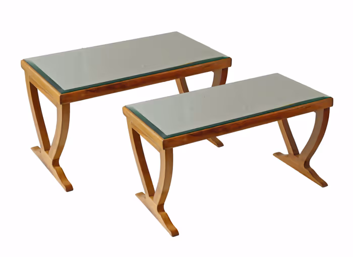 A pair of coffee tables with beech bases and bevelled mirror tops