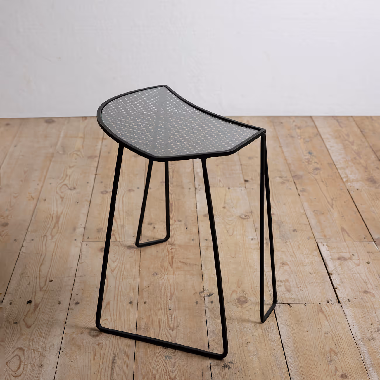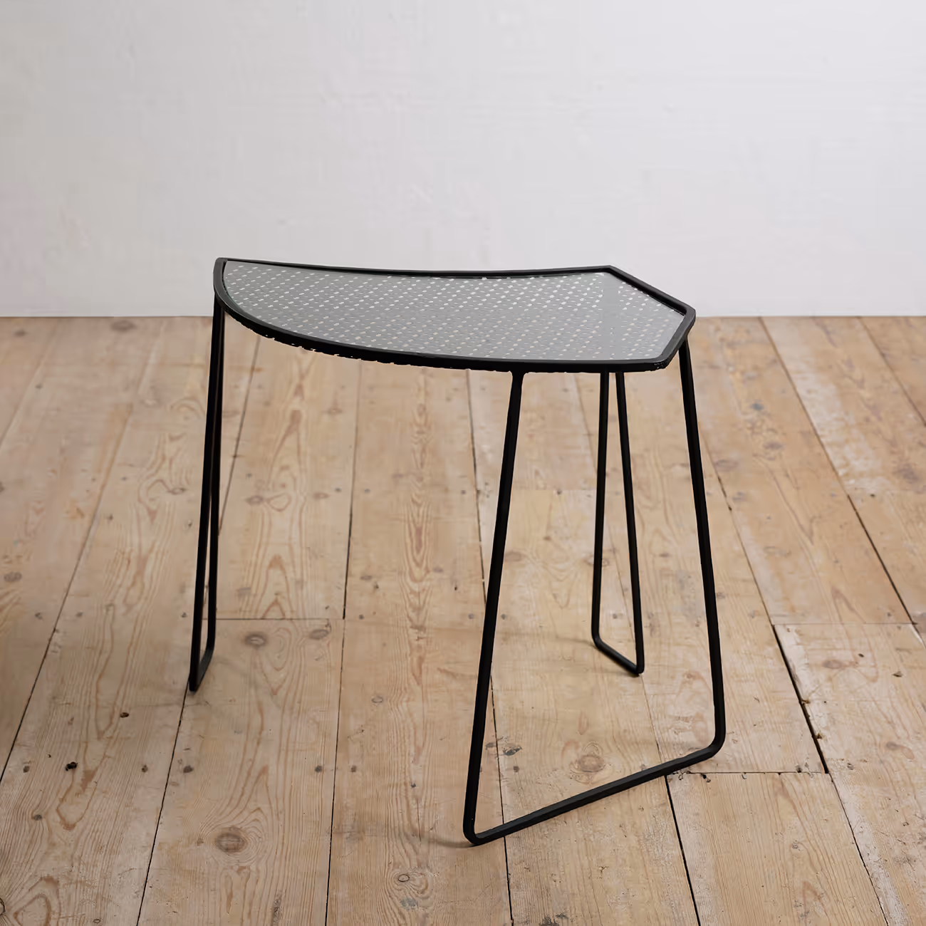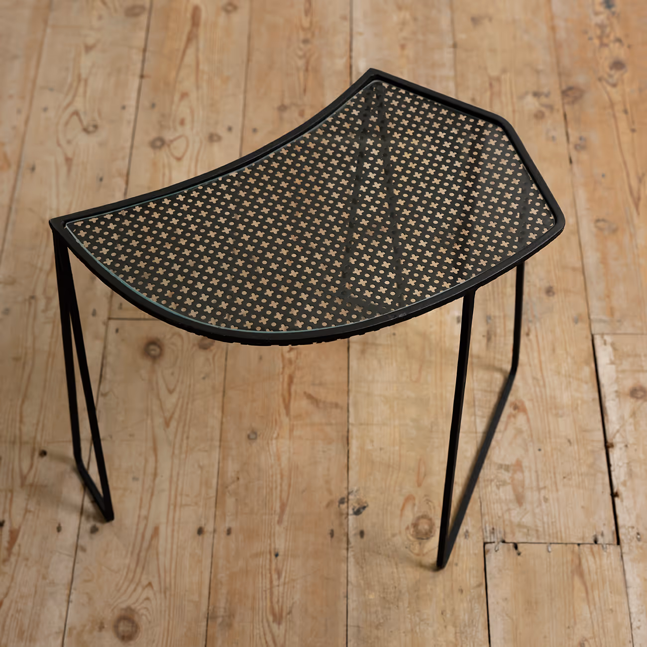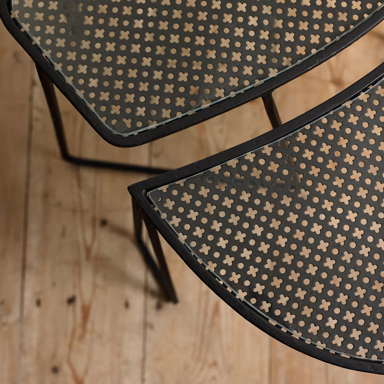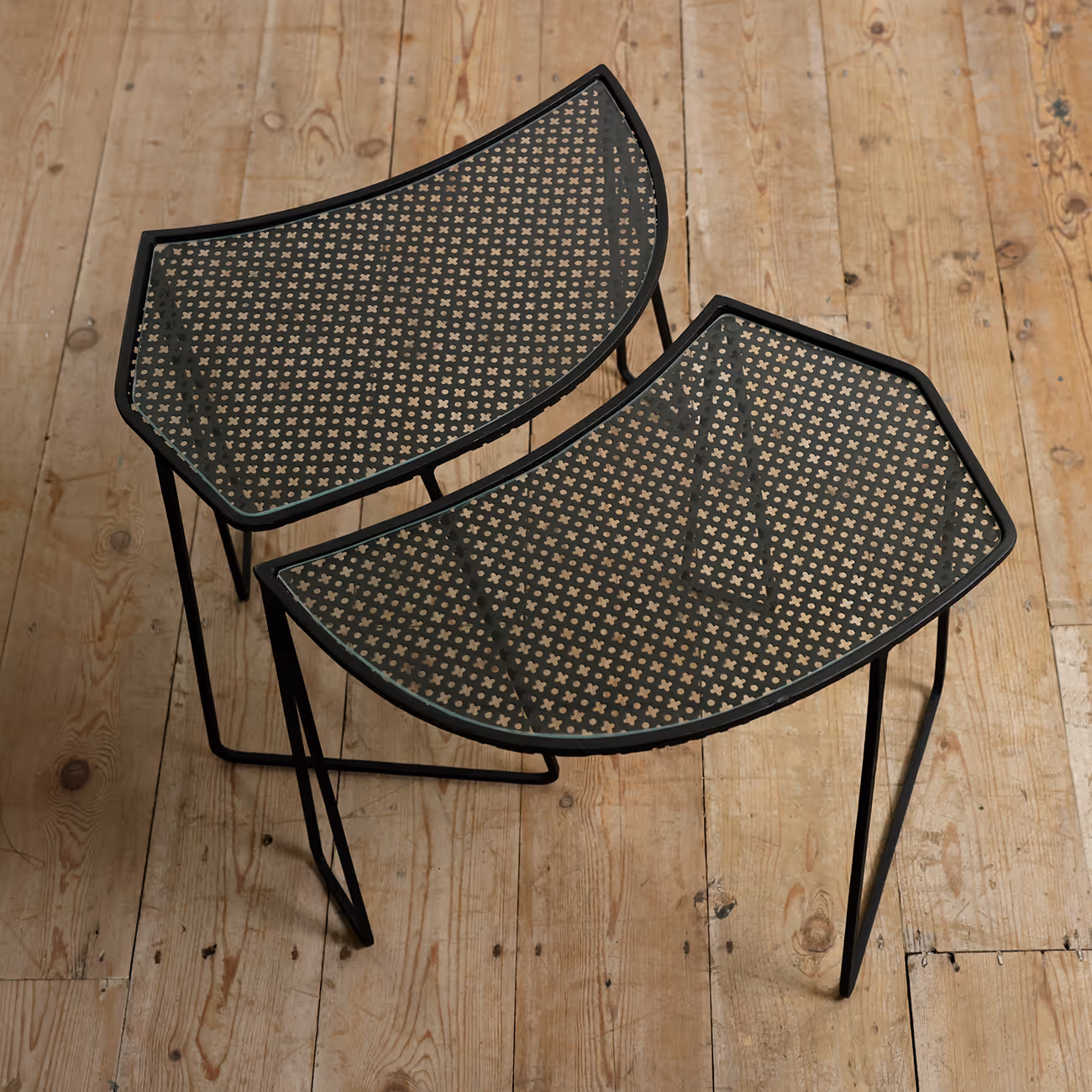 Pair of free-form, black perforated metal side tables in the manner of Mathieu Mategot.