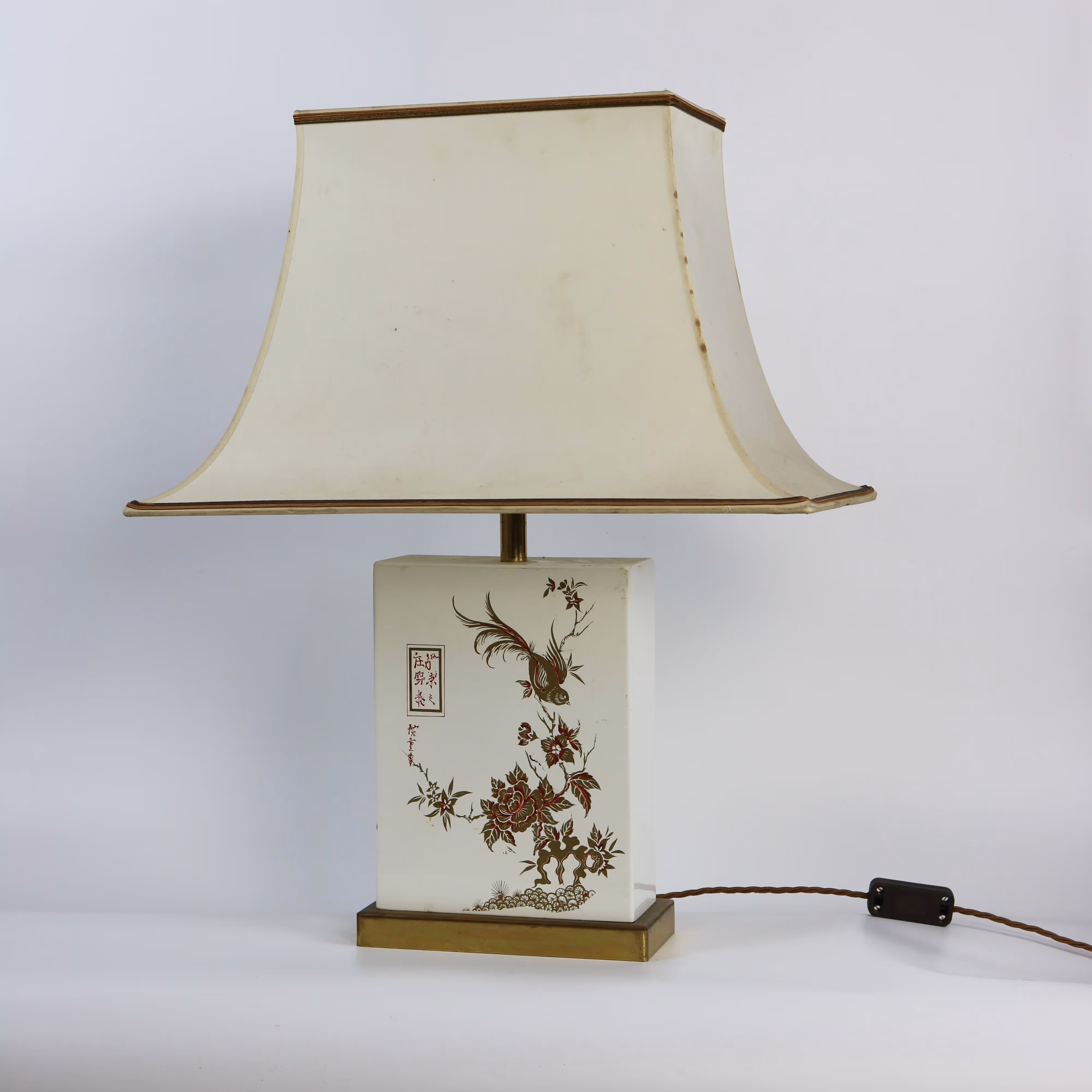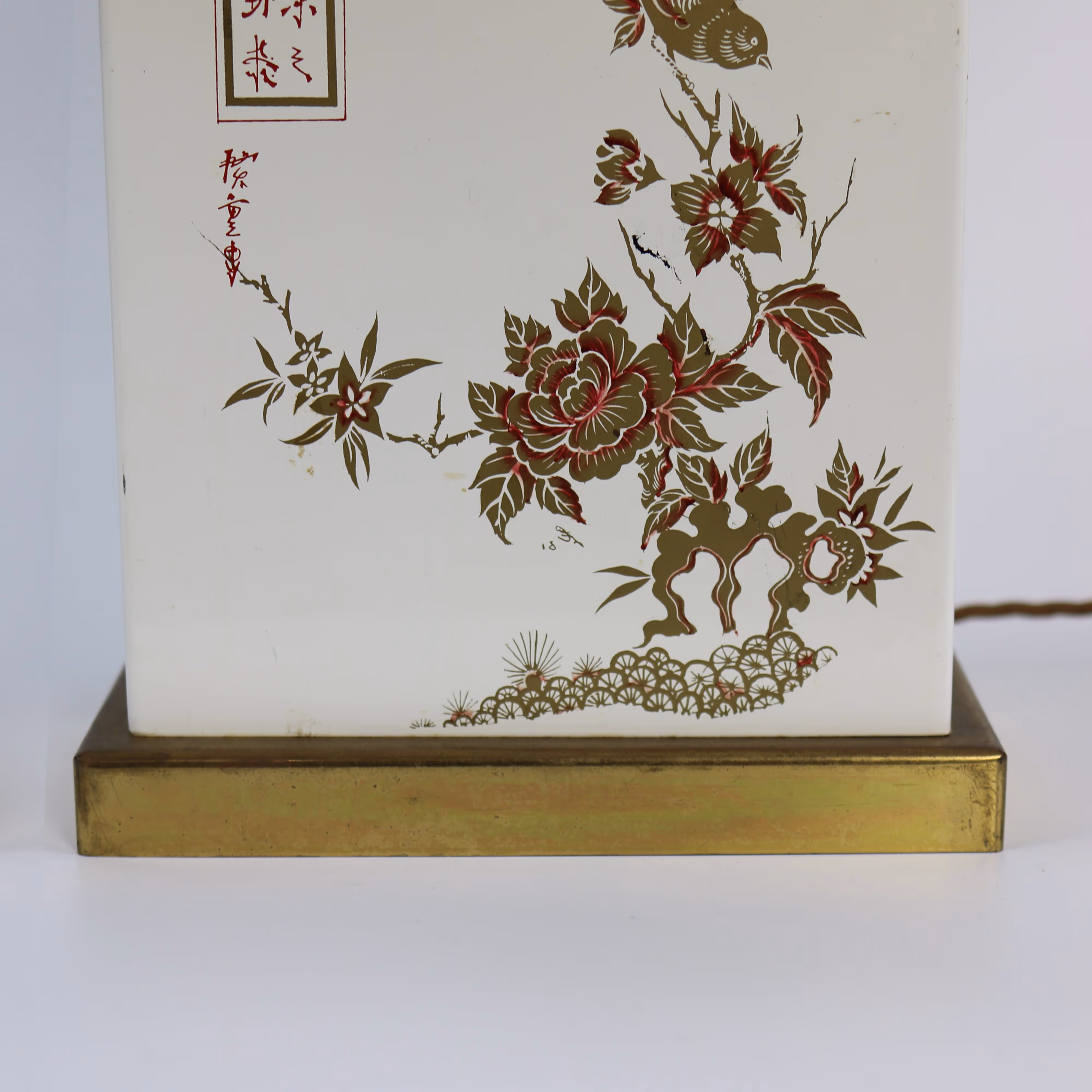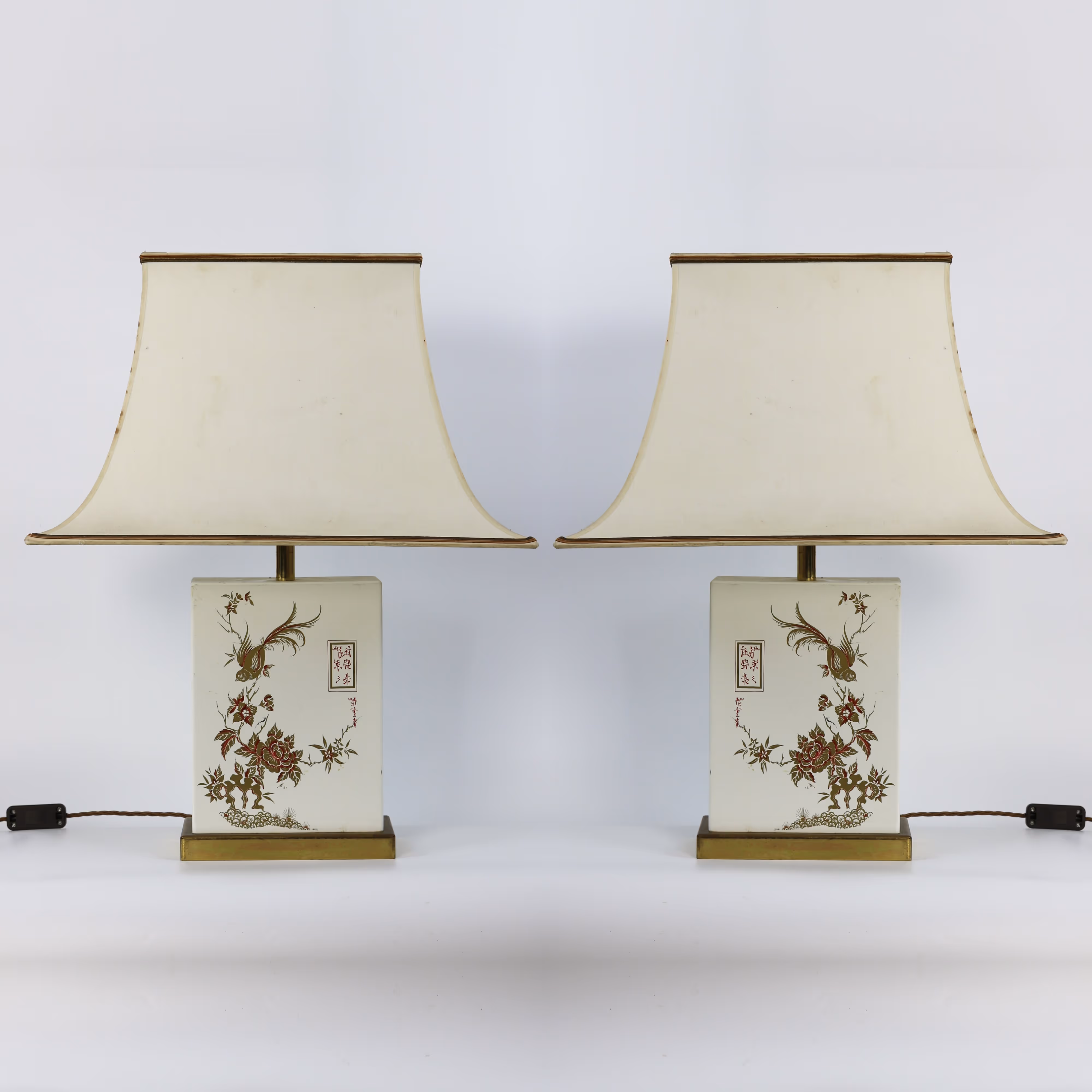 A pair of Chinese-inspired table lamps with enamel bases and pagoda shades Rewired & PAT-certified