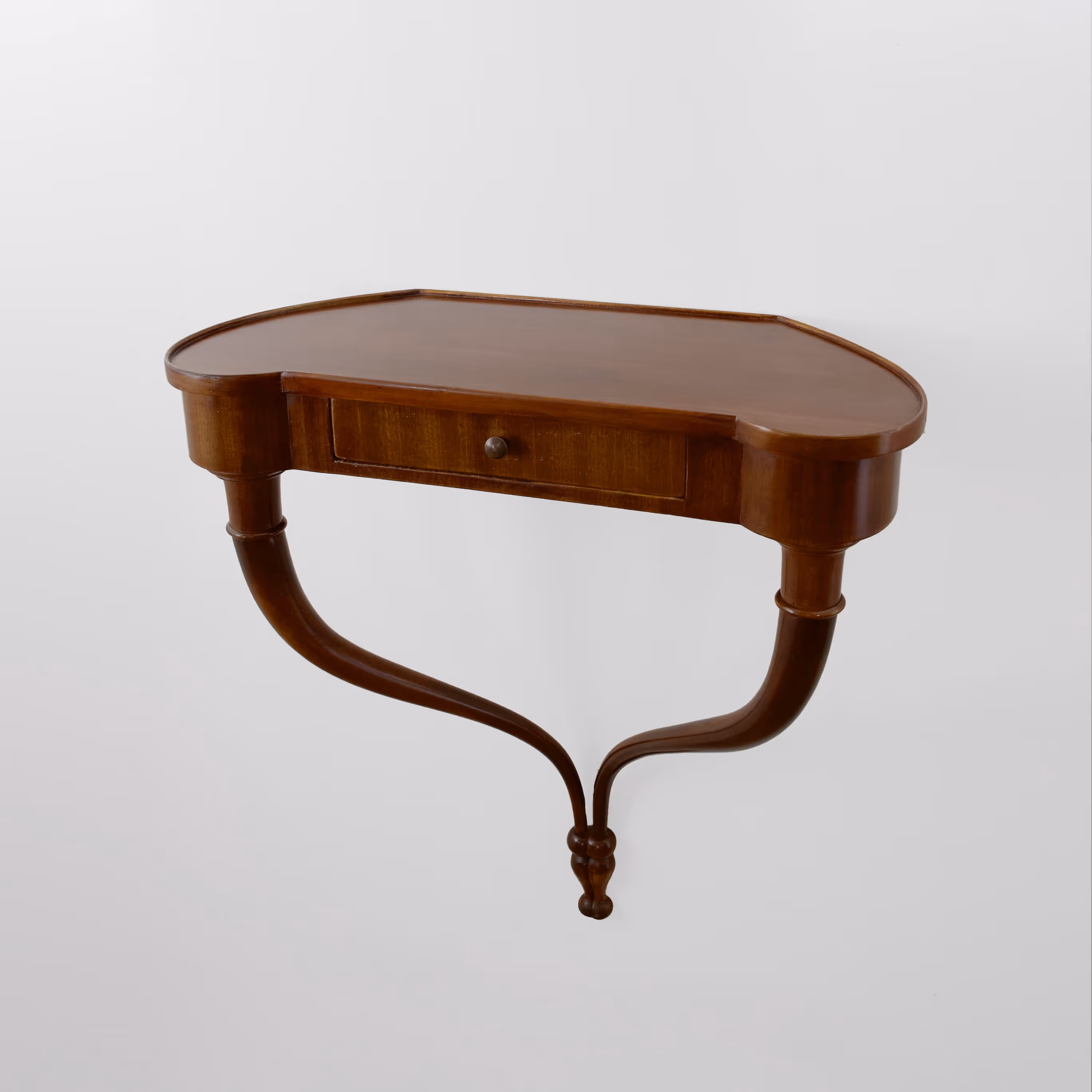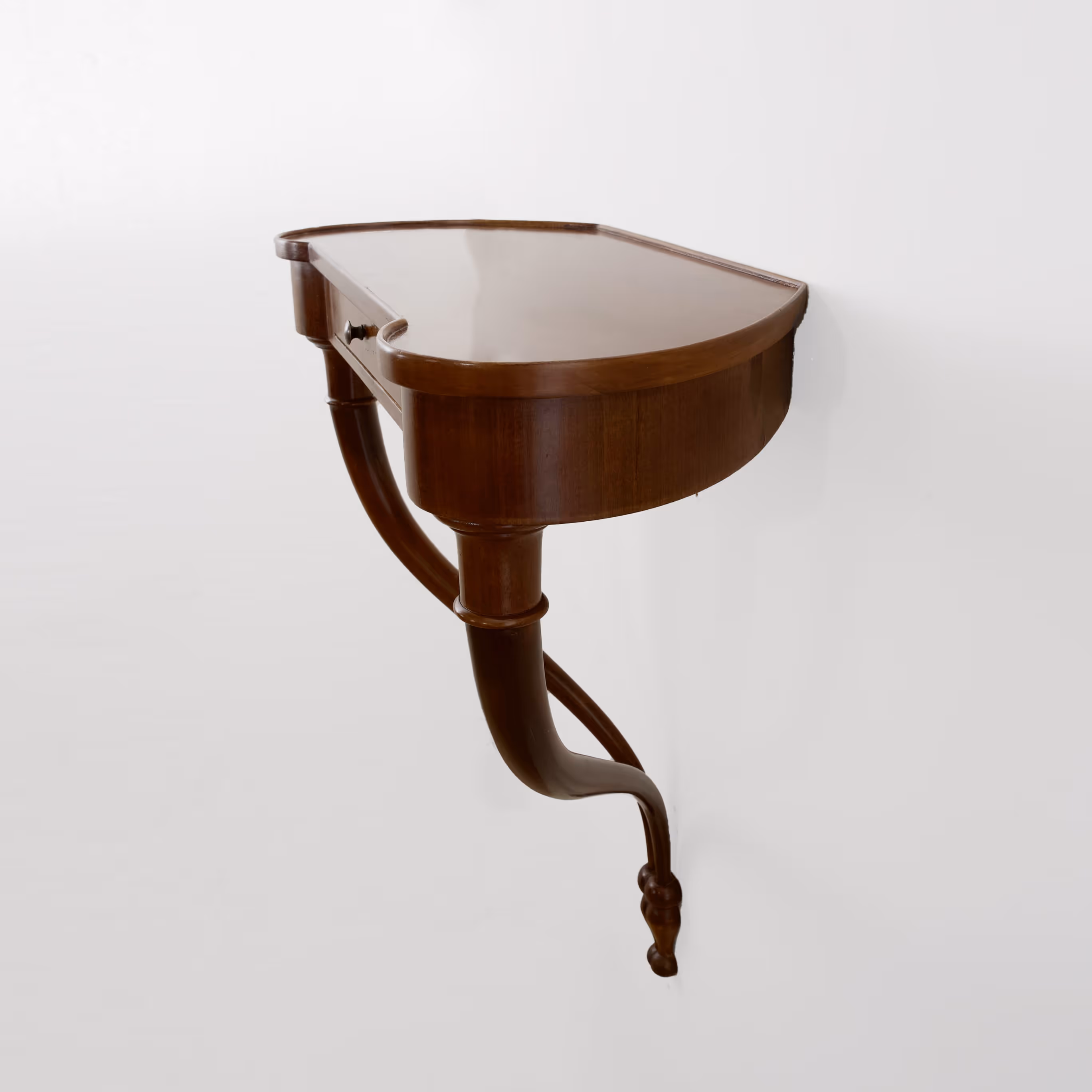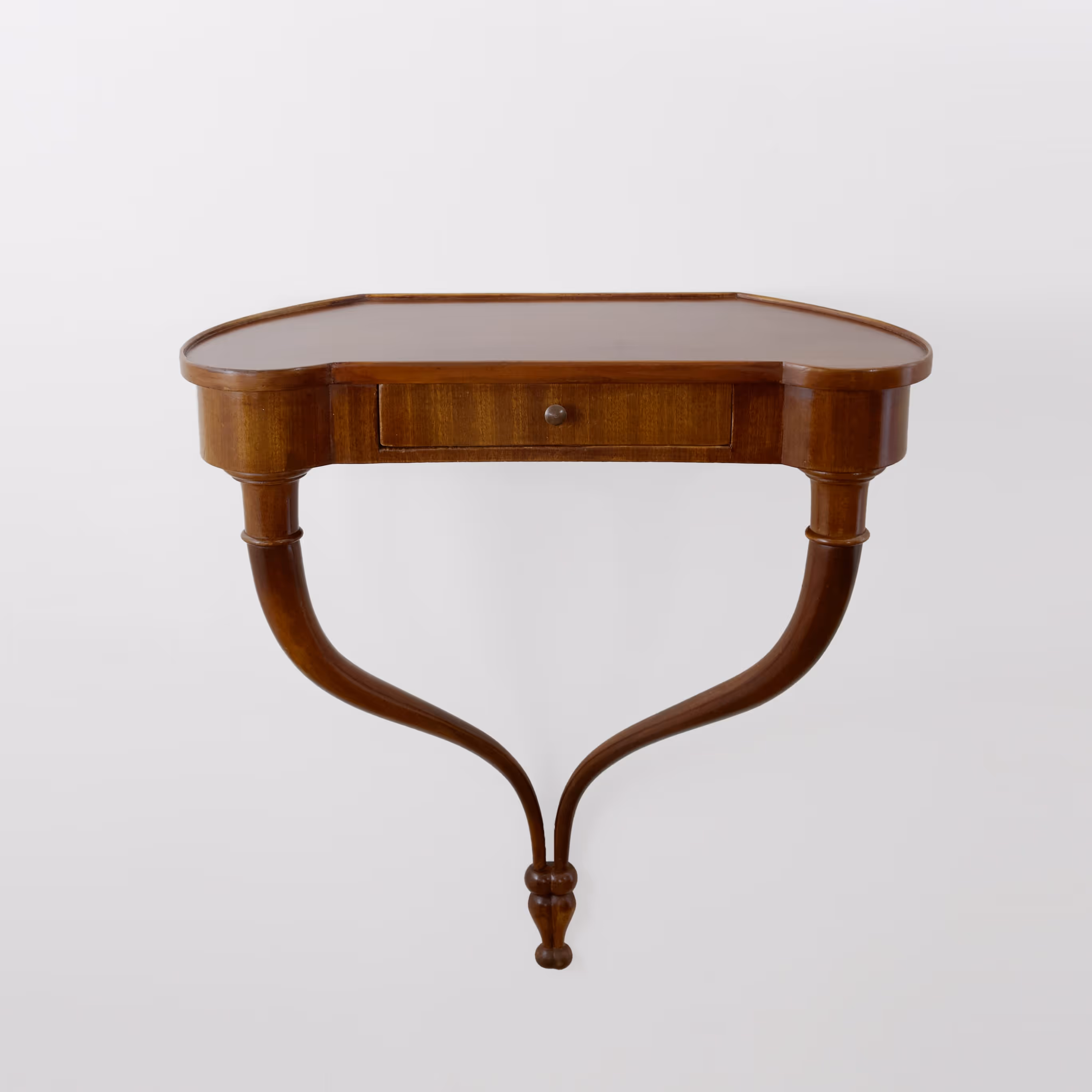 Pair of elegant veneered mahogany bedside tables, each with one drawer. Clever wall-hung design for a minimal footprint.