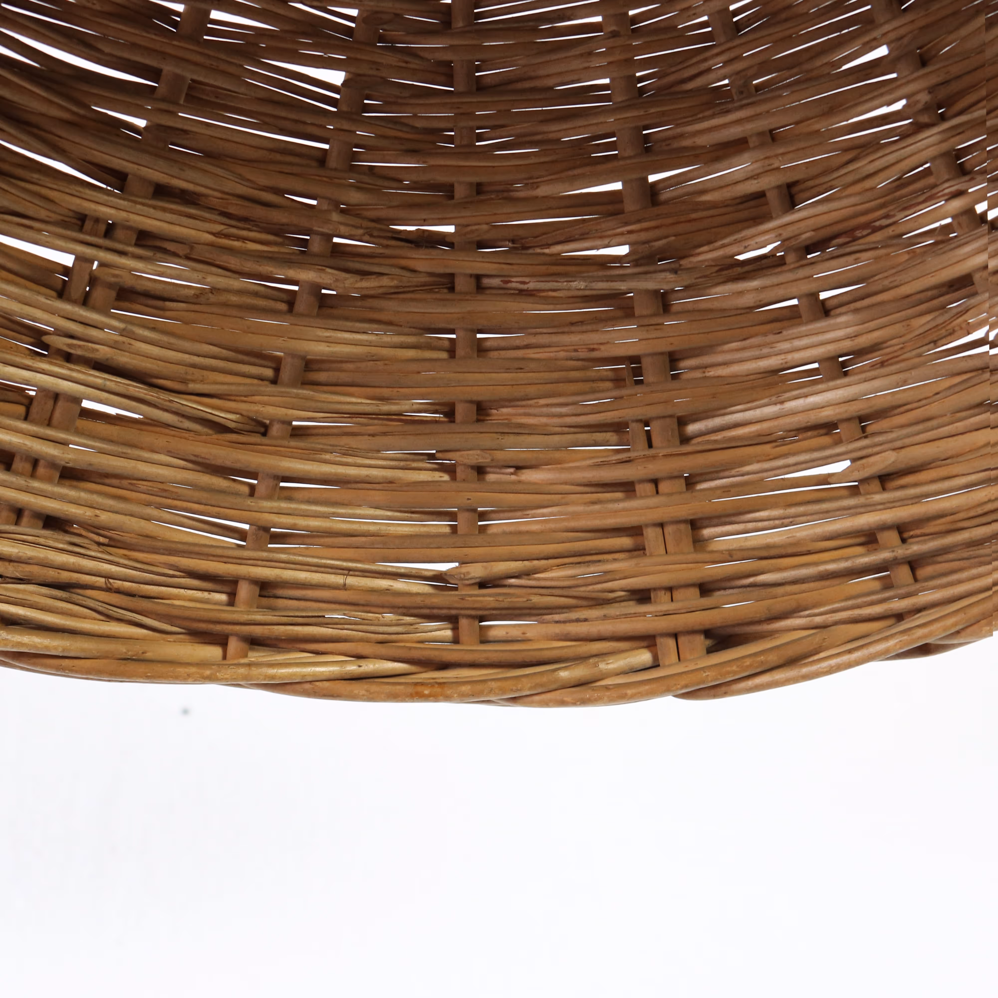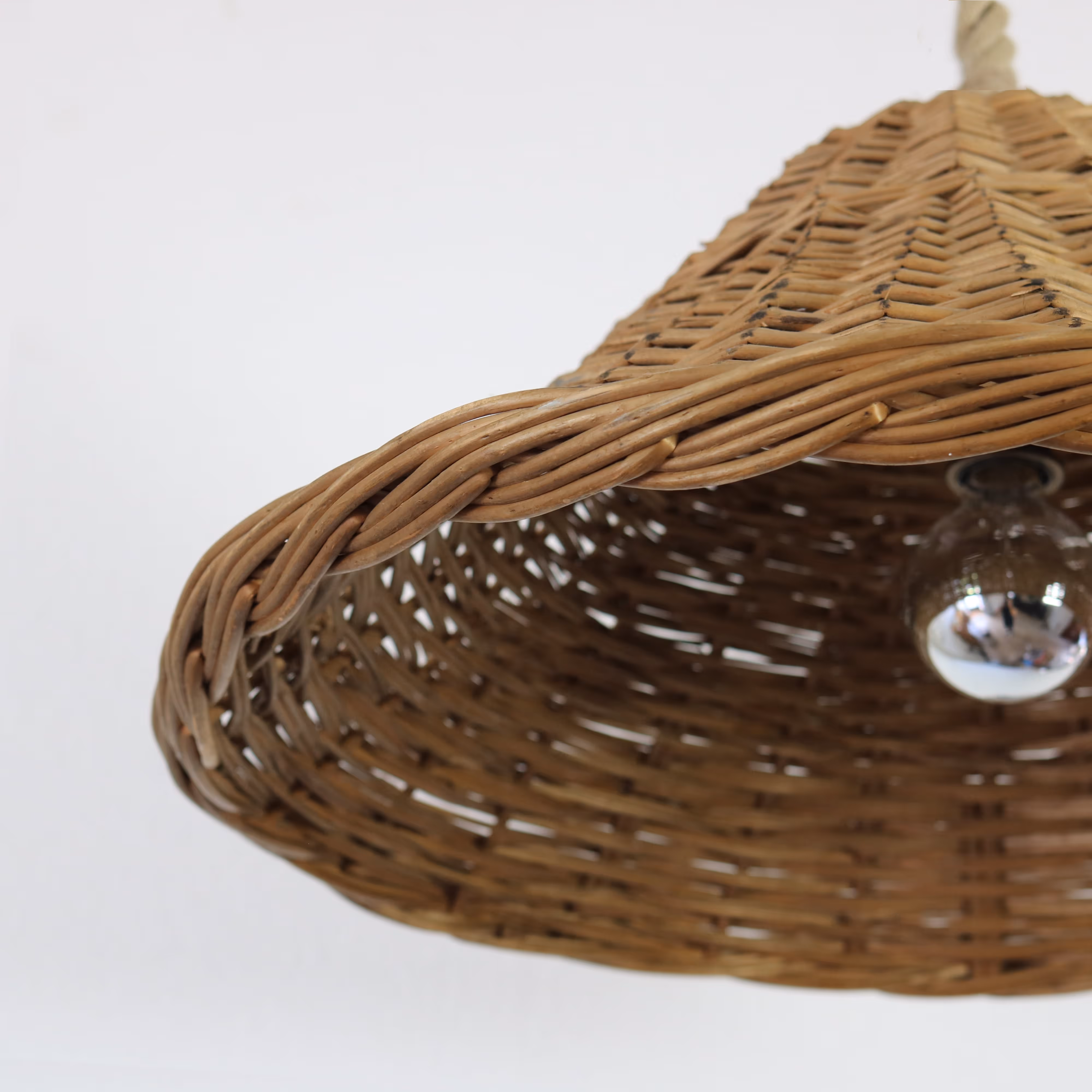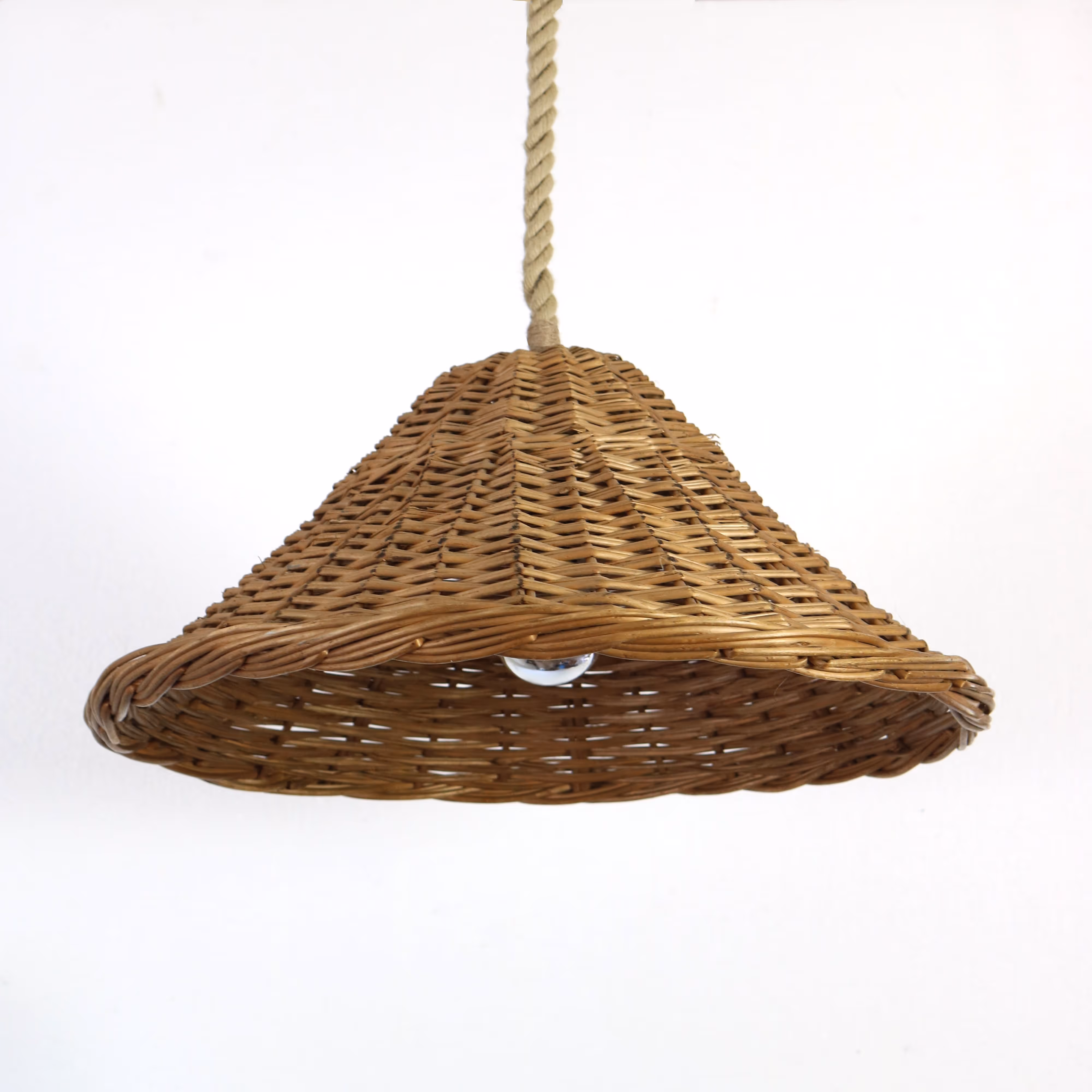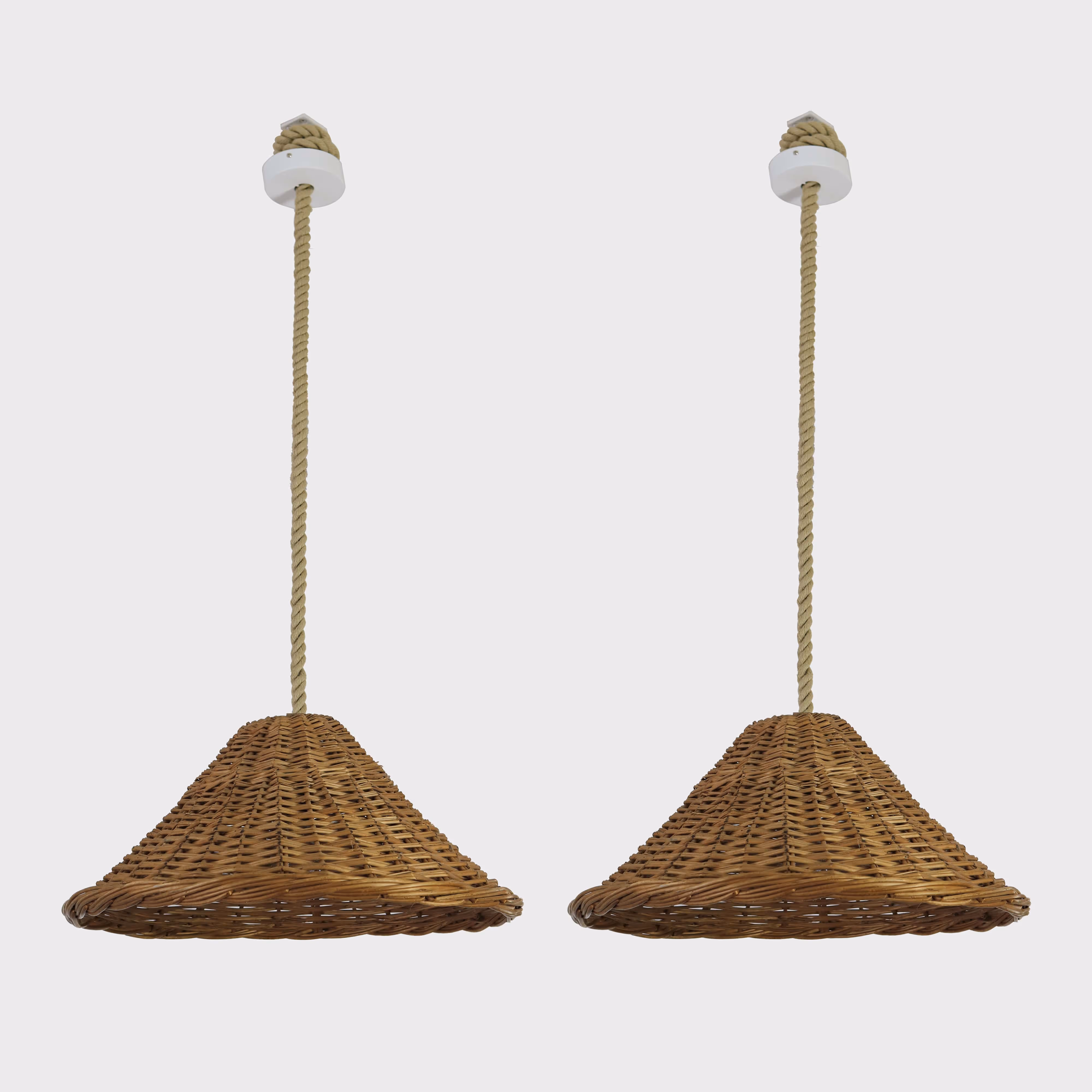 Two conical baskets turned into pendant lights with thick rope fittings (drop adjustable).