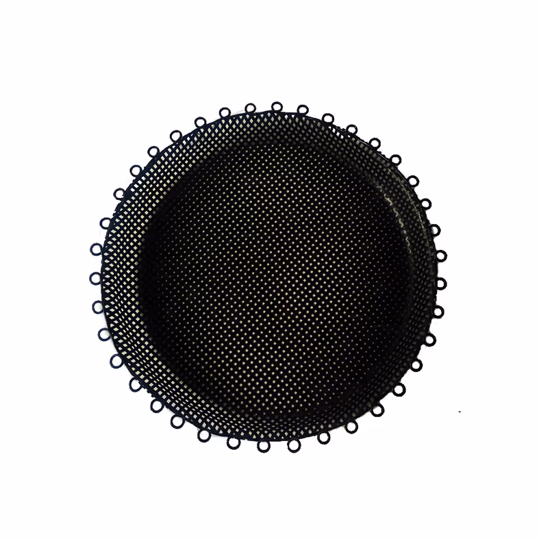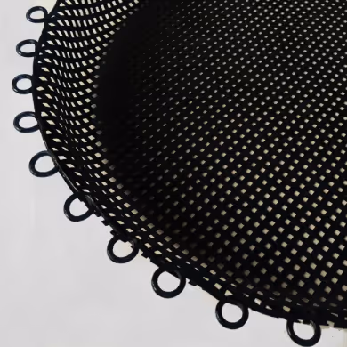 Black circular perforated metal tray, possibly by Mathieu Matégot.
