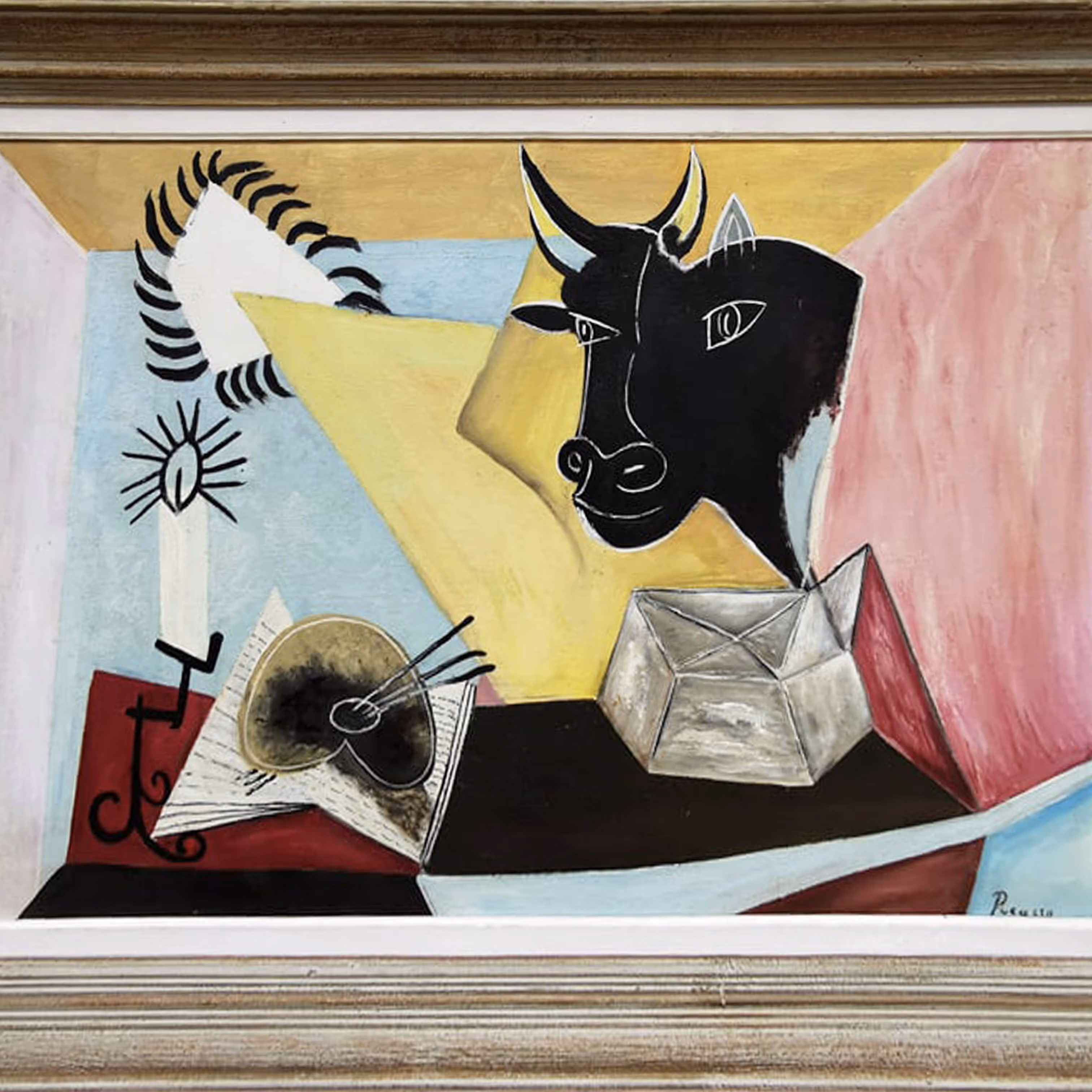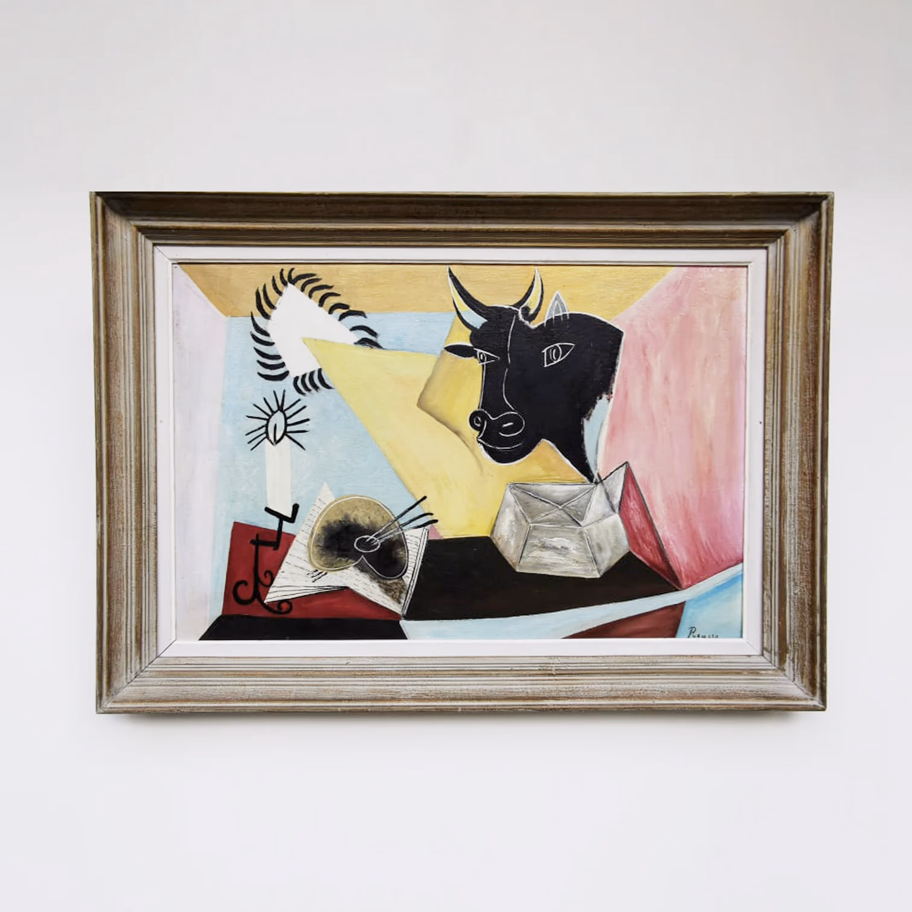 This painting is a 1950s copy of a lesser-known Picasso still life – the original belongs to a series using the same attributes in various colourways.