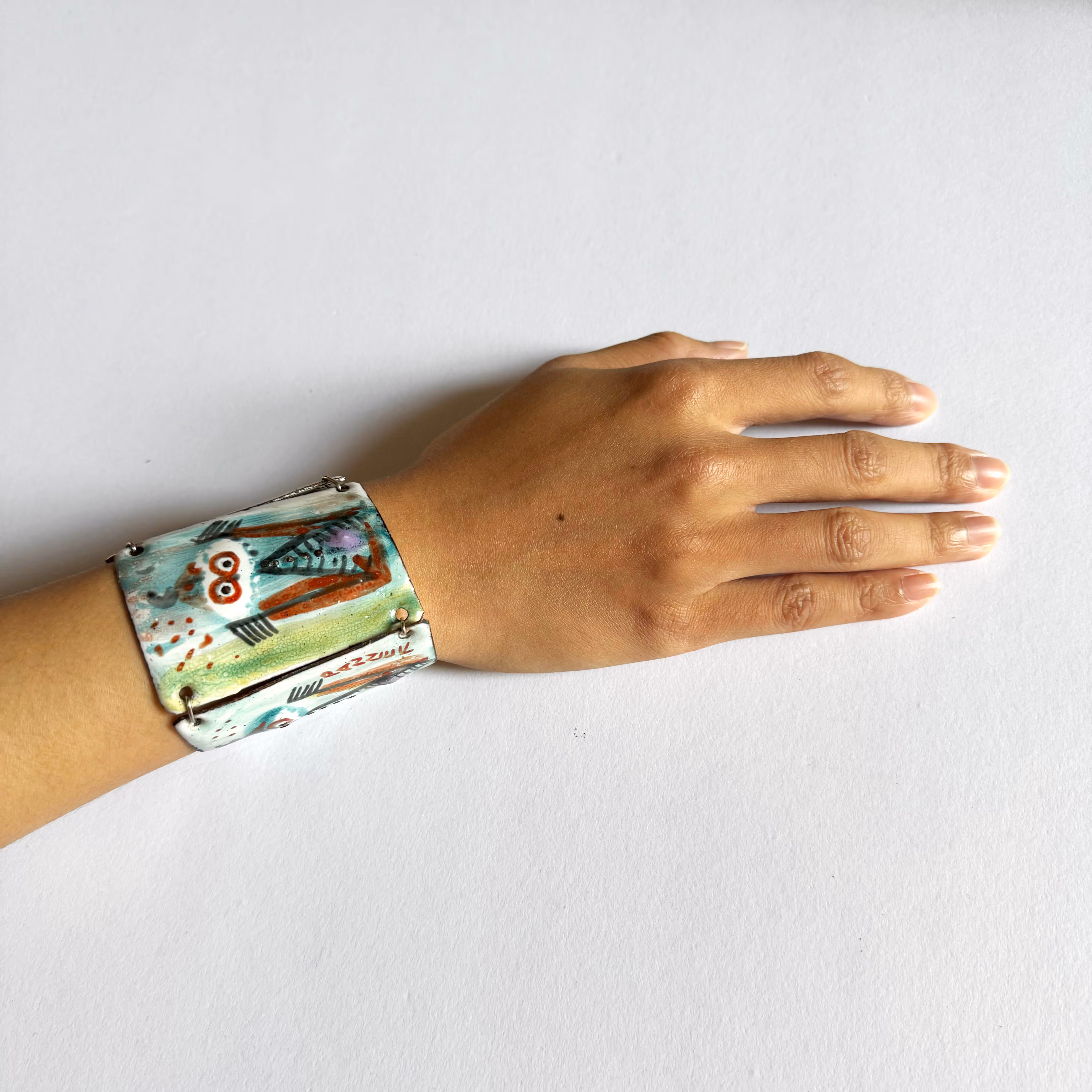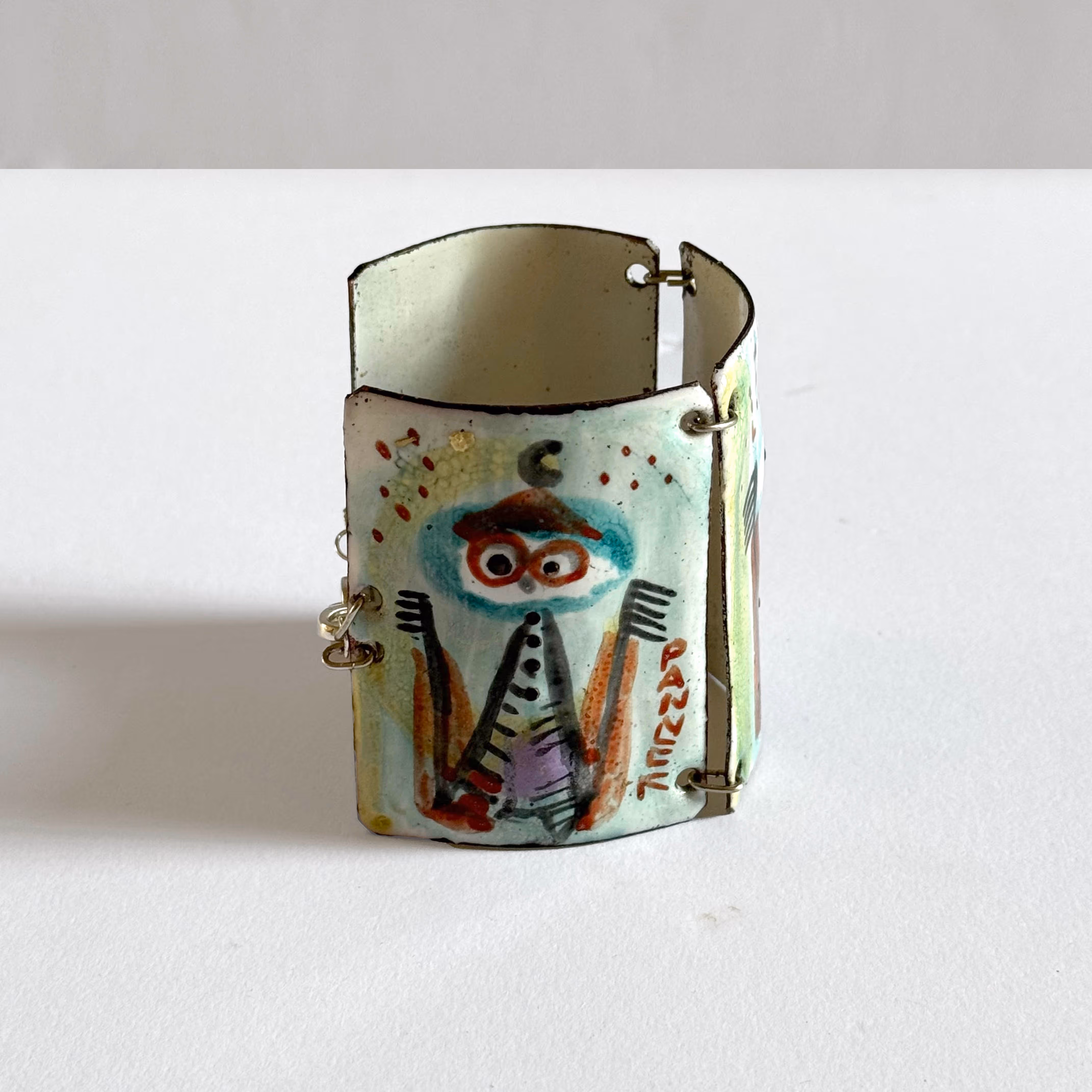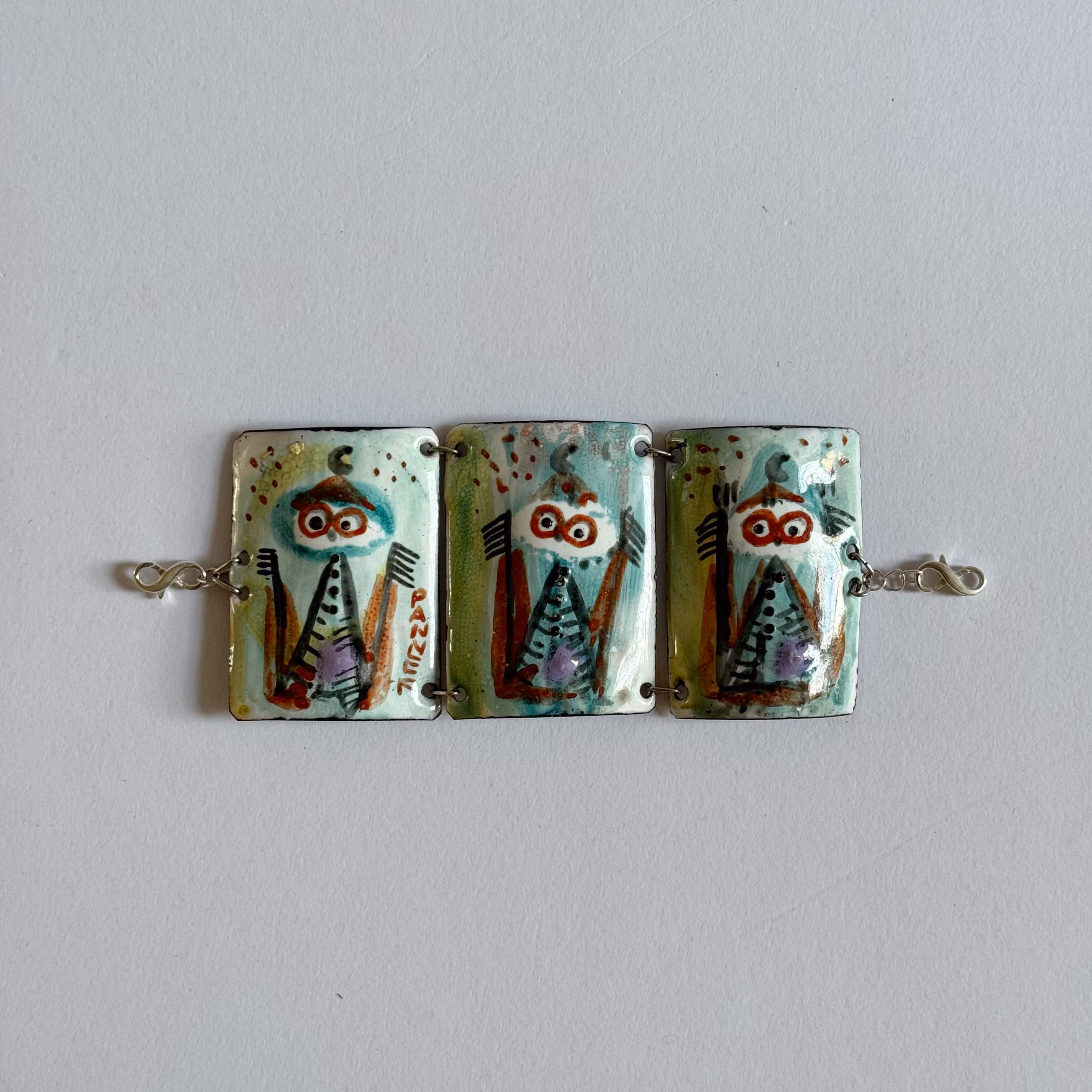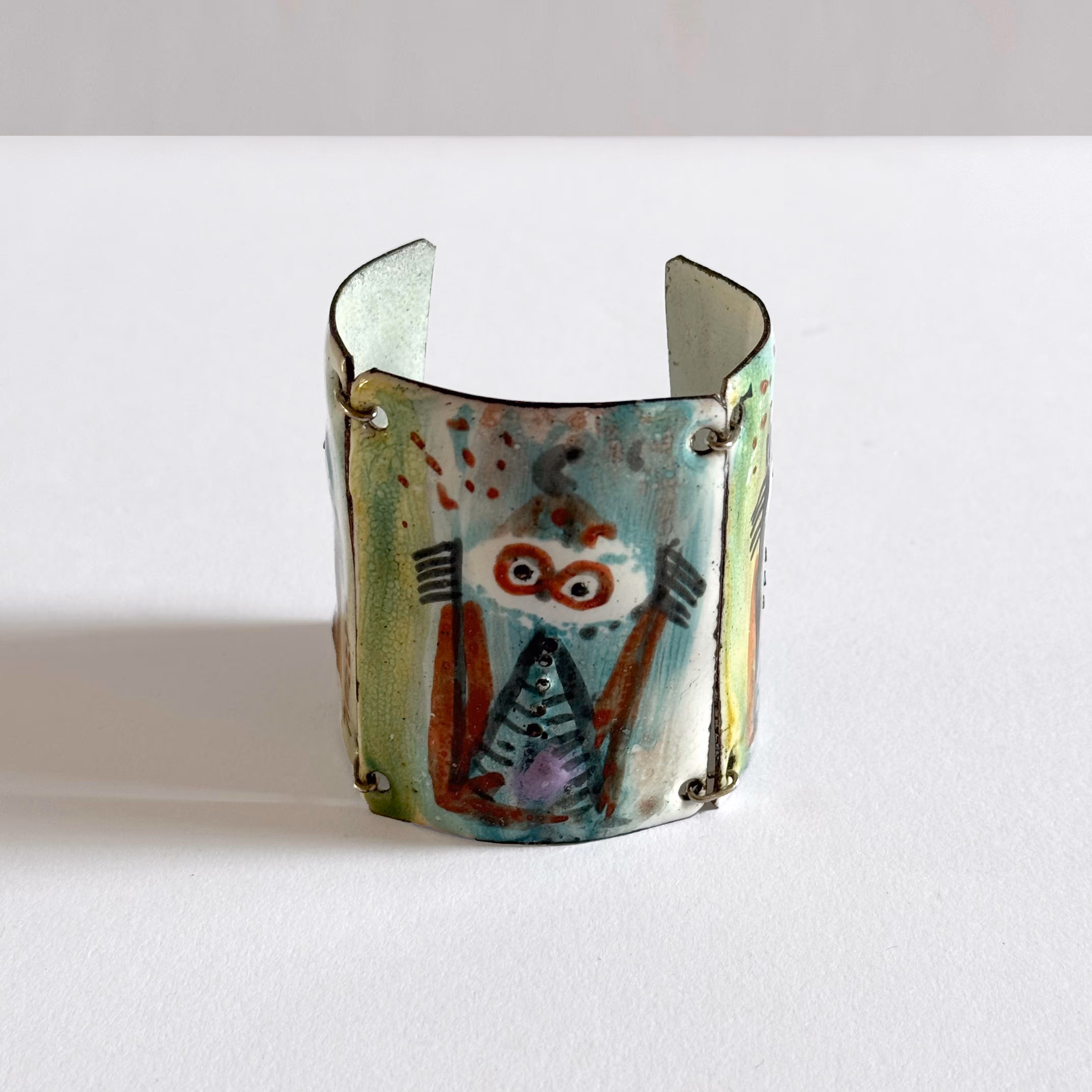A stylish enamel cuff consisting of three copper plaques decorated with owl-like character.