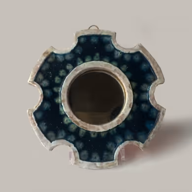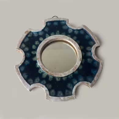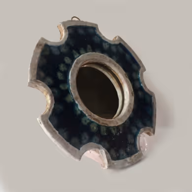 A circular pottery mirror with scalloped edge and azure glaze