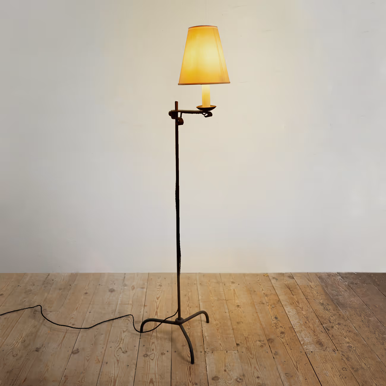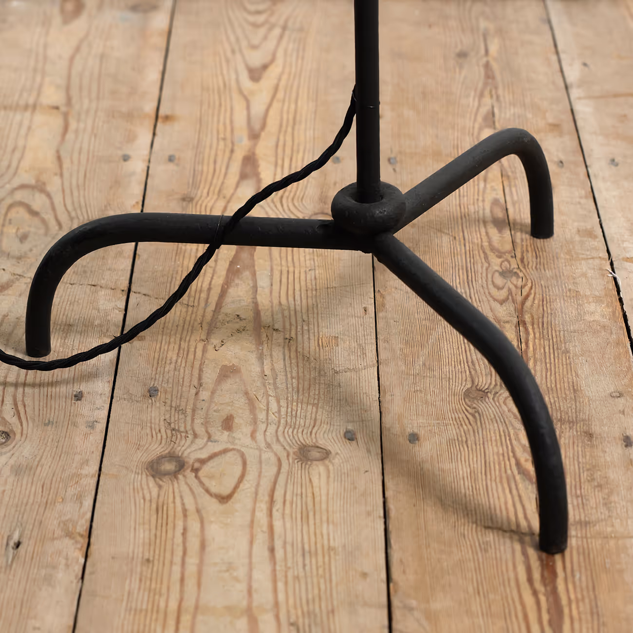 Black steel floor lamp with adjustable-height, reading arm. Tripod base.
