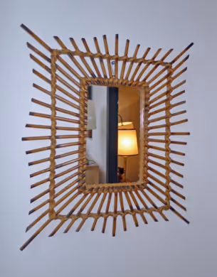 A rectangular cane mirror with small mirror plate surrounded by sunburst design