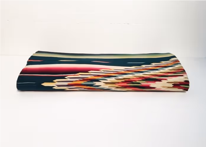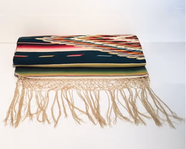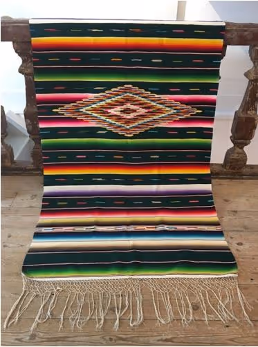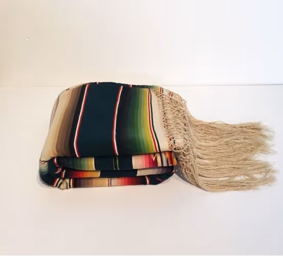 A brightly coloured wool serape (man's shawl) with delicate jacquard stripes, diamond design and and long fringing