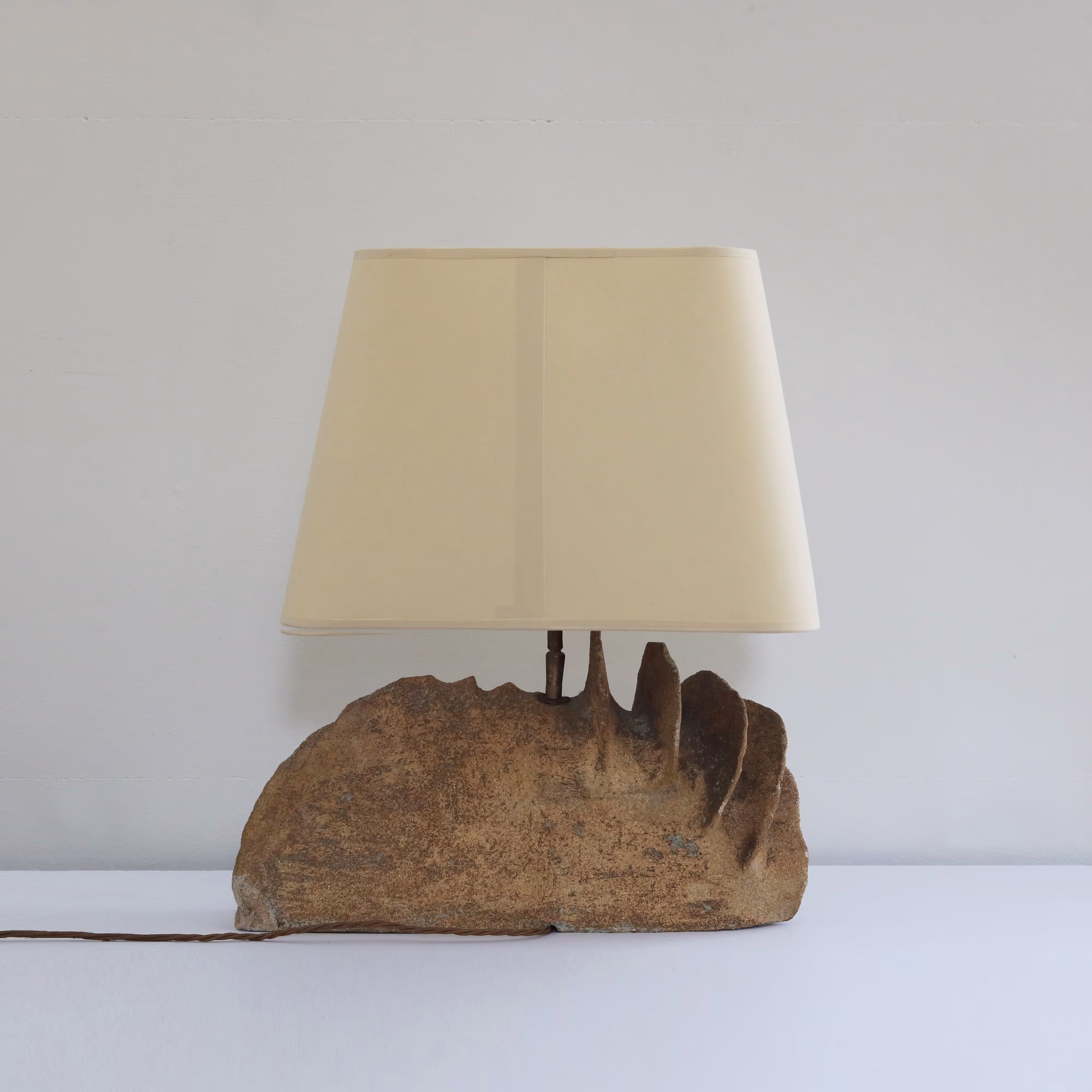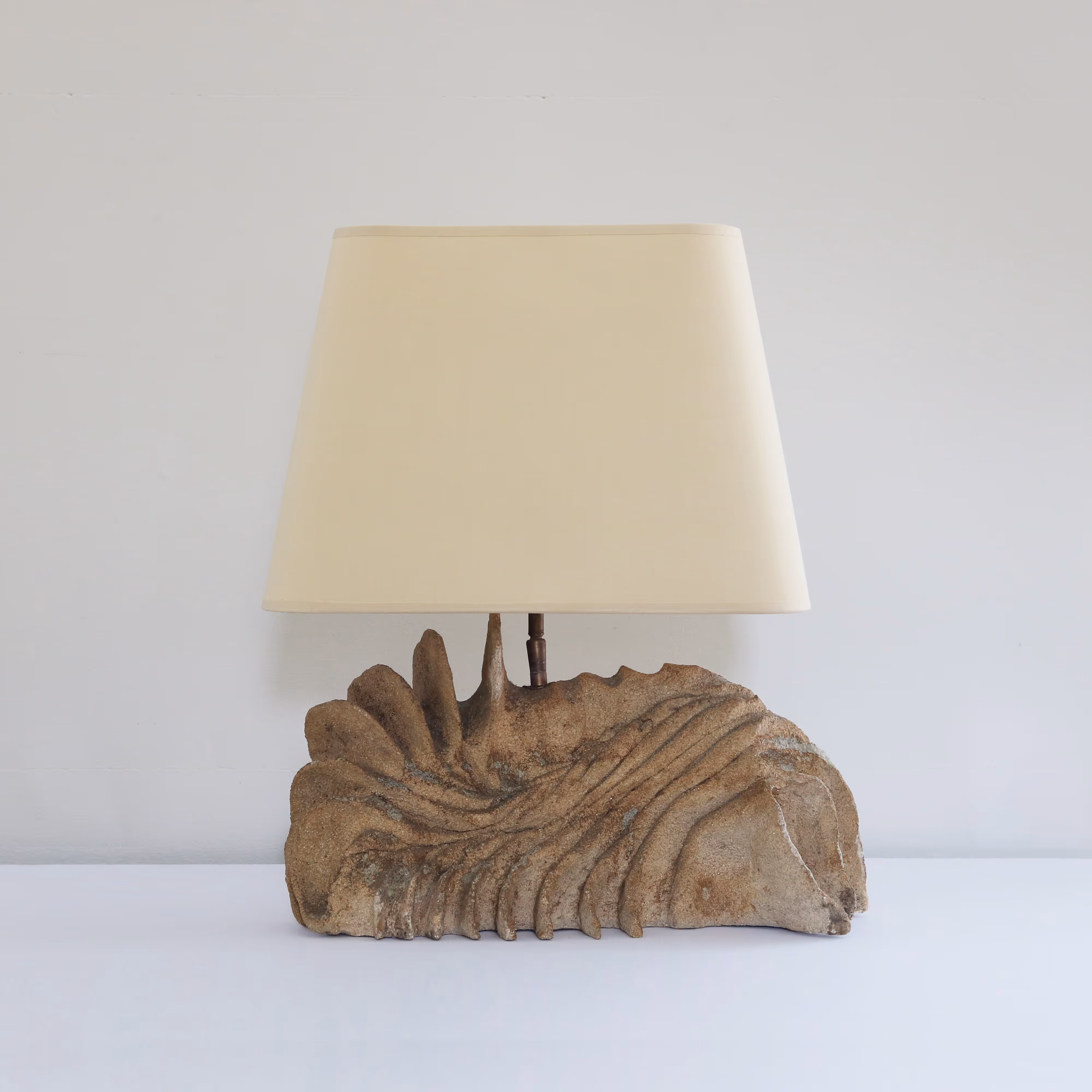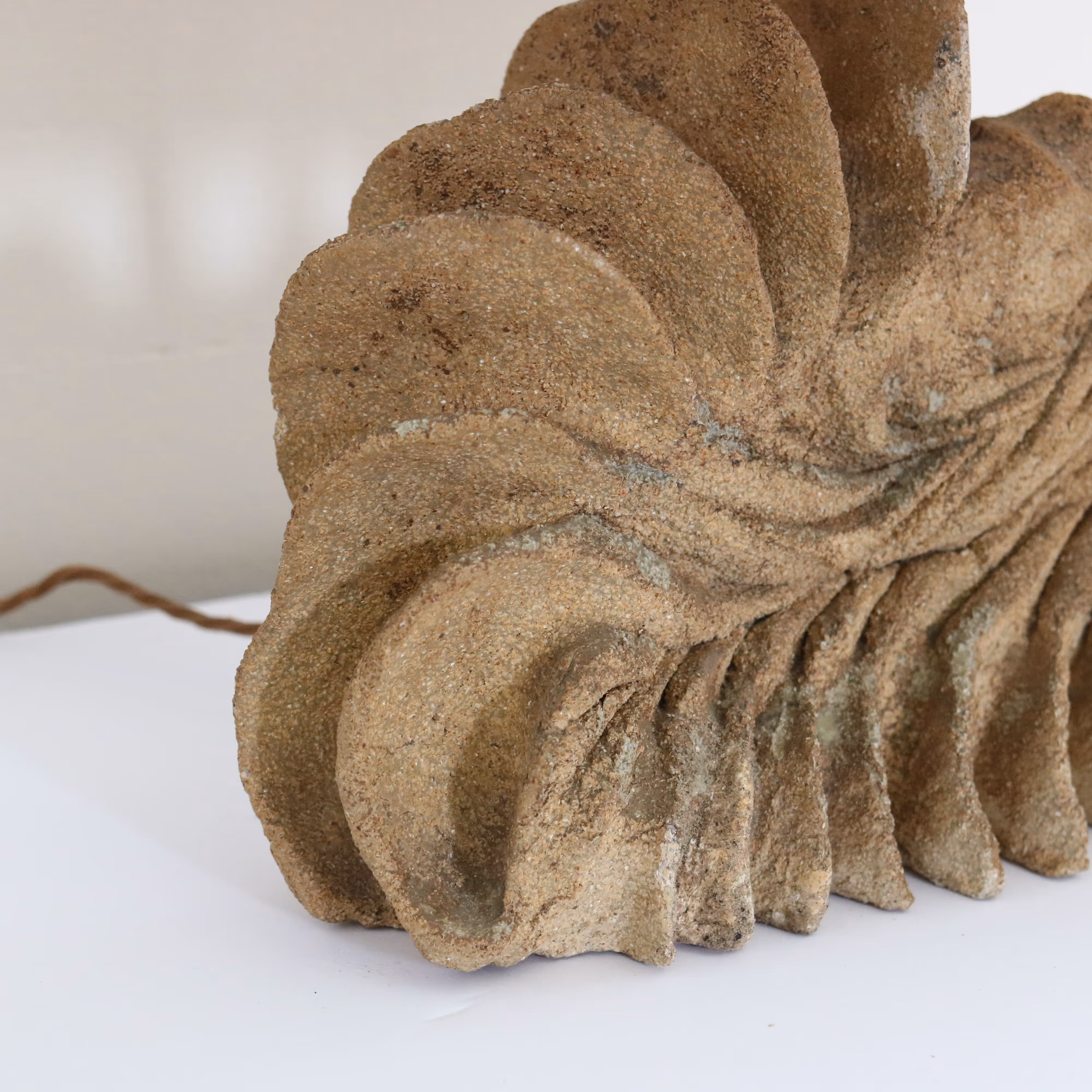 An unusual, artist-made table lamp, the shape of the base reminiscent of an amonite. Handbuilt sandstone.