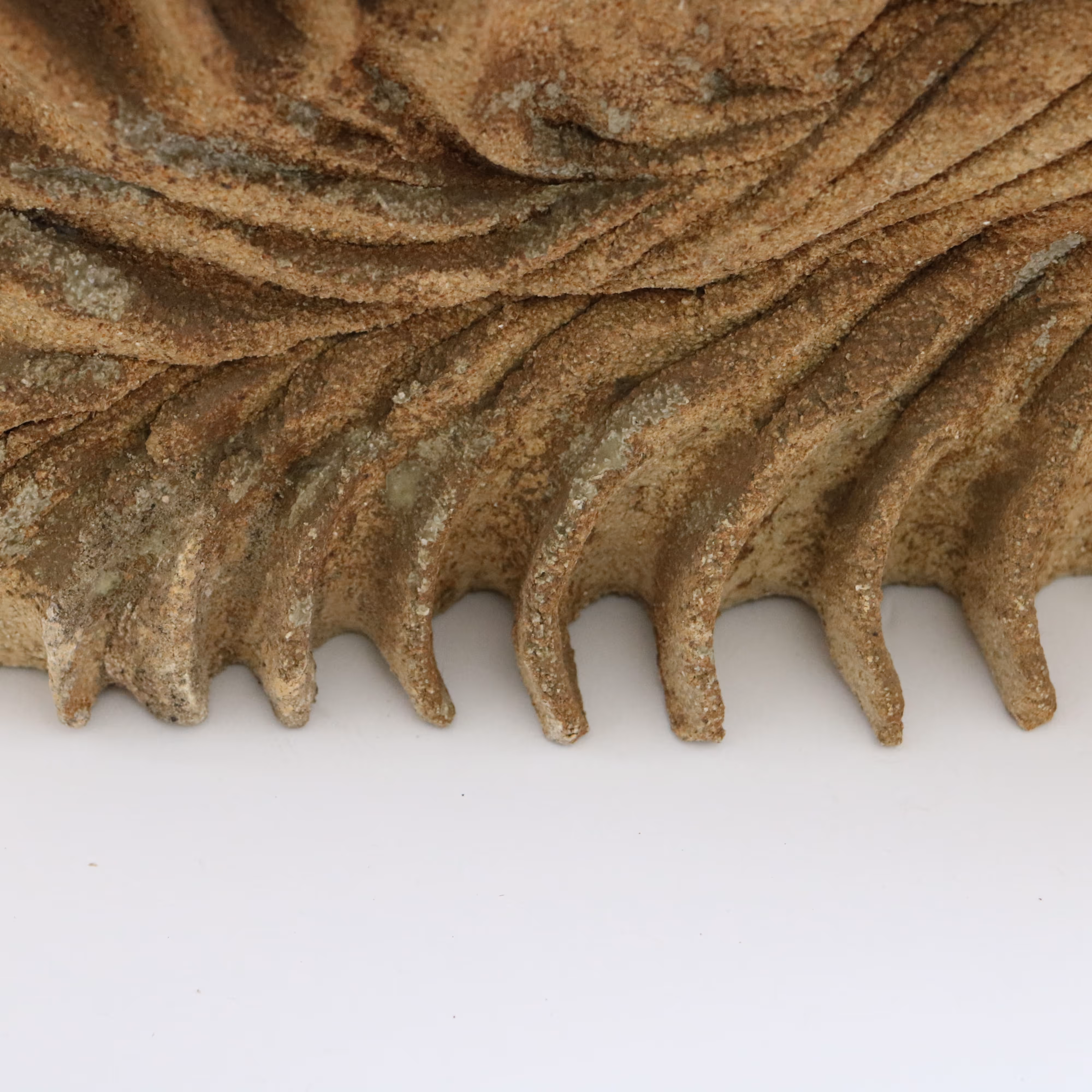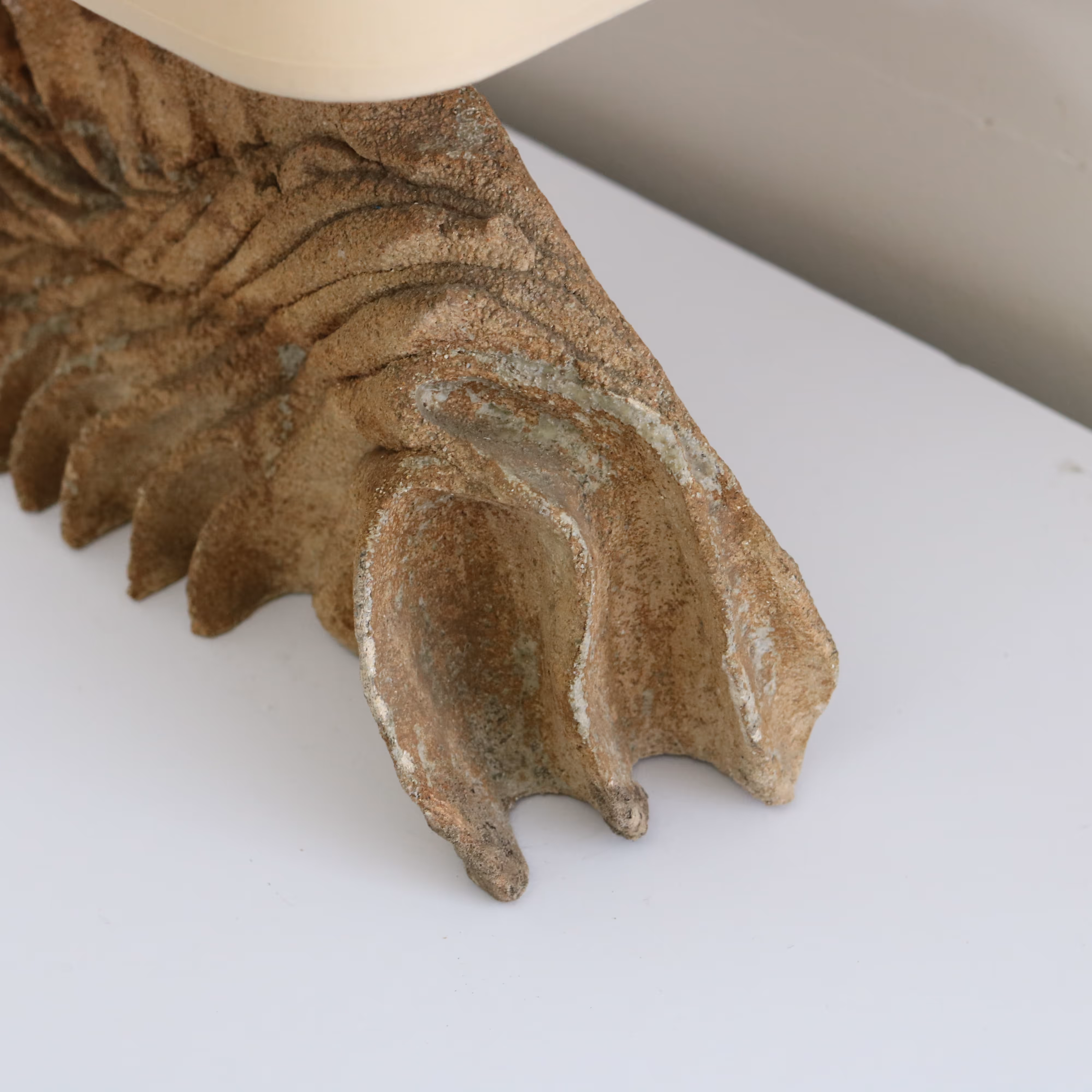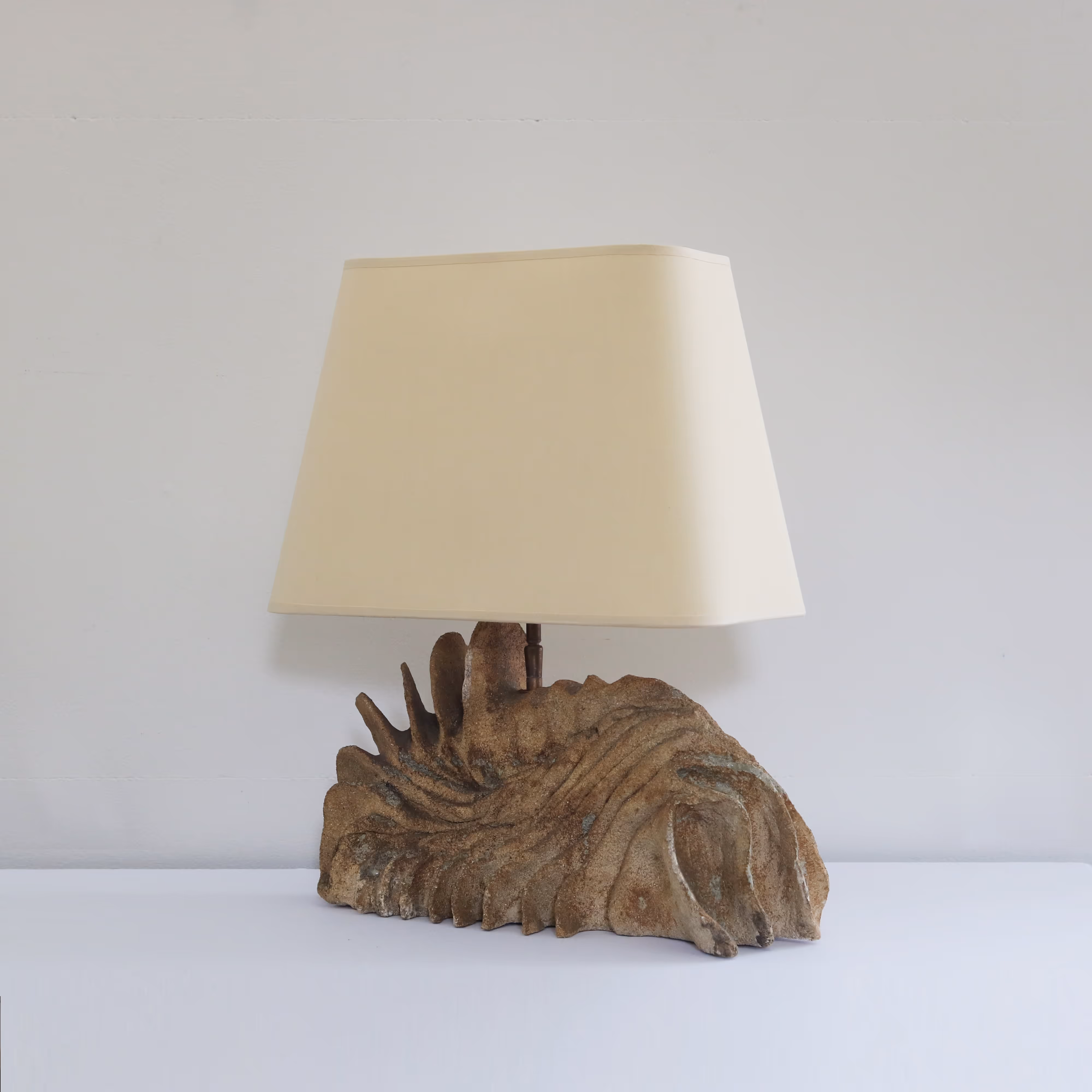 An unusual, artist-made table lamp, the shape of the base reminiscent of an amonite. Handbuilt sandstone.