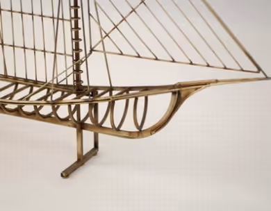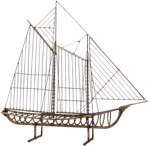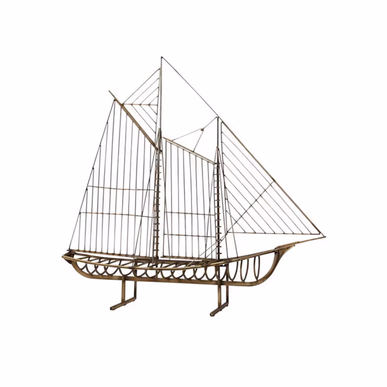 A freestanding sculpture of a ship by American duo Curtis Jere. Welded brass. Signed '© C Jere 1976' . Excellent condition
