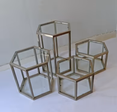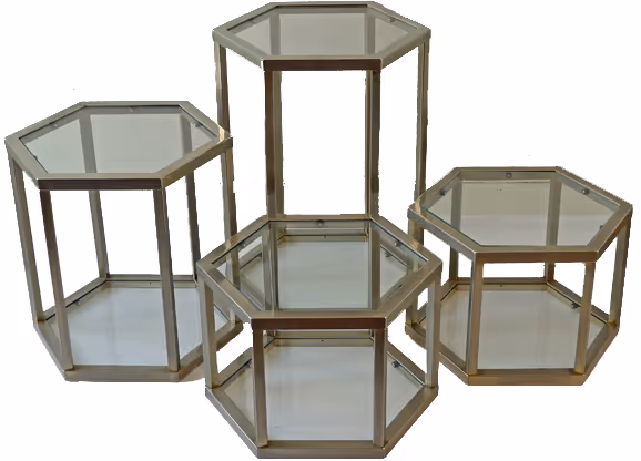 A set of 4 hexagonal side tables of graduated heights. Nickel plated frames and clear glass inserts at top and bottom. Originally display elements for Christofle shop in Paris, possibly designed by David Hicks