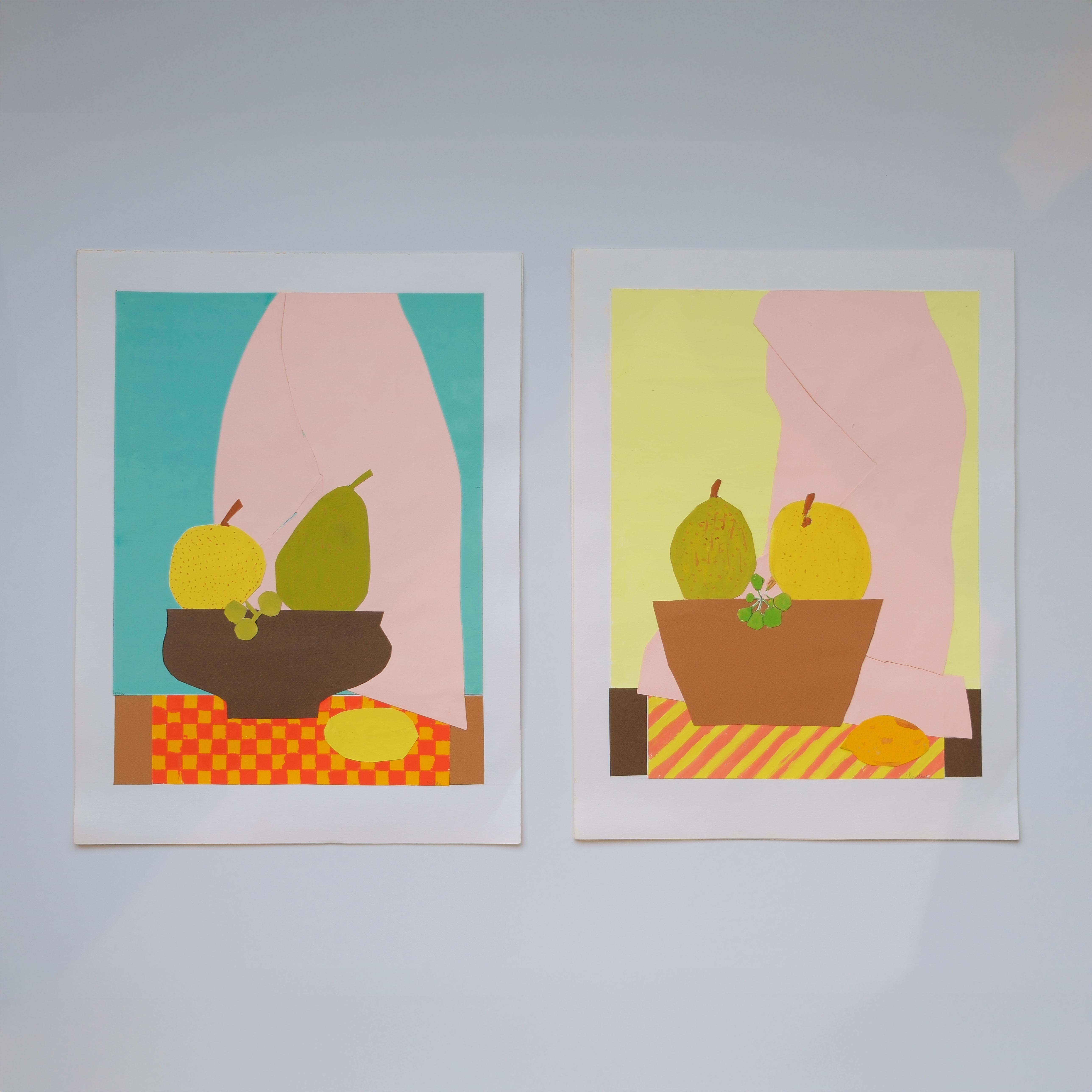 A set of 9x collages representing still lives of fruits in a bowl on a checked table cloth. Colour paper enhanced with gouache, sold unframed.