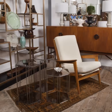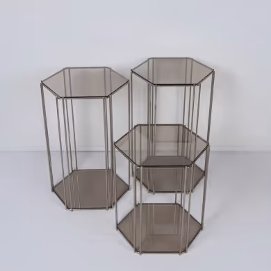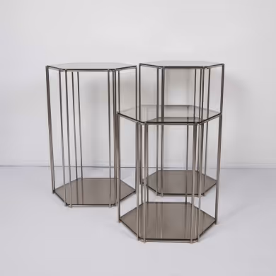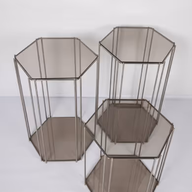 A set of 3 hexagonal chrome side tables with original glass by Max Sauze