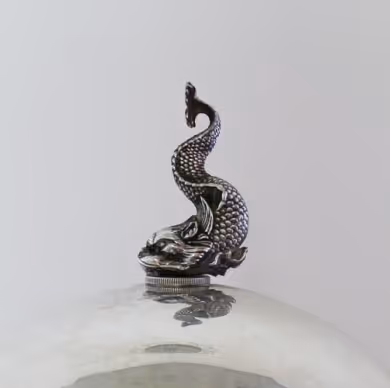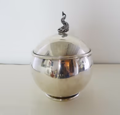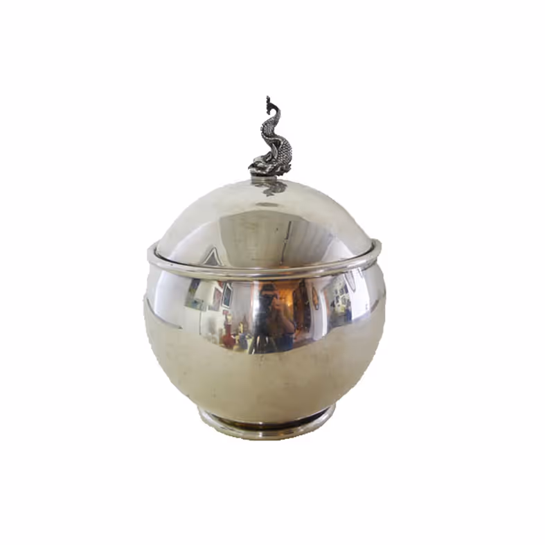 A silver plated ice bucket with dolphin pull, complete with original mouth-blown, mercury glass liner. By 'Thermid'.