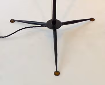 A small standard lamp in black powder-coated metal with brass details, tripod base. Rewired and PAT-tested; bespoke silk shade.