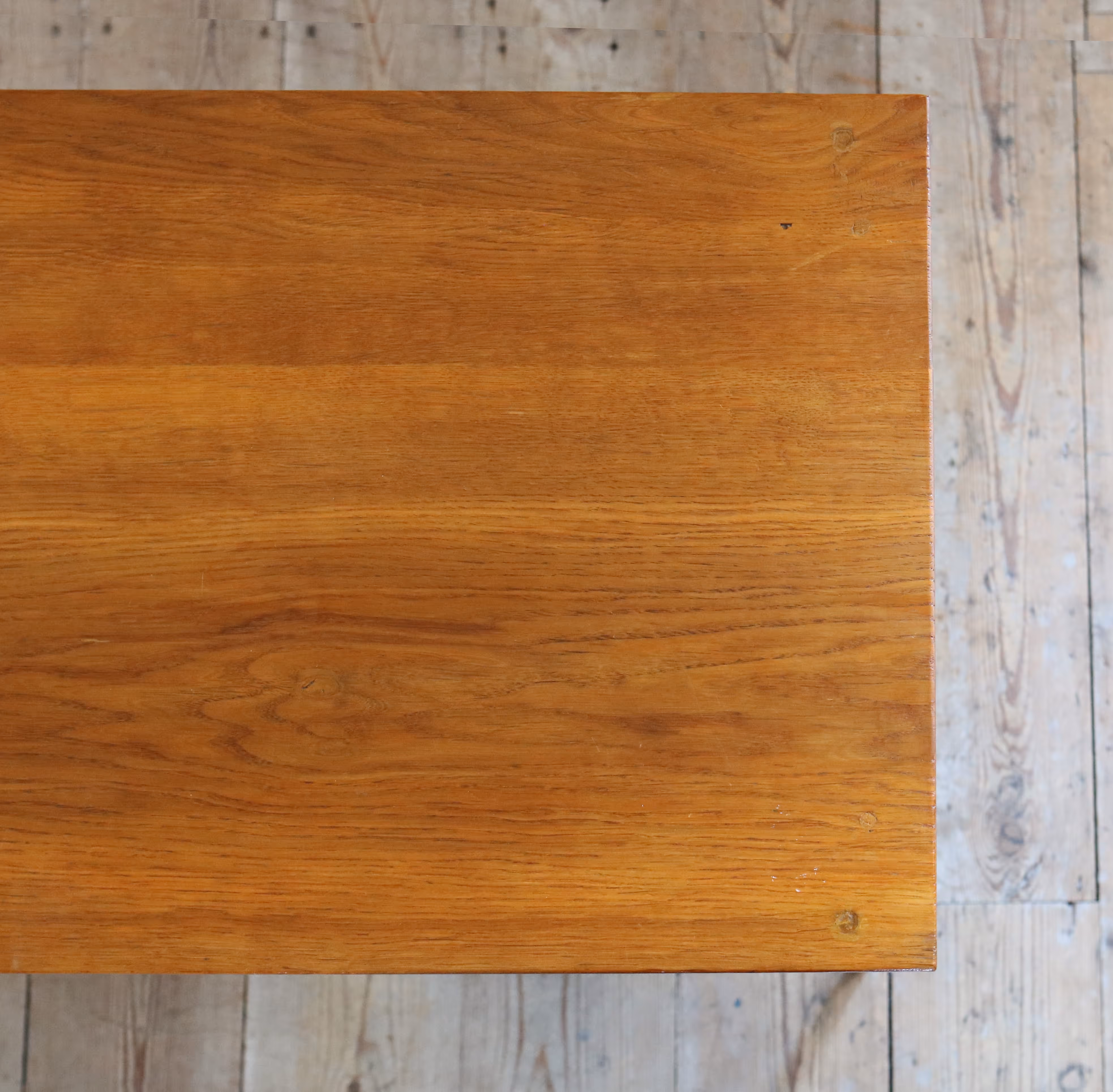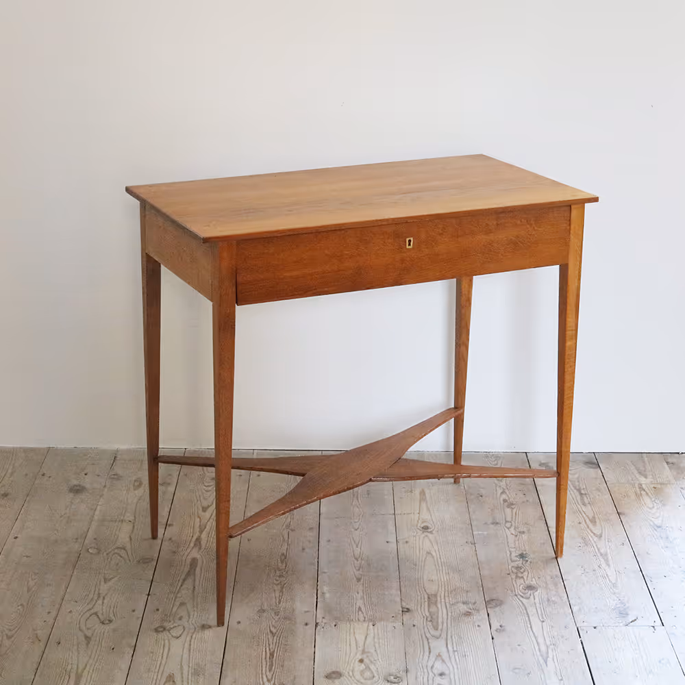 Elegant writing table with one drawer, tapered legs and unusual stretcher. Solid oak.