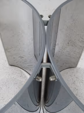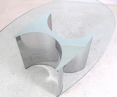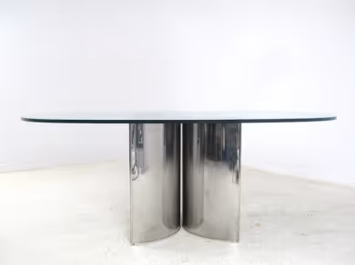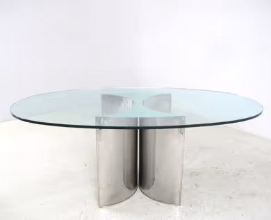 Oval dining table with two semi-circular brushed steel panels as the base, and a glass top with reflective film that echoes the shape of the base.