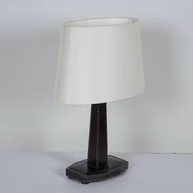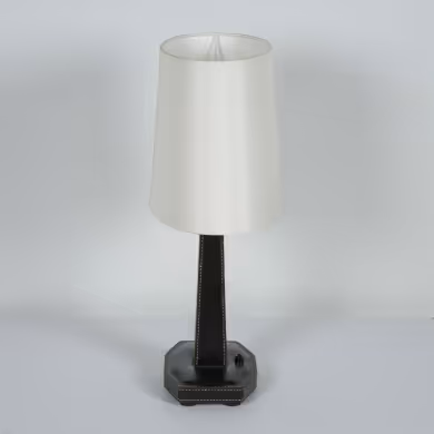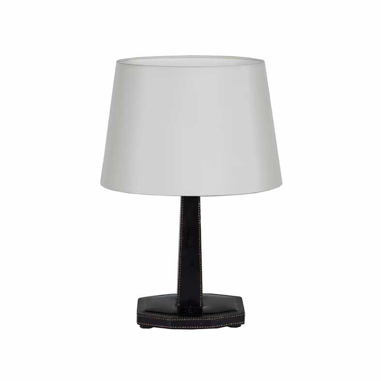 A black stitched leather table lamp in the manner of Jacques Adnet. Re-wired & PAT-certified