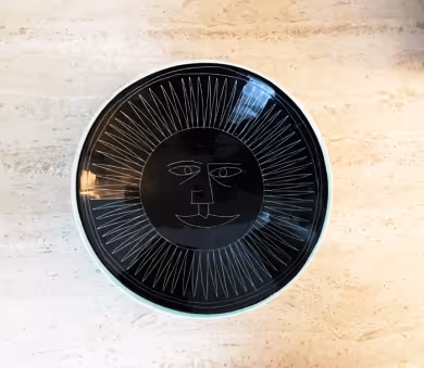 A glazed pottery plate with sun decor in the style of Picasso. Black and celadon glaze. Inscribed "St Pierre Cros de Cagnes, 1951" on the reverse.