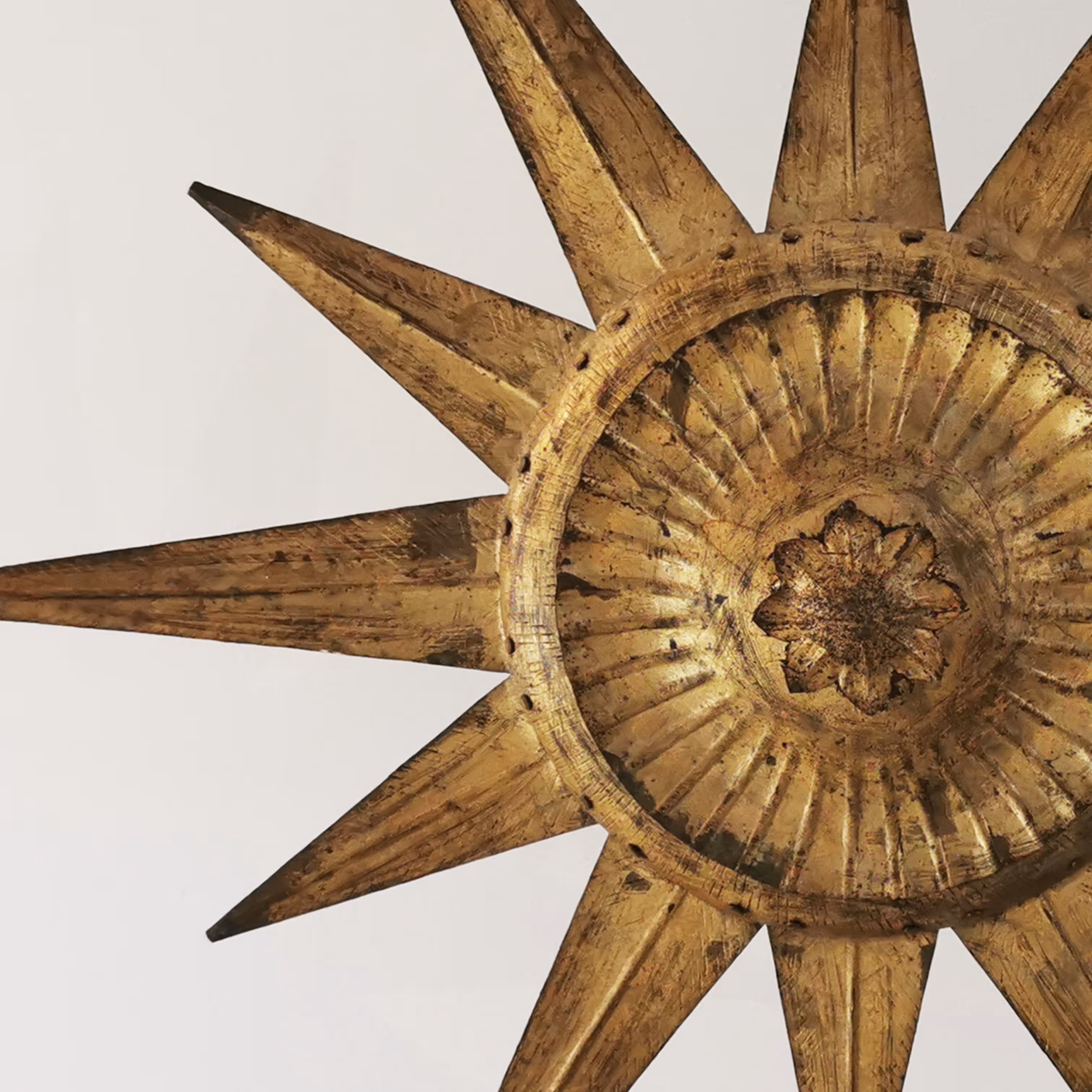 Unusual, large scale, sun ceiling light. Gilt metal. Could also be used as a wall light.