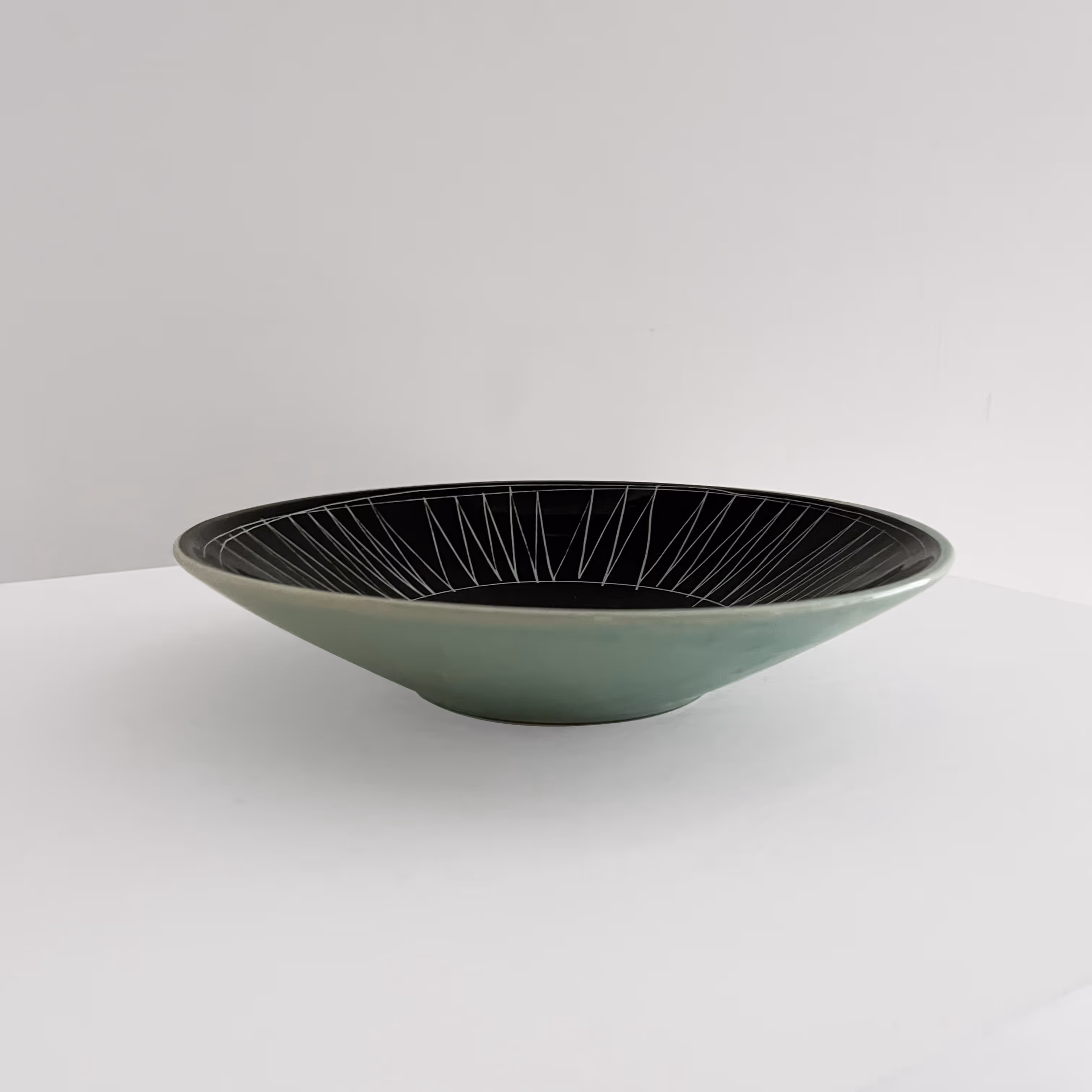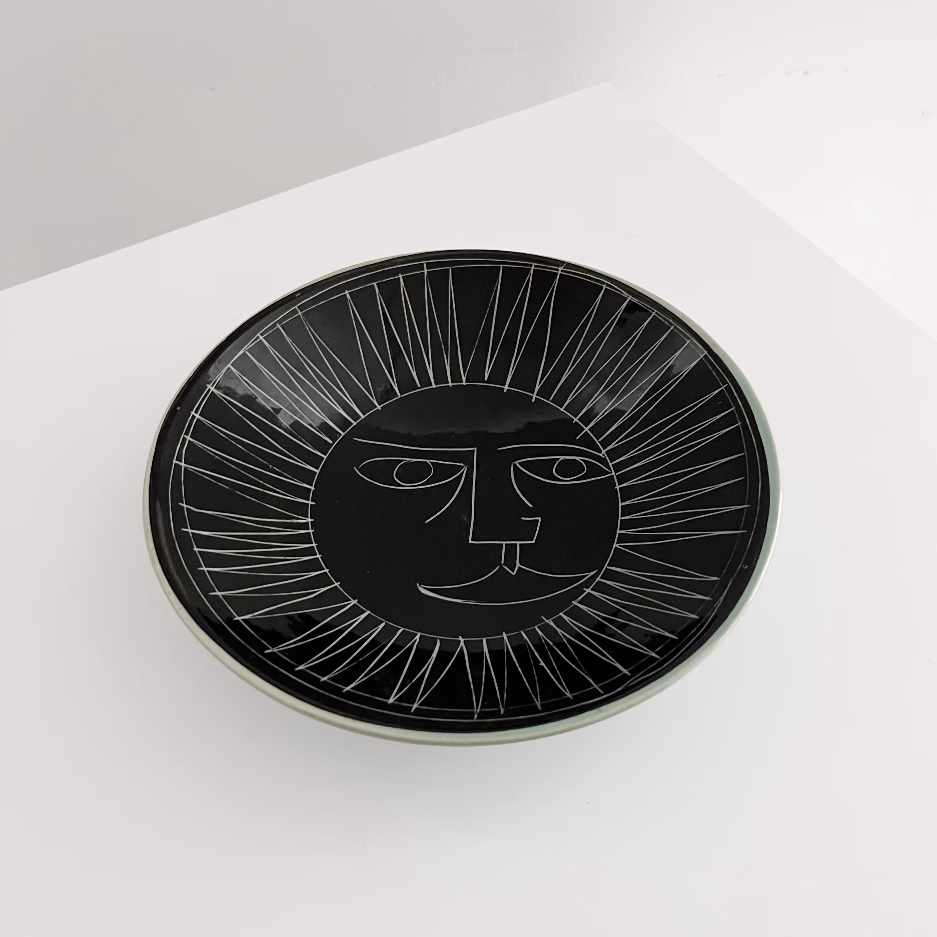 Black glaze pottery plate with freehand sun and face decor by Jacques Pouchain.
