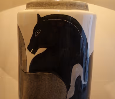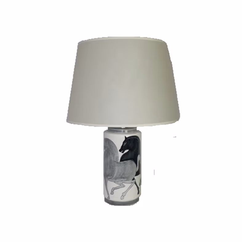 A pottery base lamp with painted horses. By Ernestine (Salerno), signed and dated 1955 under the base. Re-wired and PAT certified
