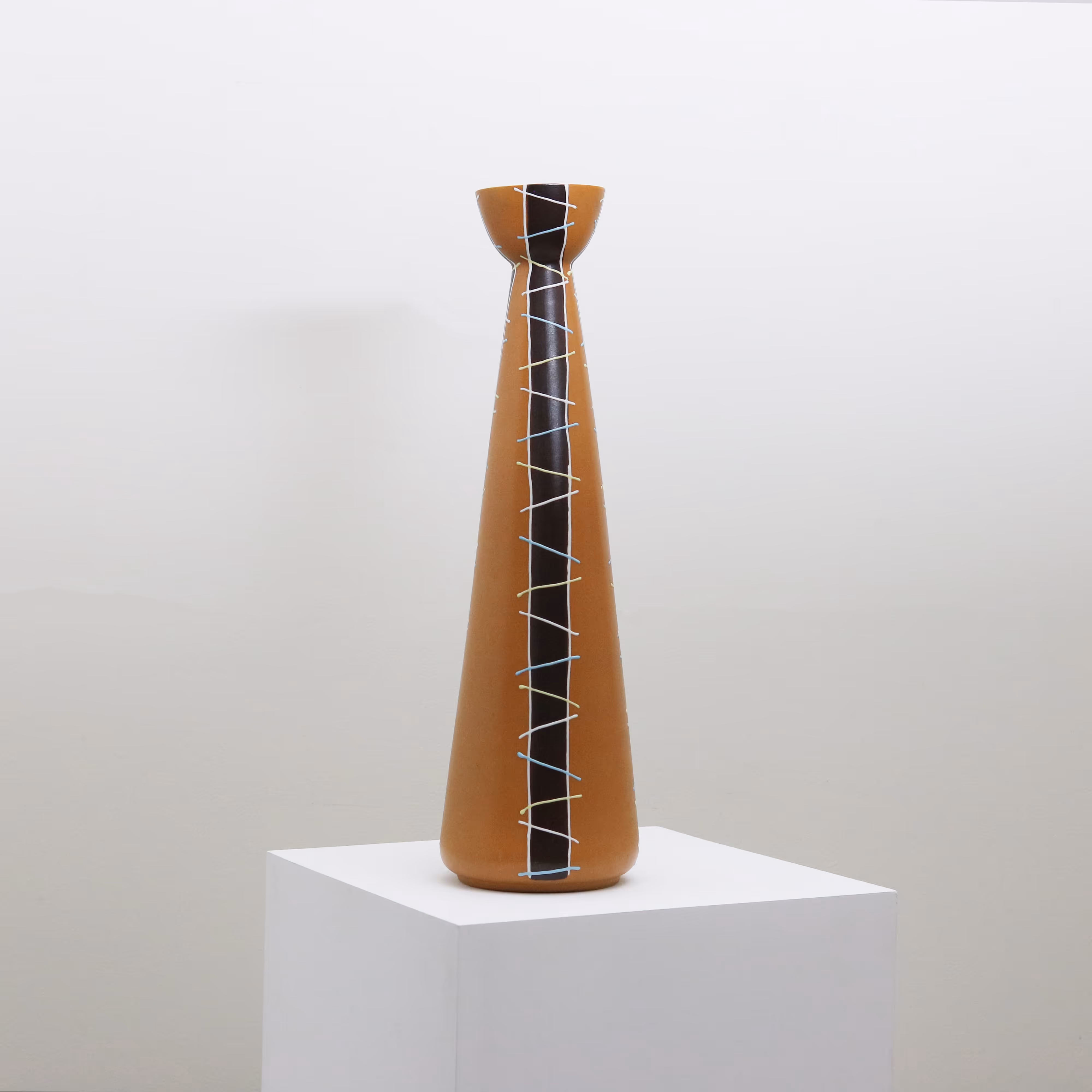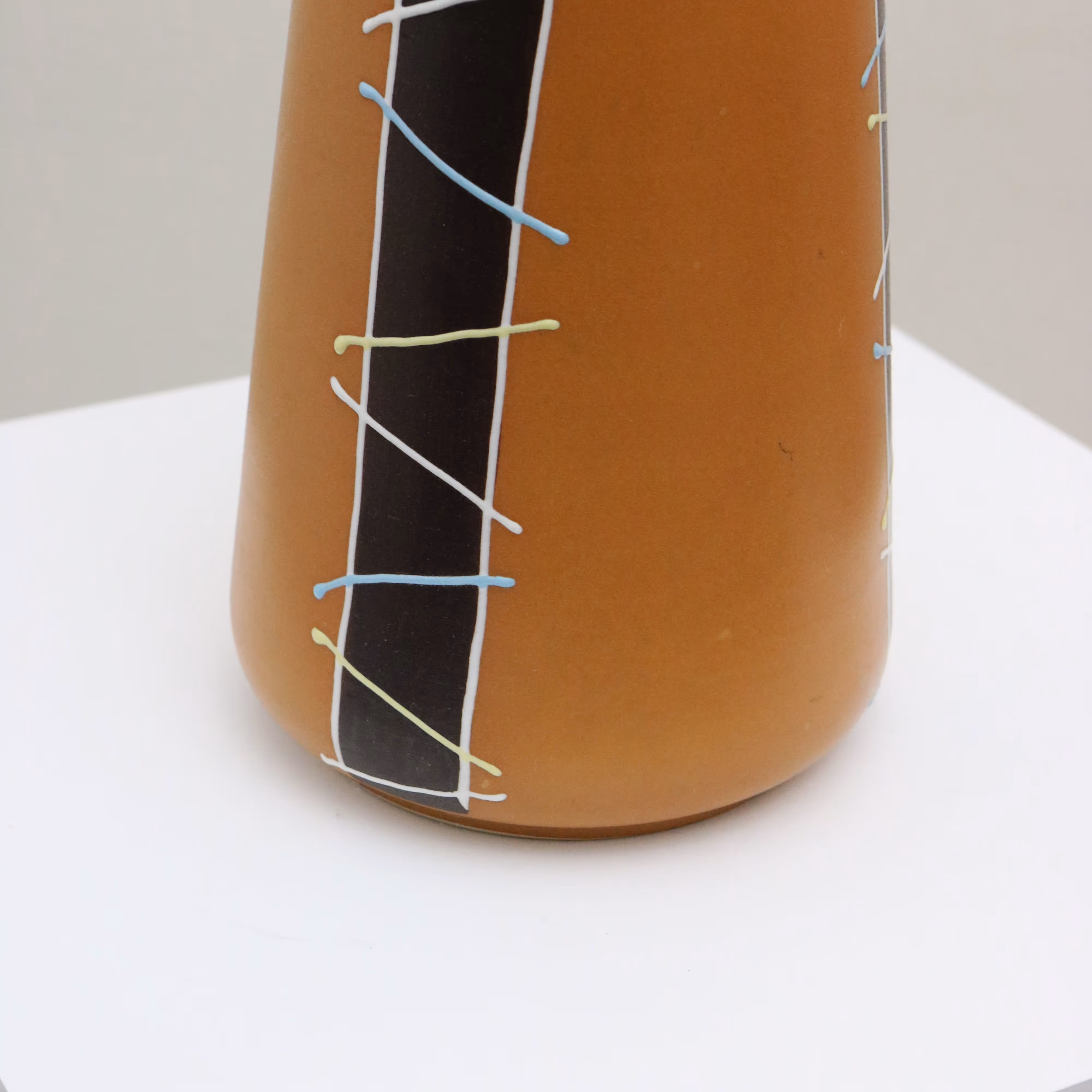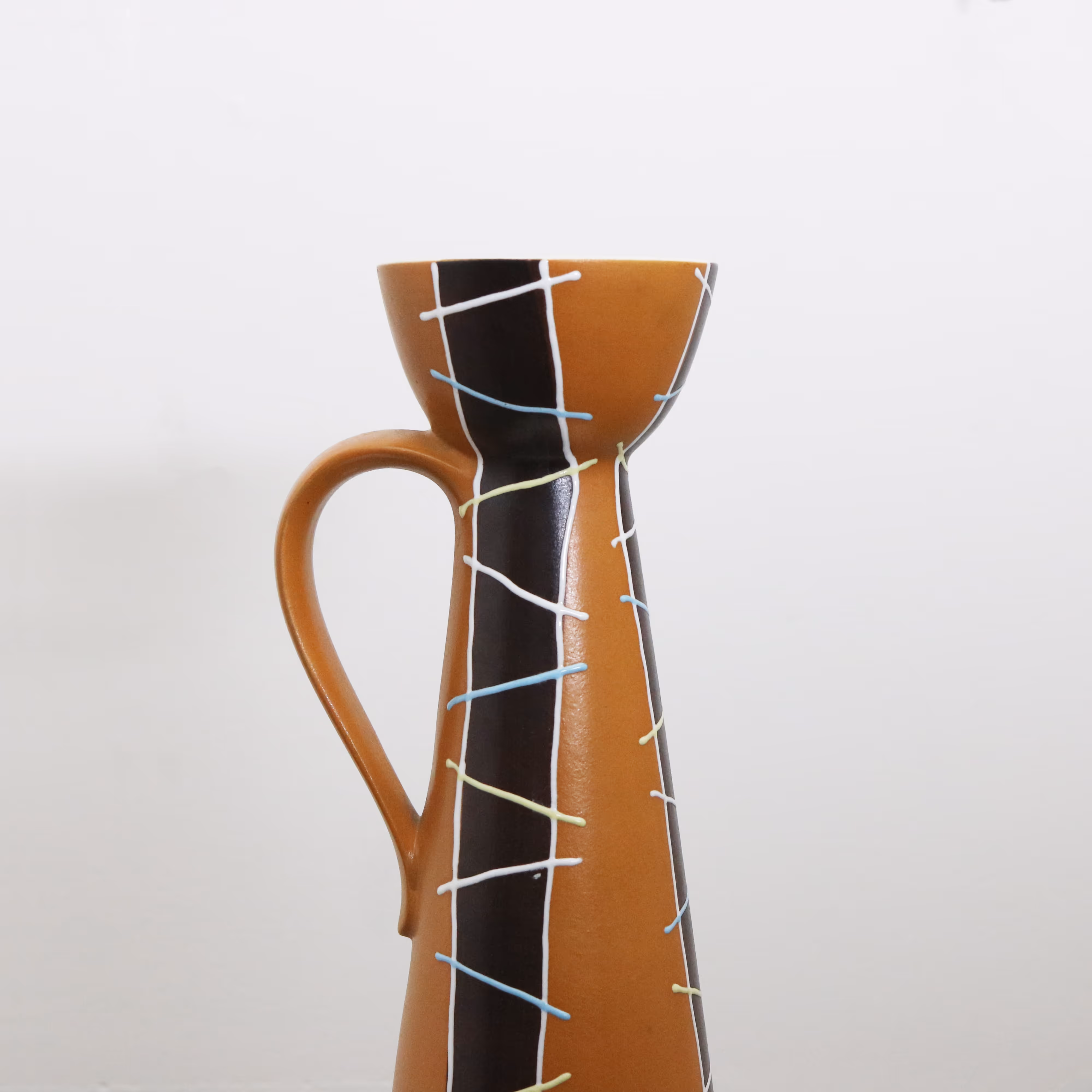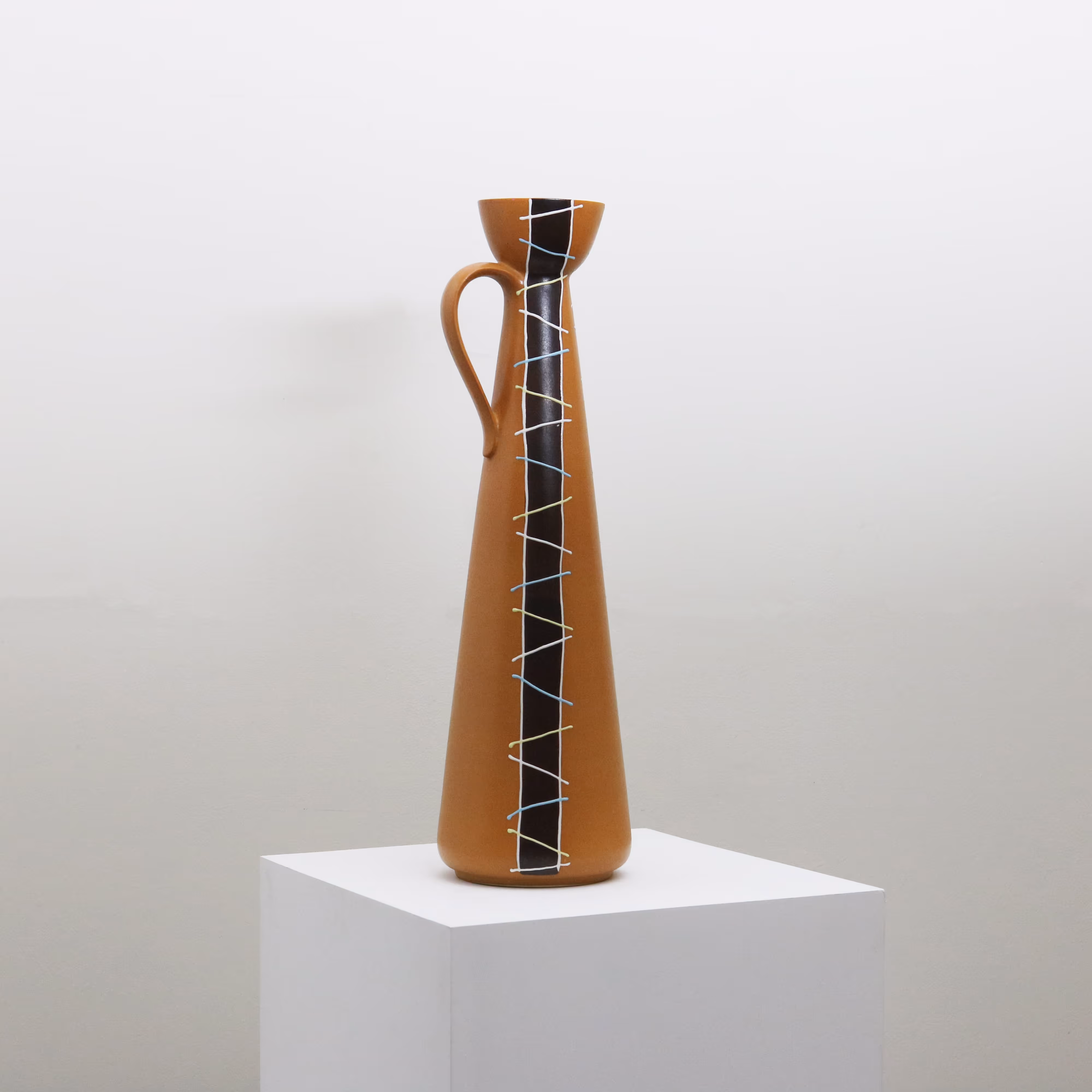 Very tall jug in terracotta glaze with black freehand zigzag motif.
