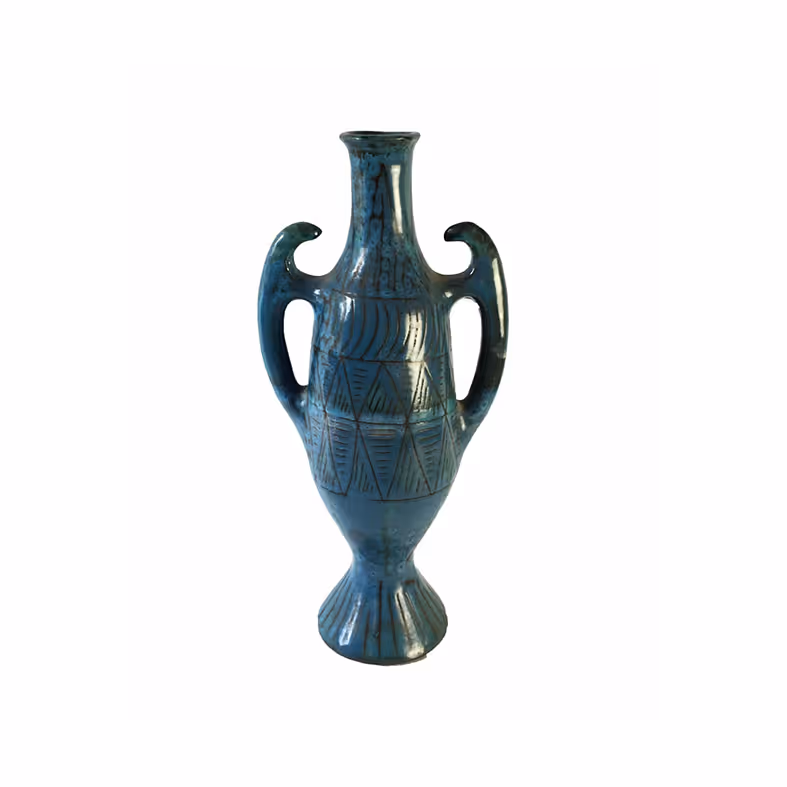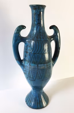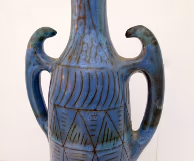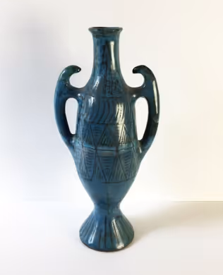 A striking tall pottery vase with sgraffito decor on matt blue glaze and unusual handles.