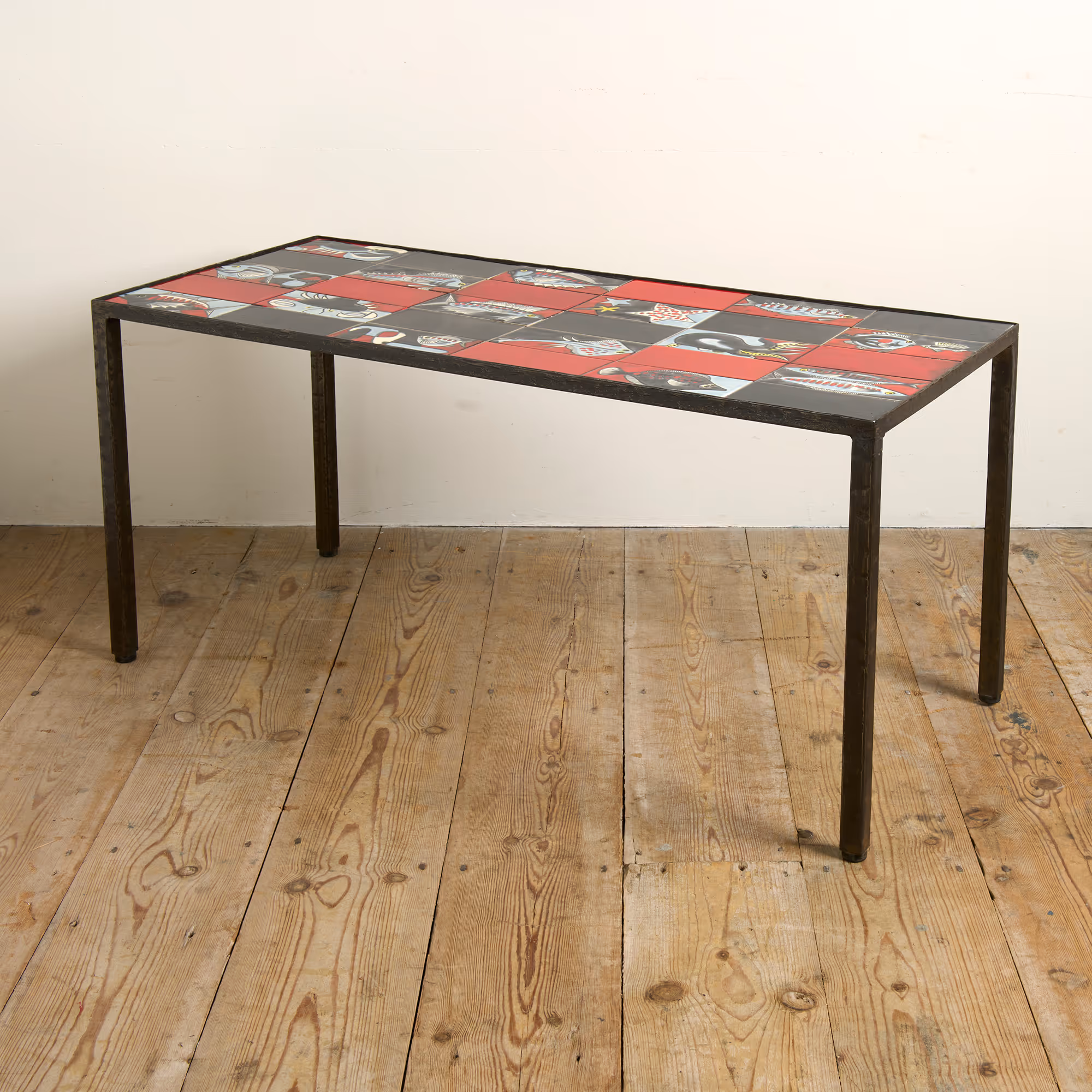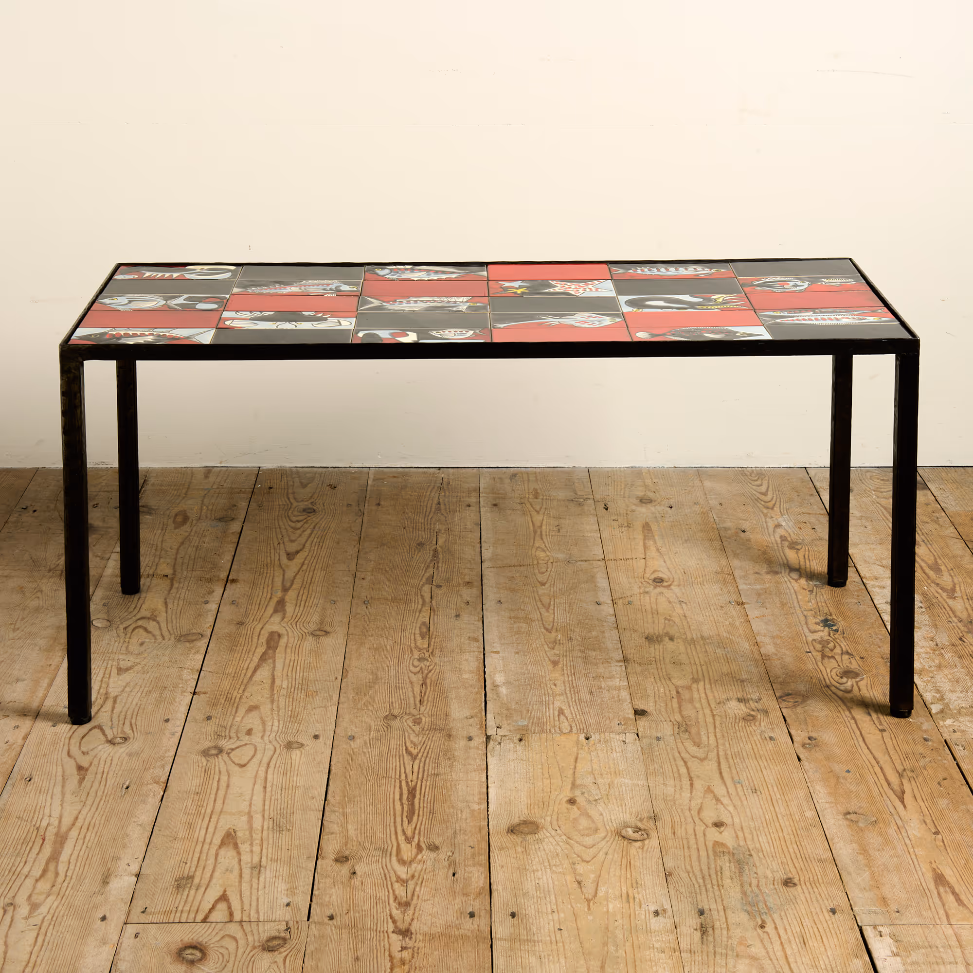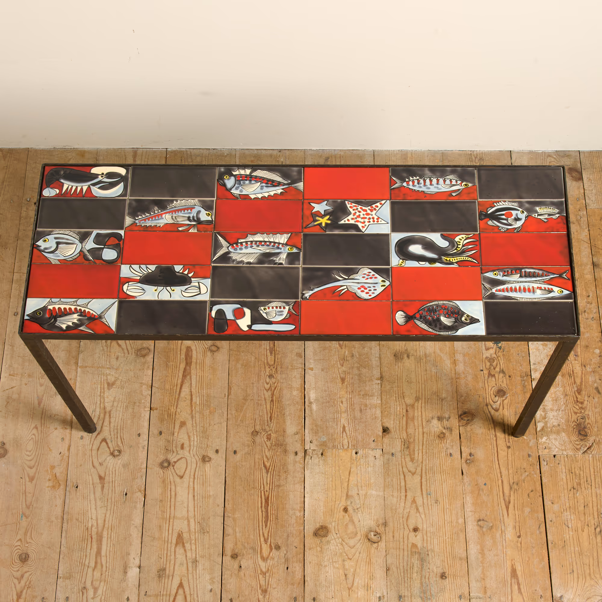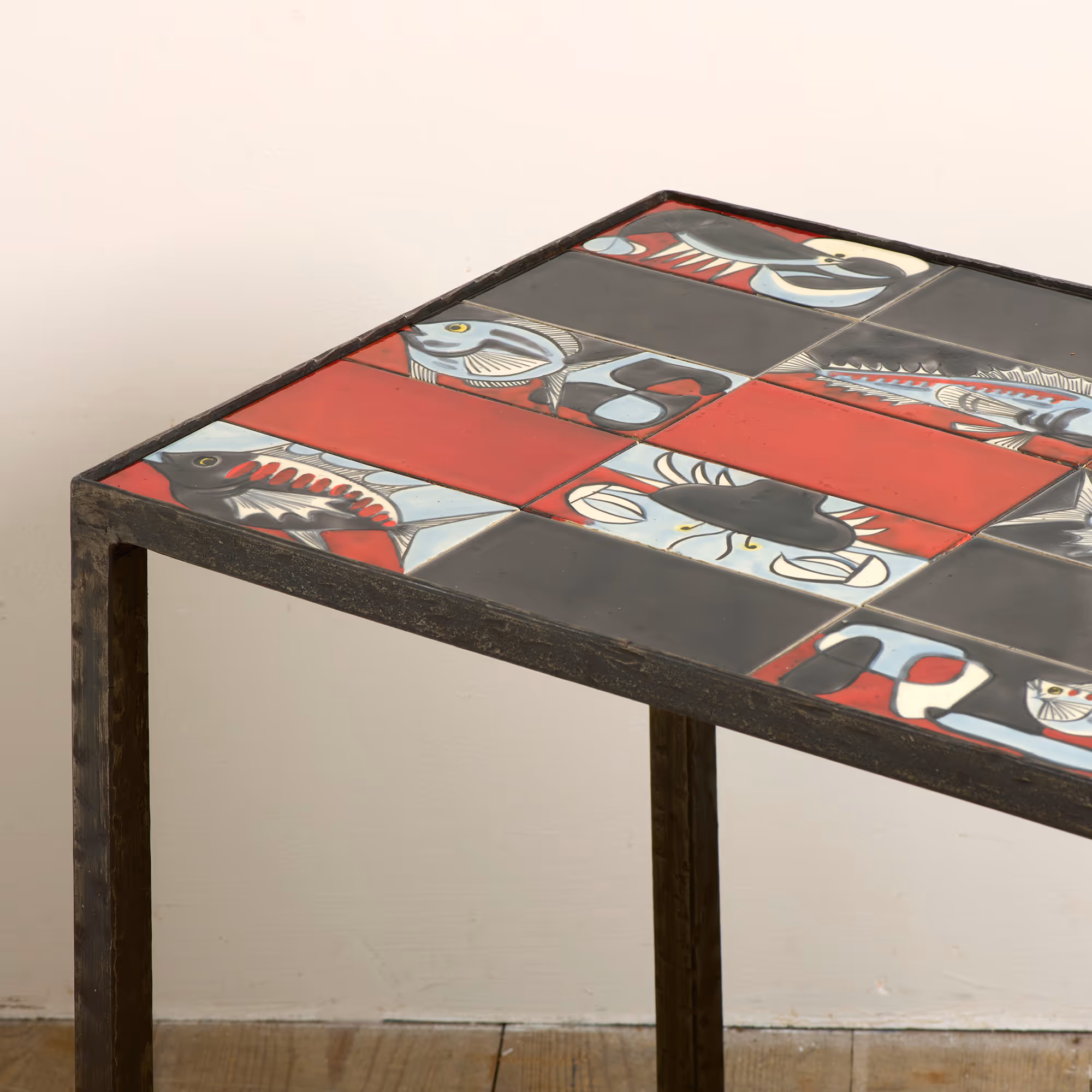 Tiled top coffee table incorporating plain black and red hand-painted tiles decorated with stylized sea creatures. Simple black steel base.
