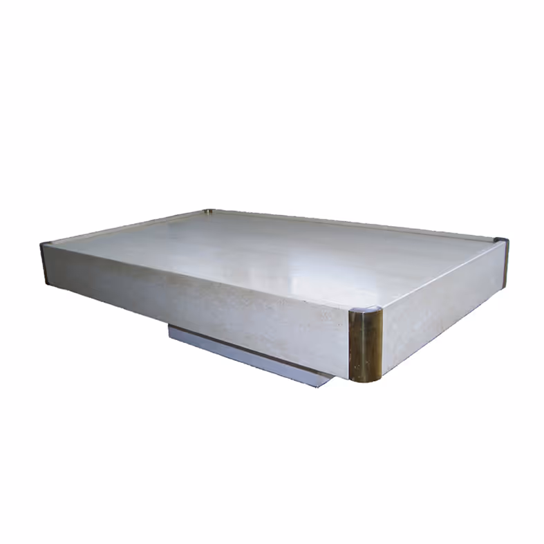 A travertine marble coffee table with brass details, often attributed to Willy Rizzo