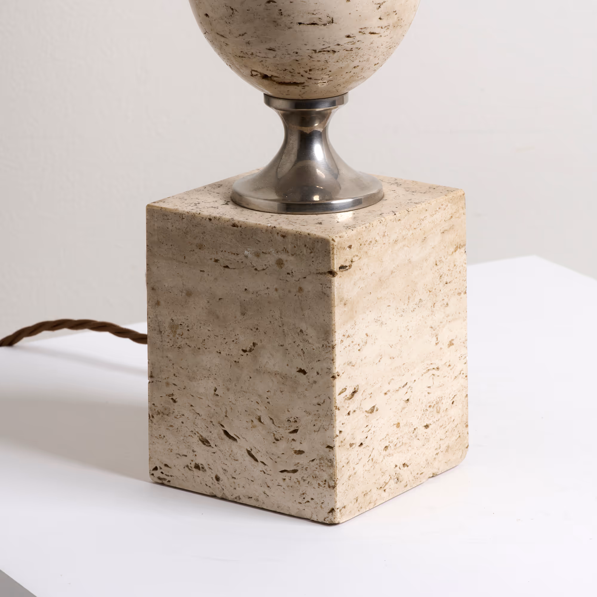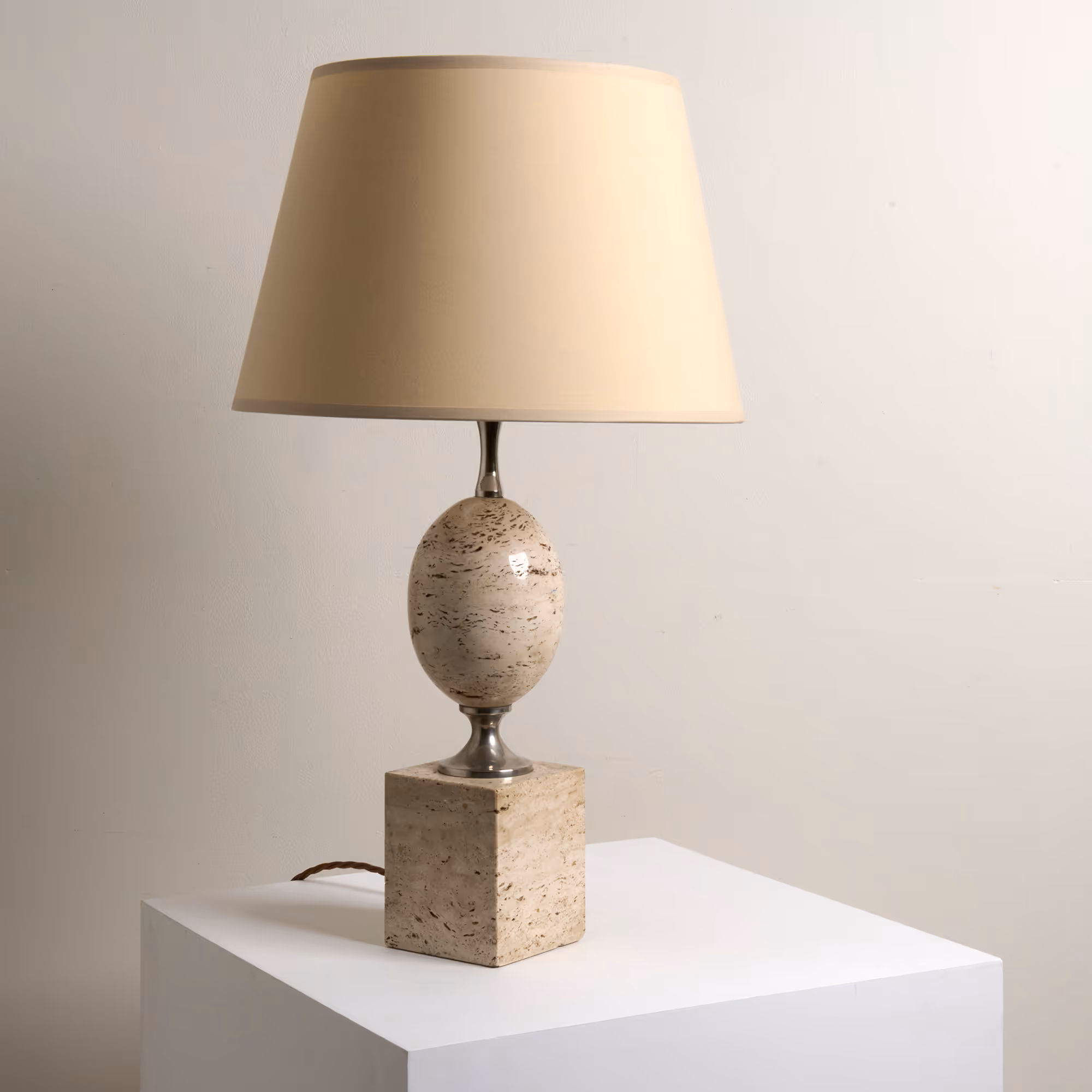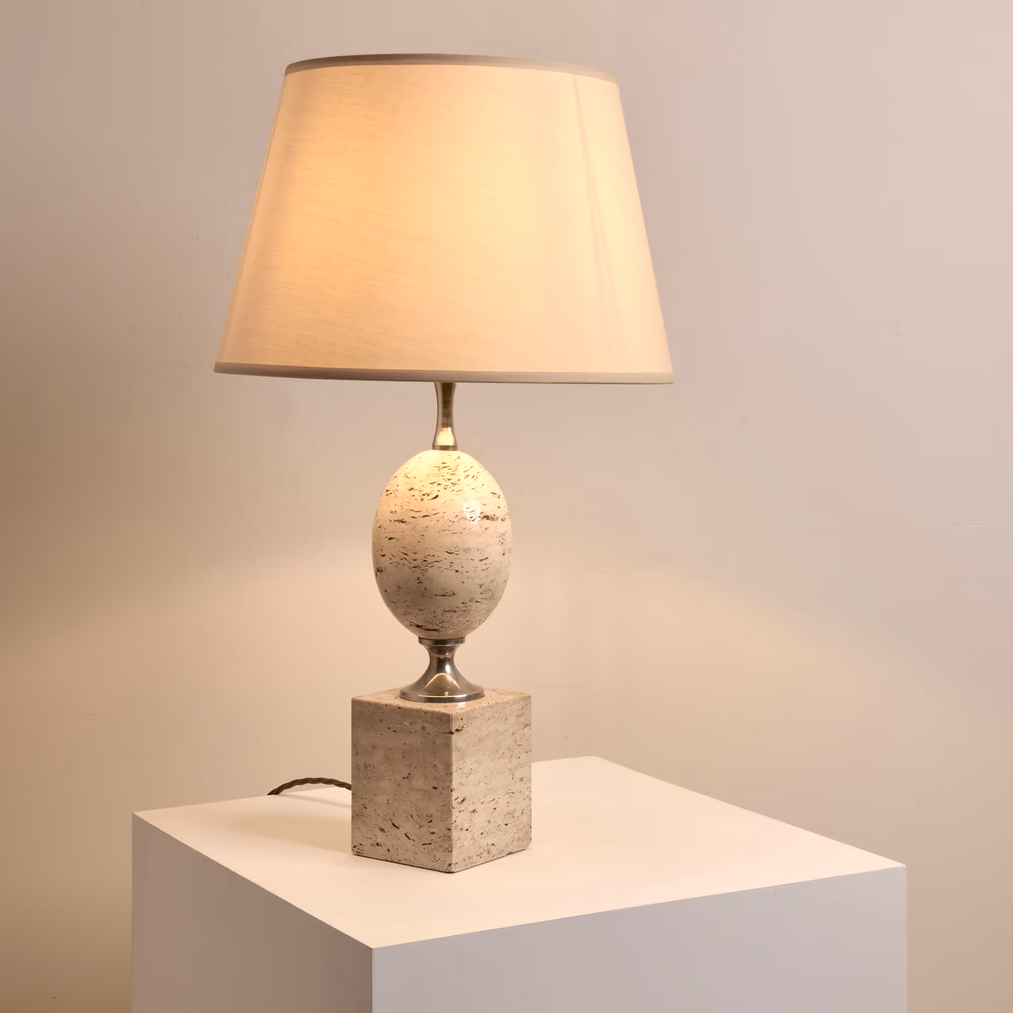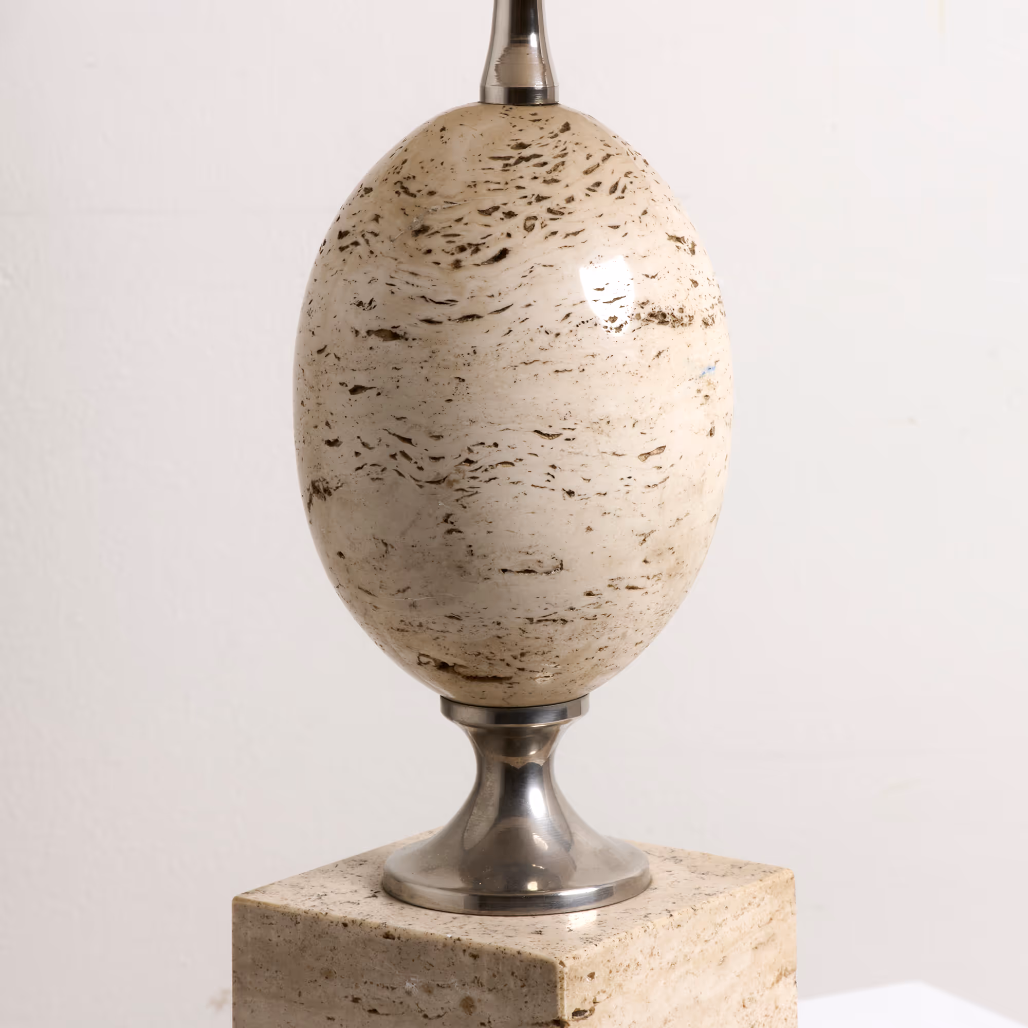 Travertine table lamp by Maison Barbier, featuring a carved egg on a square base, and nickel-plated details.