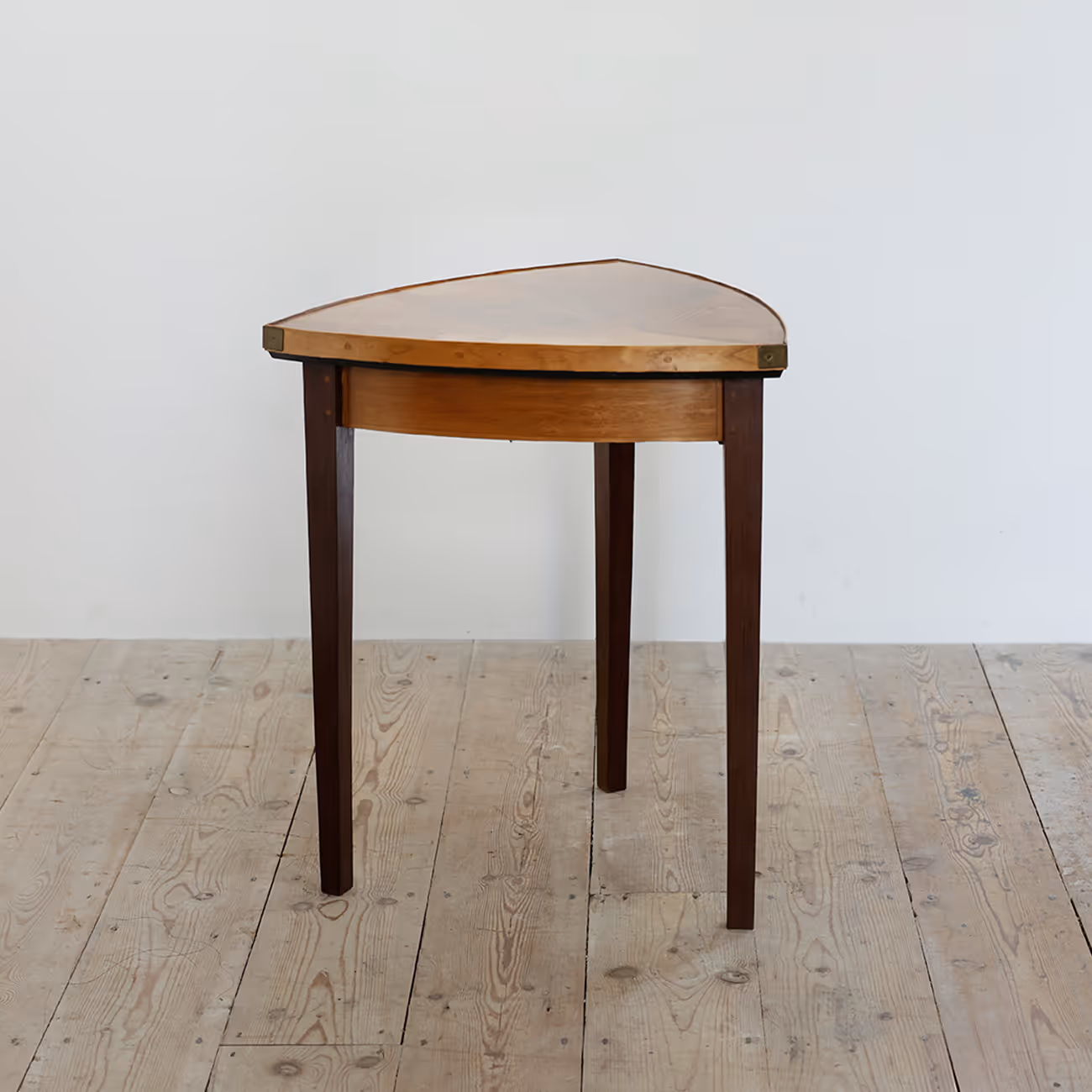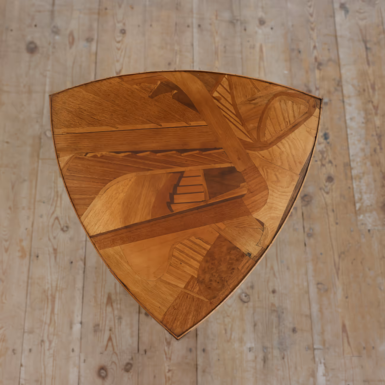 Art Nouveau side table with curved triangle top decorated in highly unusual marquetry inlays depicting a stairwell of endless steps and entwined hand rails. We think that the straight, square section legs are not original and were replaced in the 1980s.