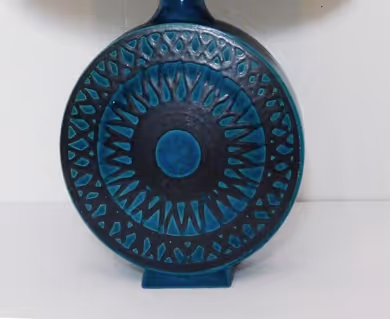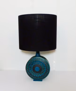 A turquoise ceramic table lamp, black glaze detail. New bespoke fabric lampshade. Rewired and PAT-certified