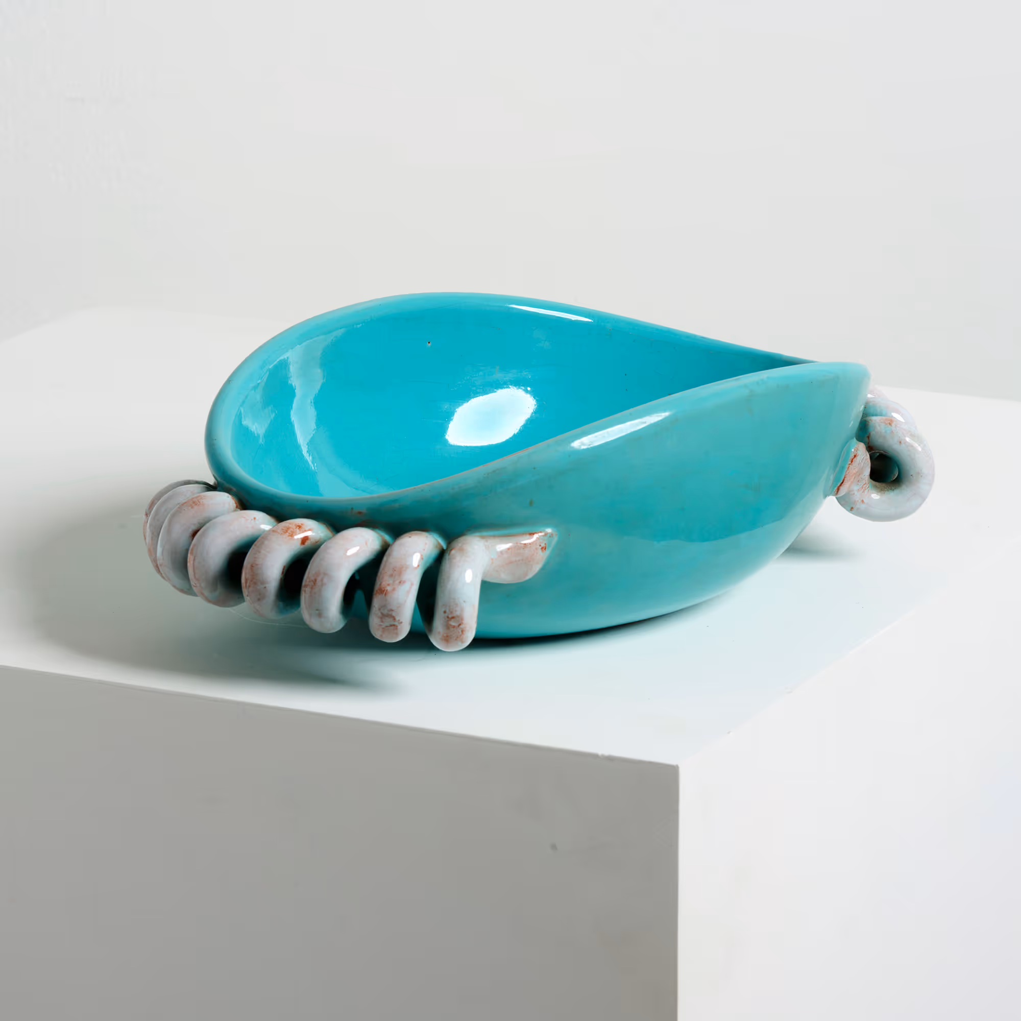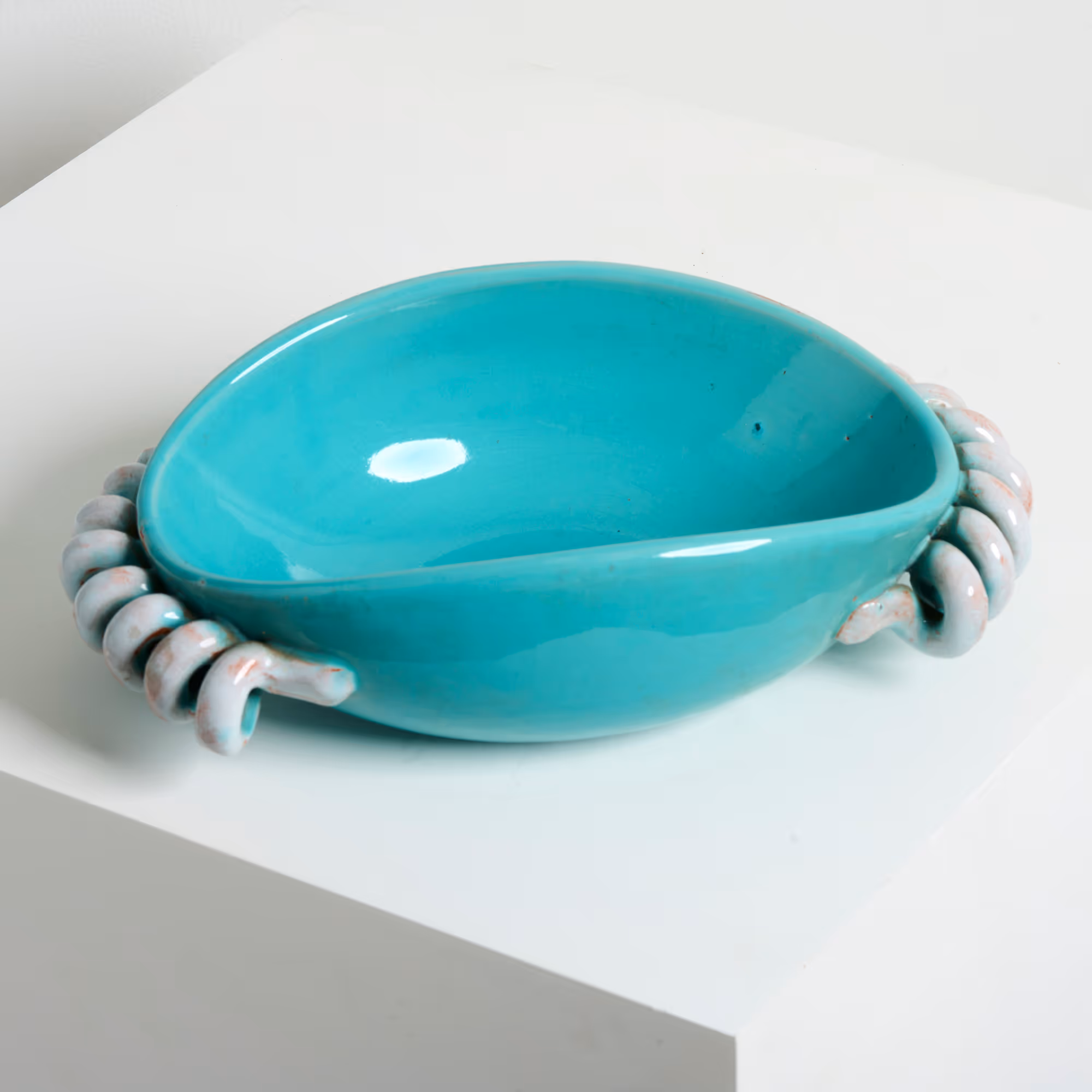 Decorative ceramic dish, deep turquoise glaze and unusual coiled handles. Signed Alexandre.
