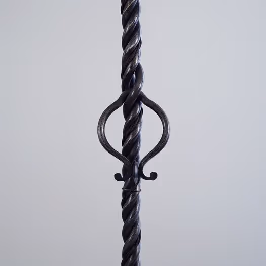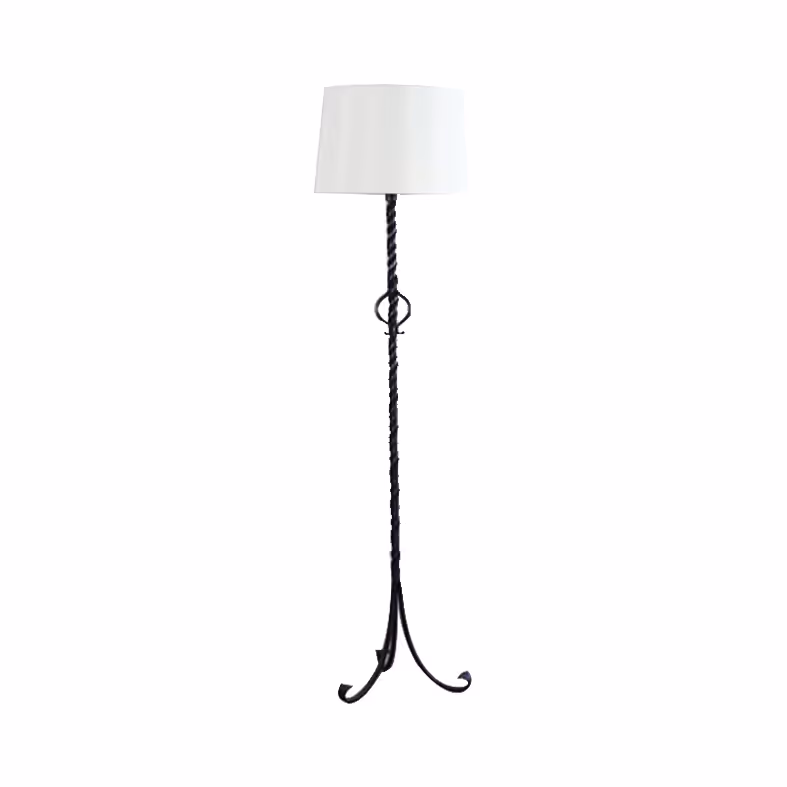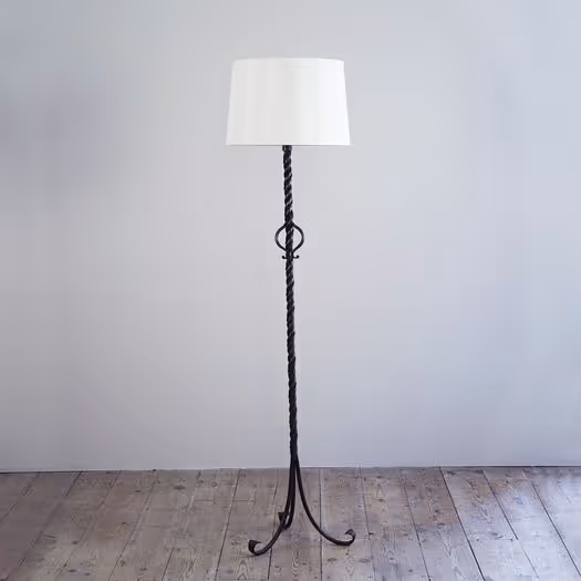 A twisted iron floor lamp with splayed legs and bespoke card shade. Re-wired & PAT-certified