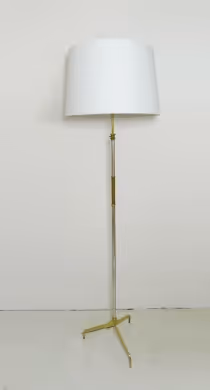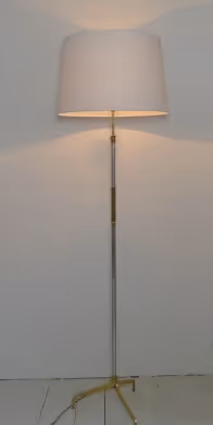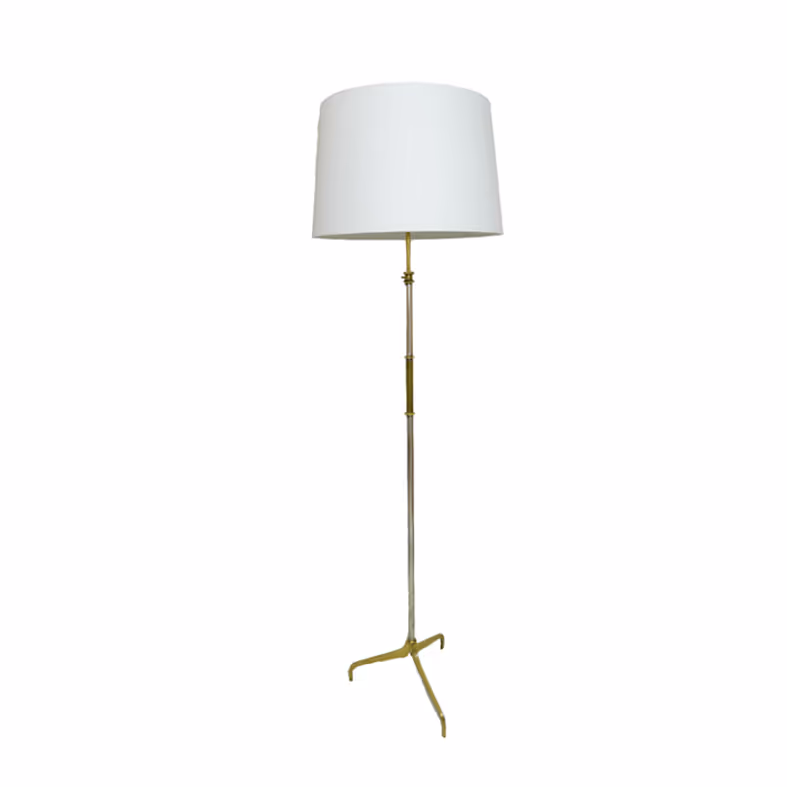A brass and nickel floor lamp with adjustable height and tripod base.