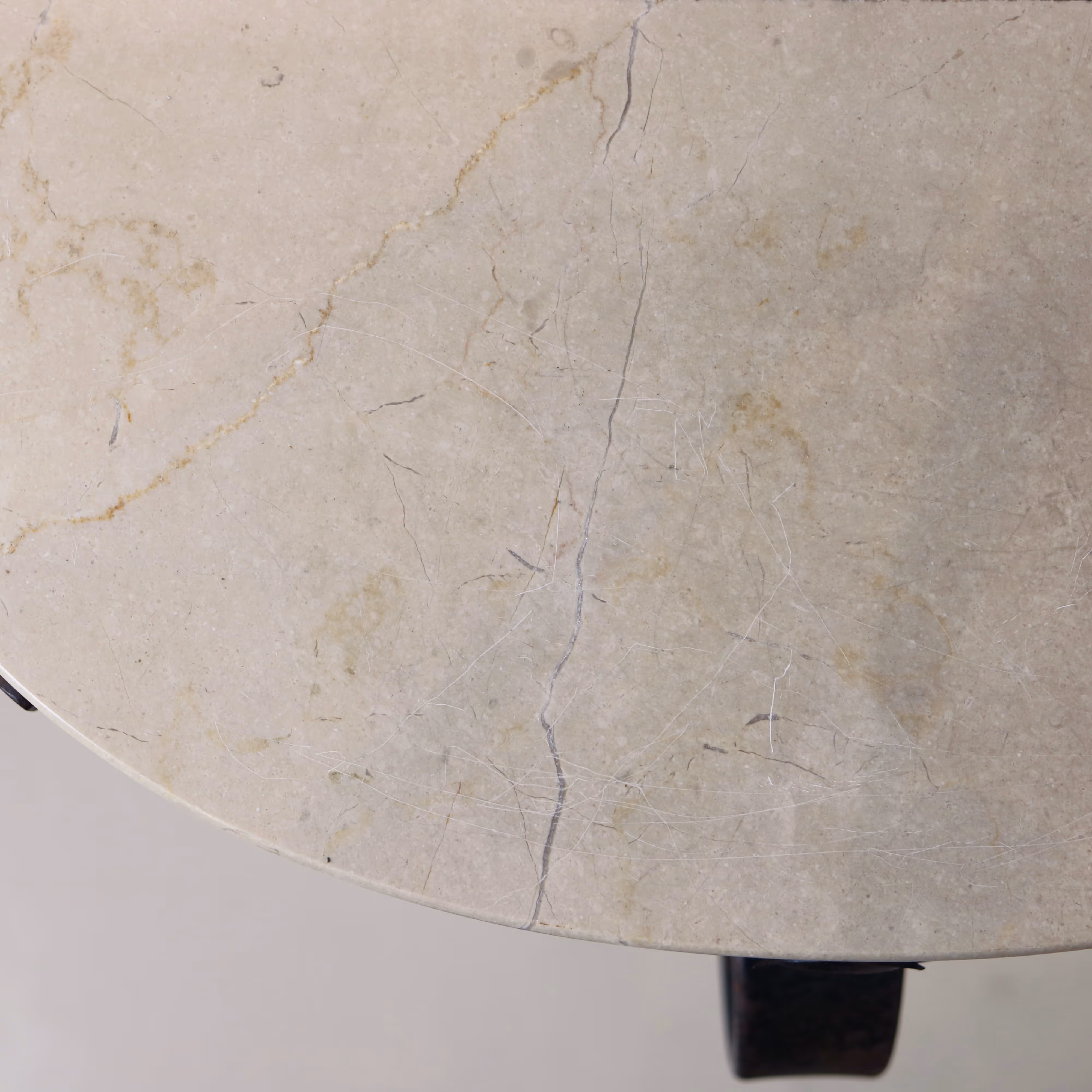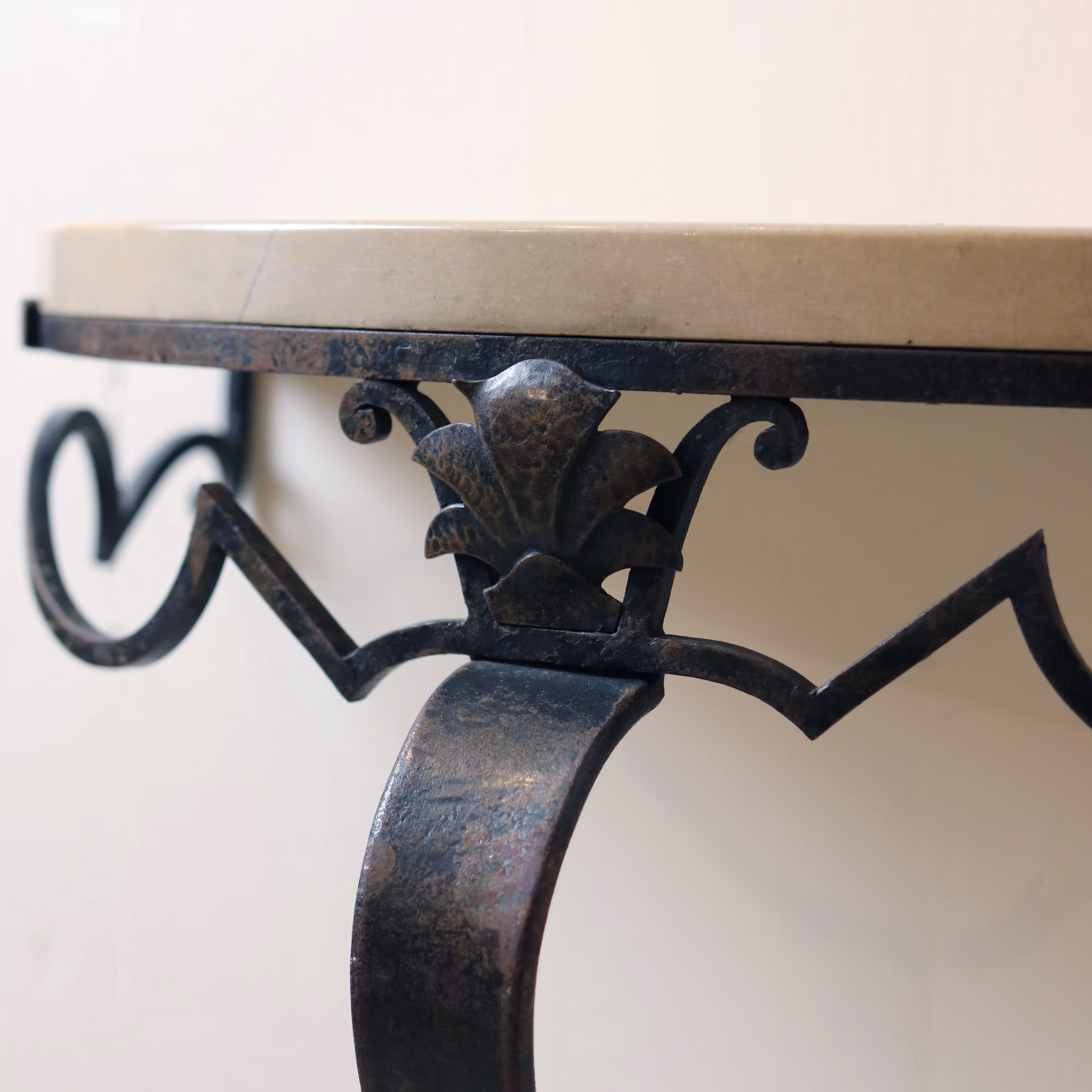 An elegant wall-mounted, demi-lune bracket with steel frame and stone top.