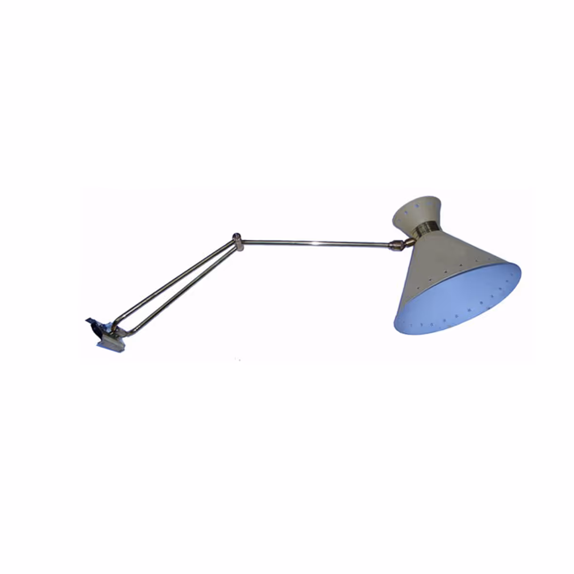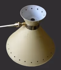 A 1950s wall light by Lunel. Articulated brass arm and off-white metal shade with star partern perforation on the edge.