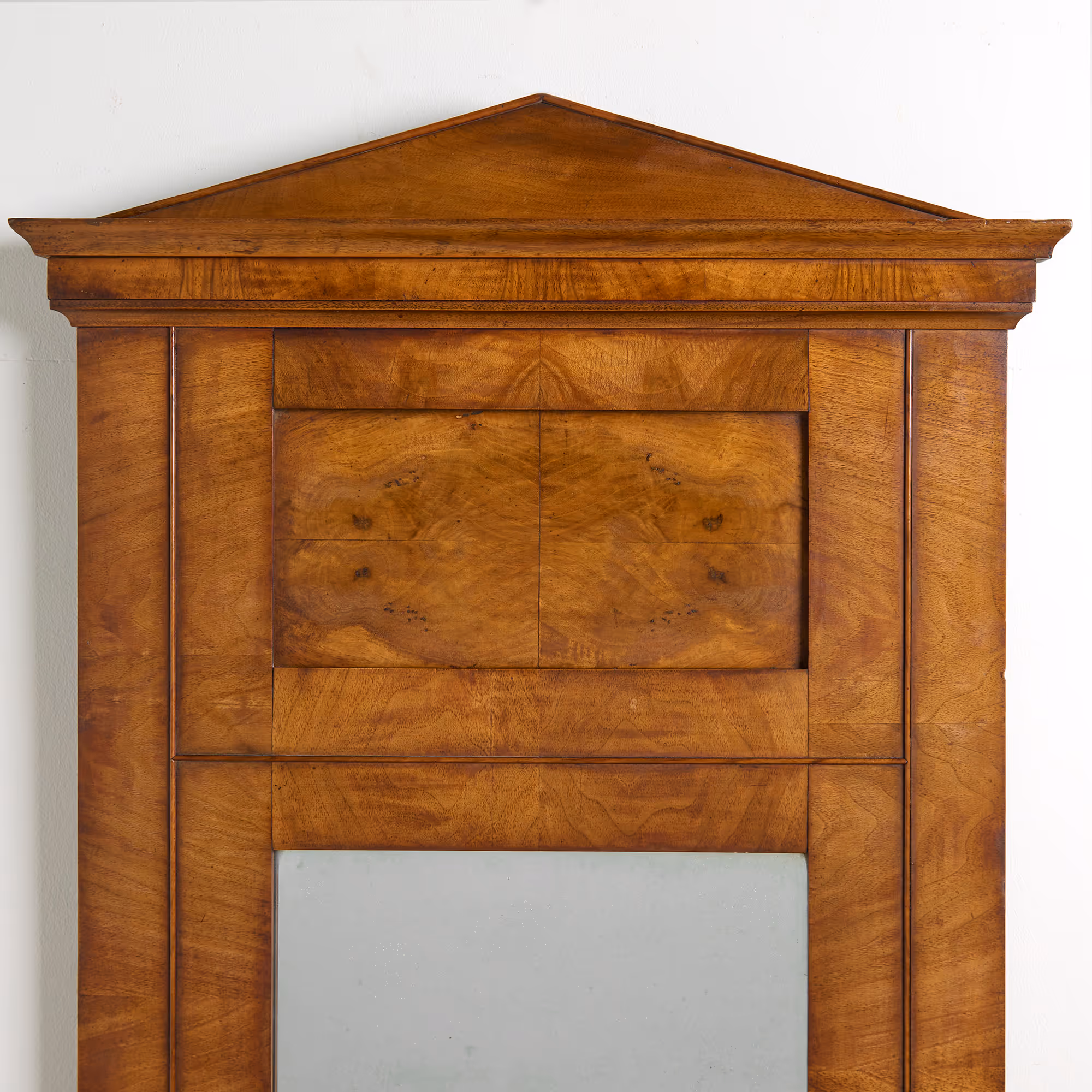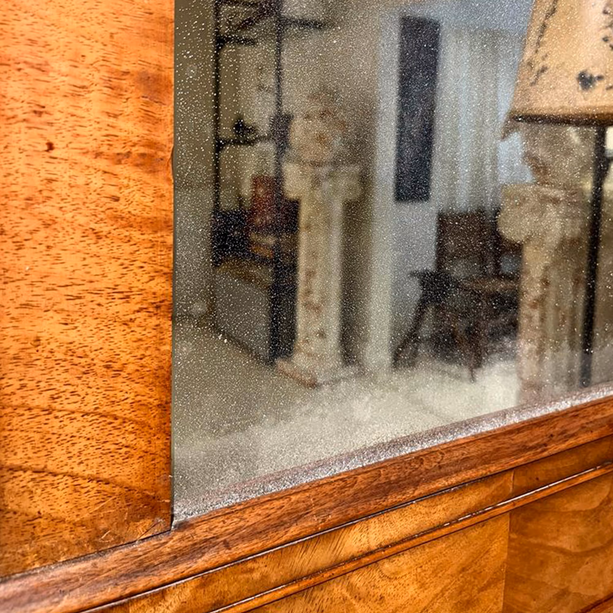 Pier mirror with carved pediment. Walnut veneer on oak substrate. Marvellous original mercury plate.
