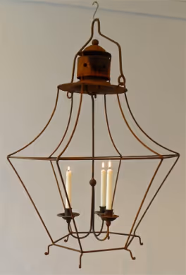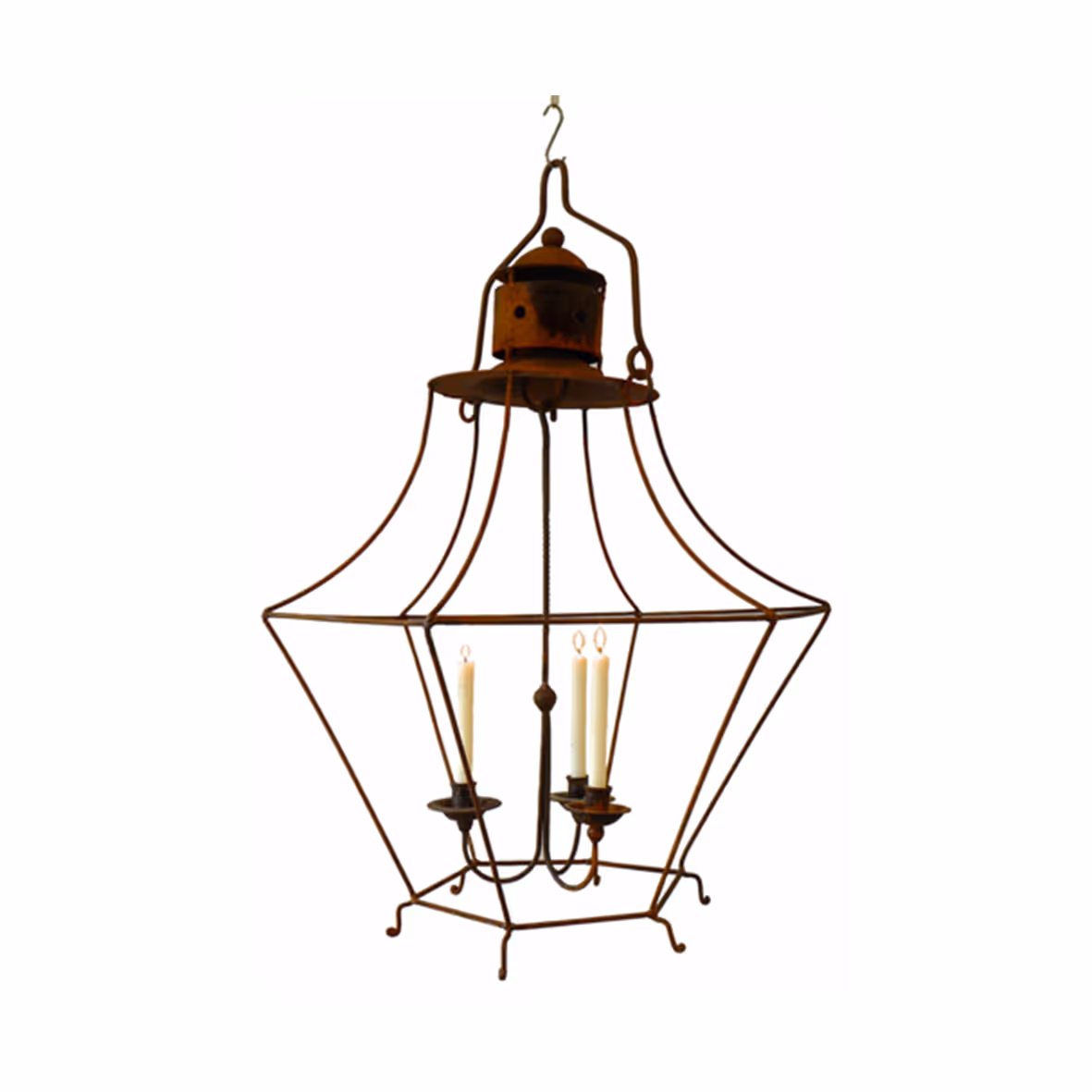 A large, aged wrought iron lantern with three-branch candlestick holder. Not wired, can be wired upon request