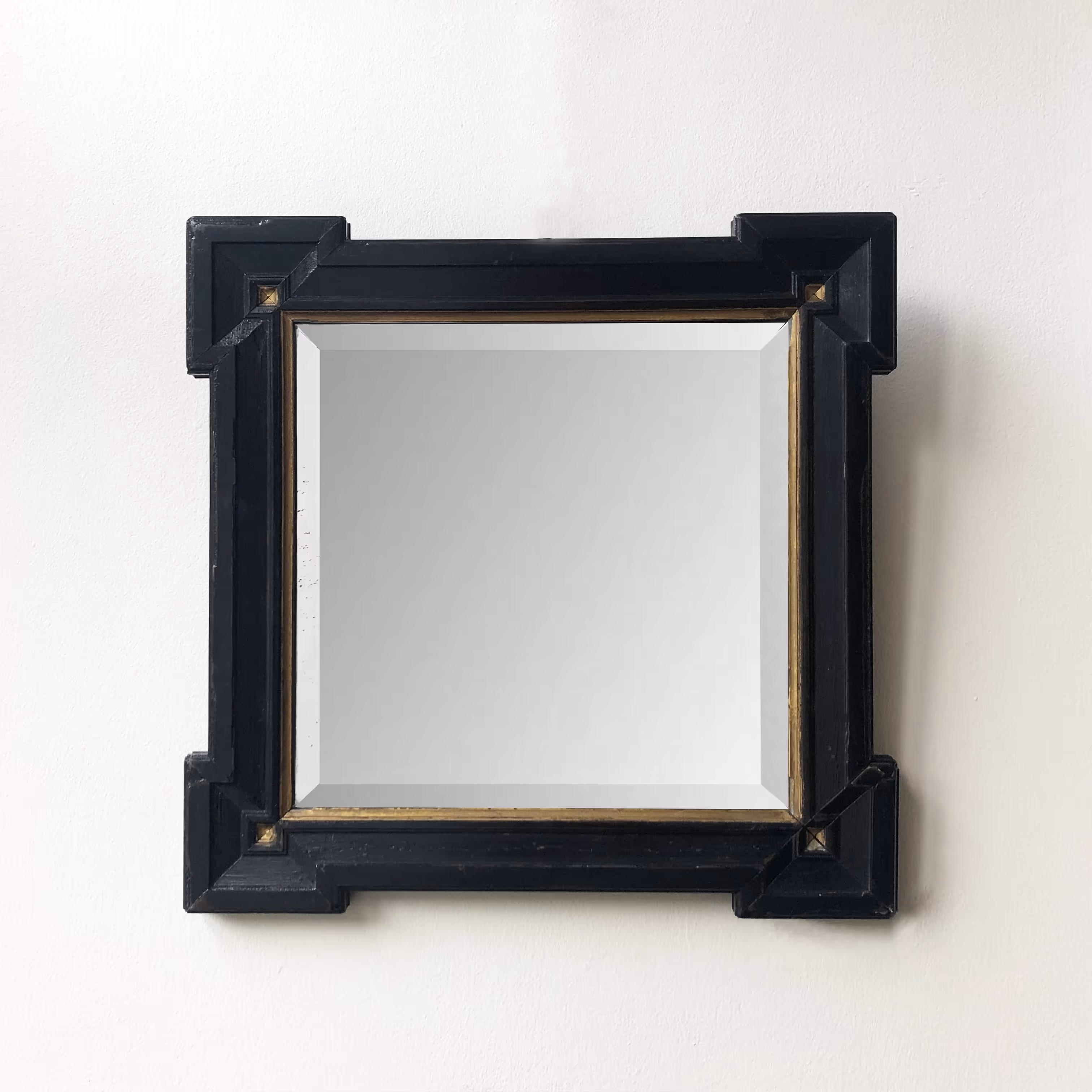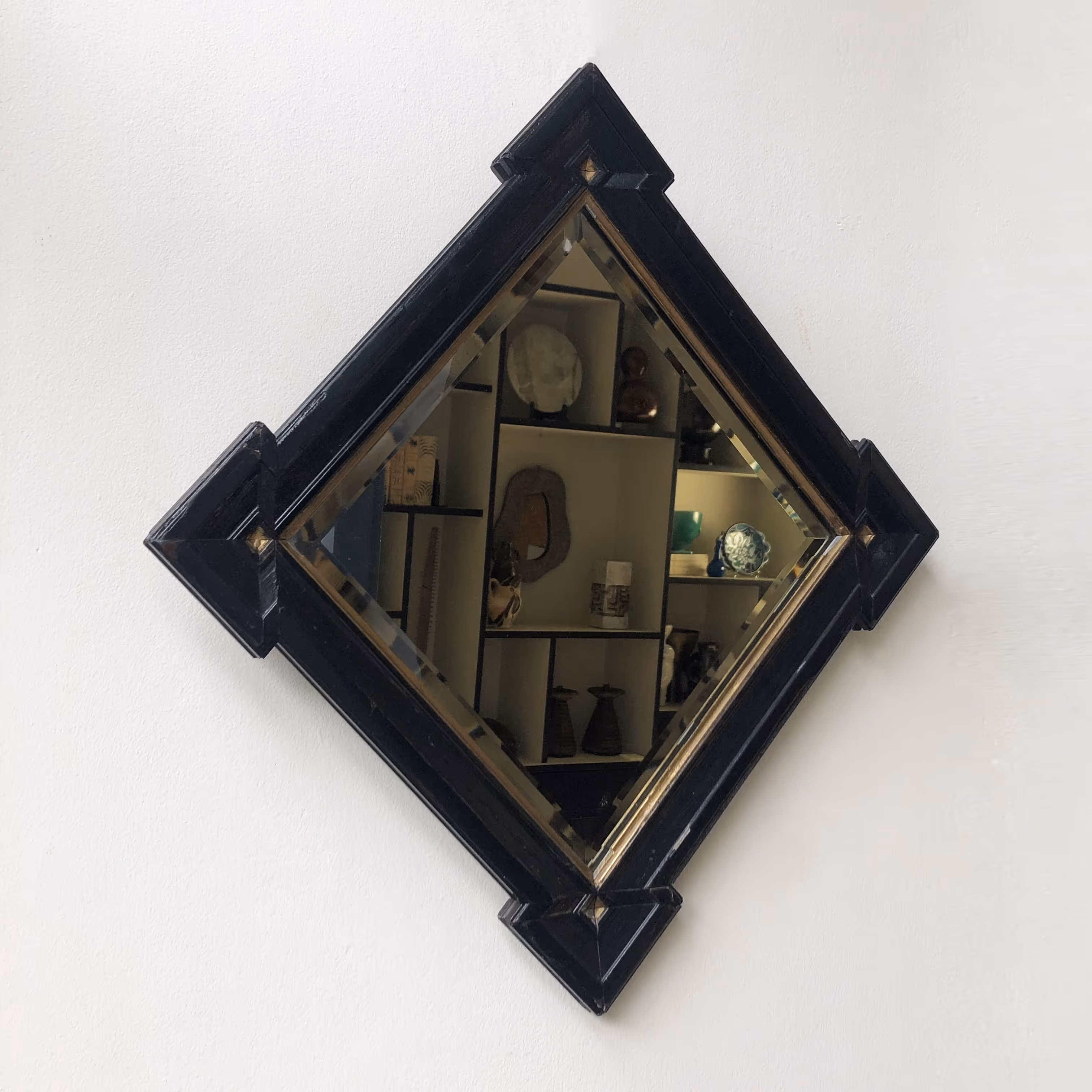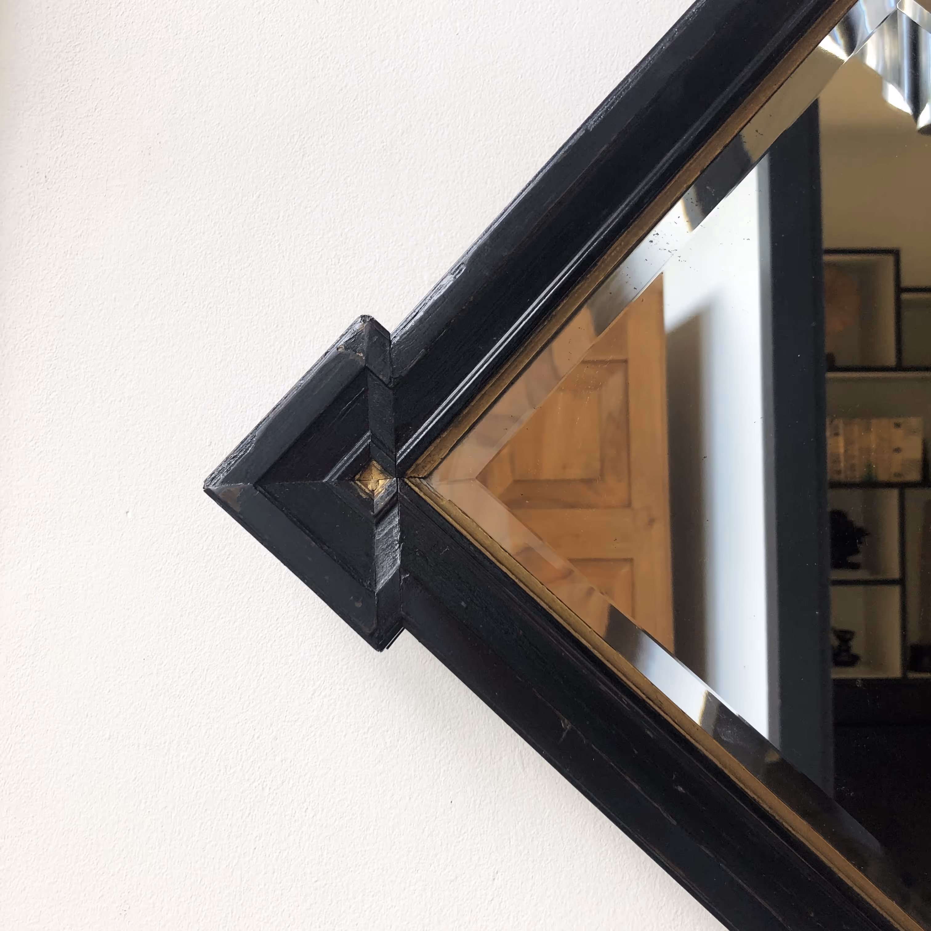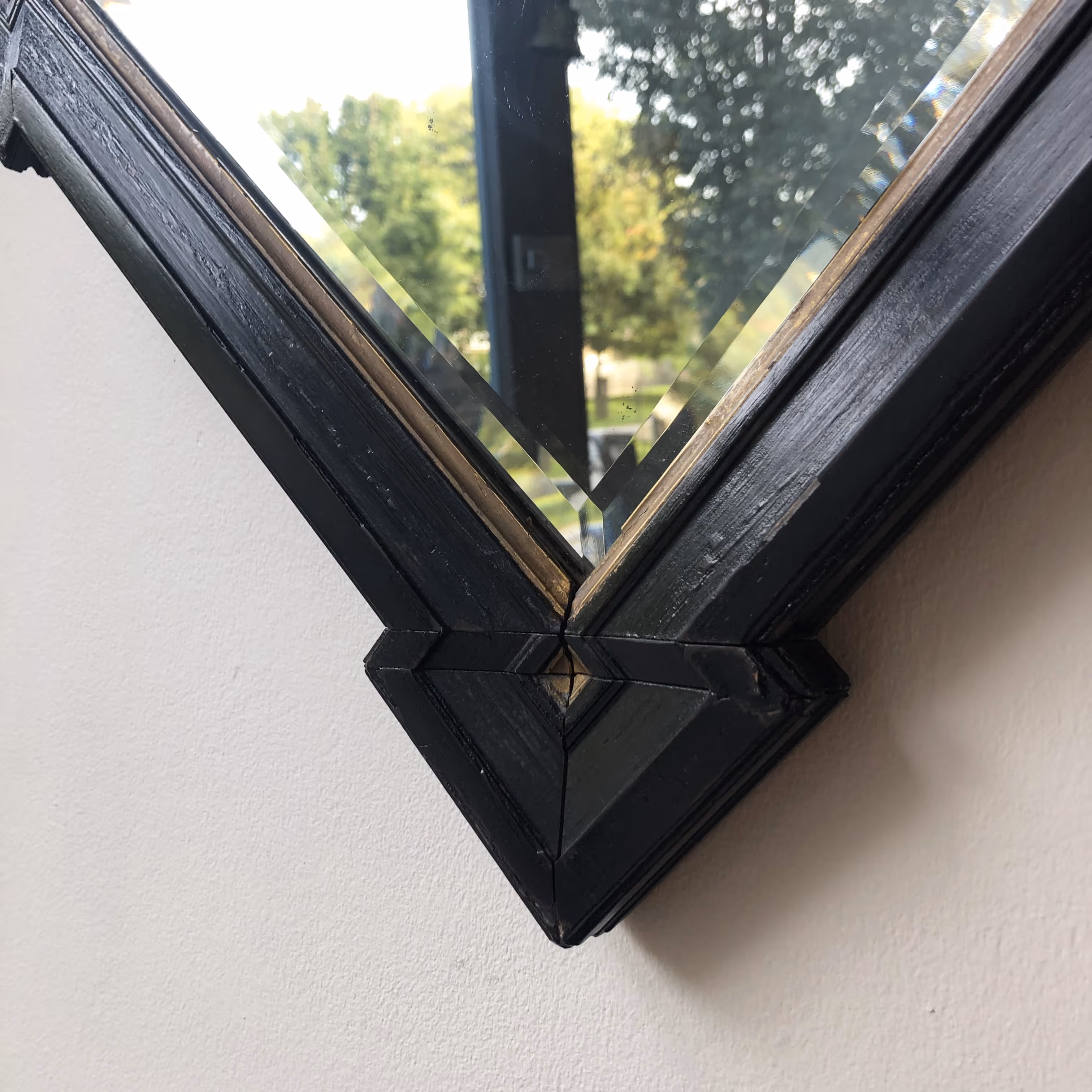 Aesthetic Movement diamond mirror, ebonised frame with gilt details and broken corners (can also be hung square).