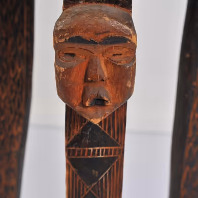 A charming tripod wooden side table with carved head details