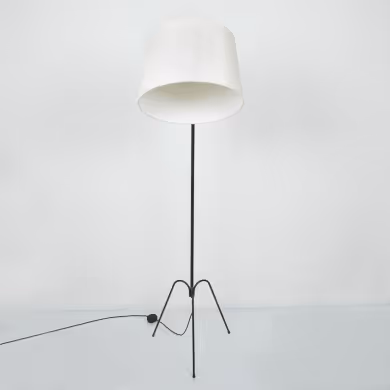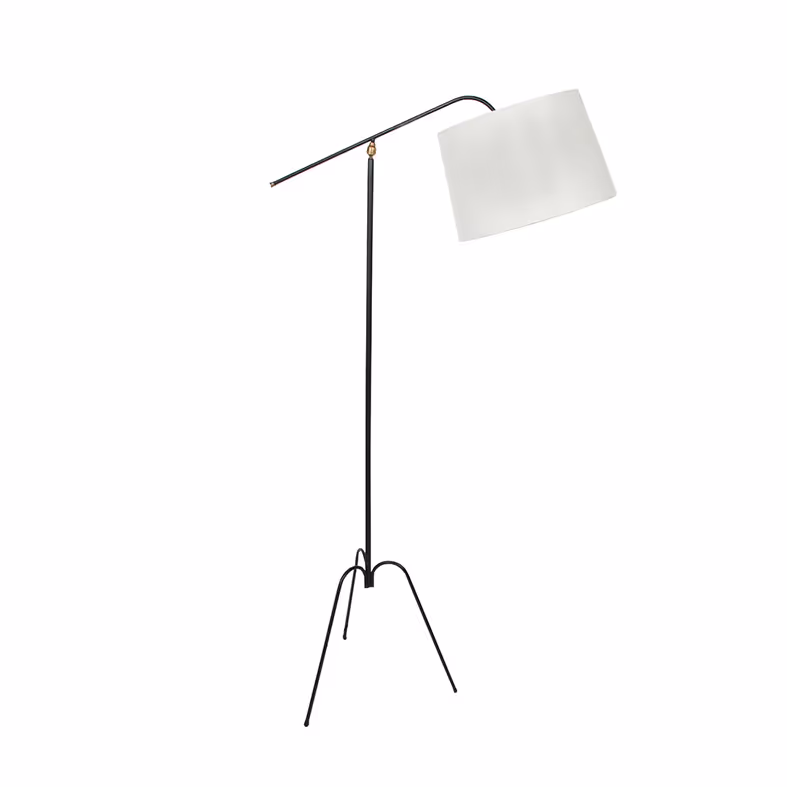 An angled floor lamp, black metal with brass details, directional arm. Re-wired & PAT-certified, new silk shade