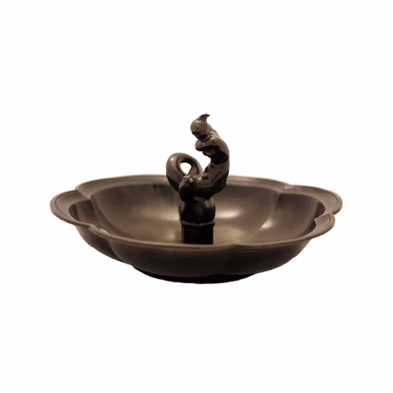 An unusual bowl by Danish designer Just Andersen (1884-1943), made from a composite metal of his own design called "Disko" after his hometown in Greenland. The bowl has a mermaid figure in the centre and is a clover shape, marked 'JUST 1830 Danmark'