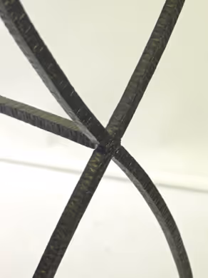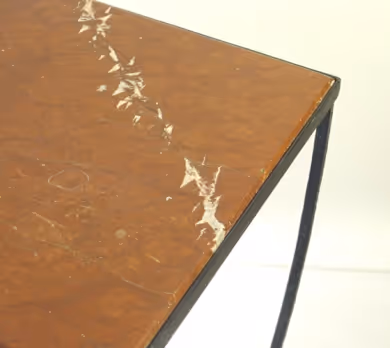 A black steel console table with red marble top.