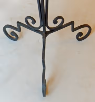 A Black metal Floor Lamp with large bespoke shade. Scrolled detail to head and foot of stand.