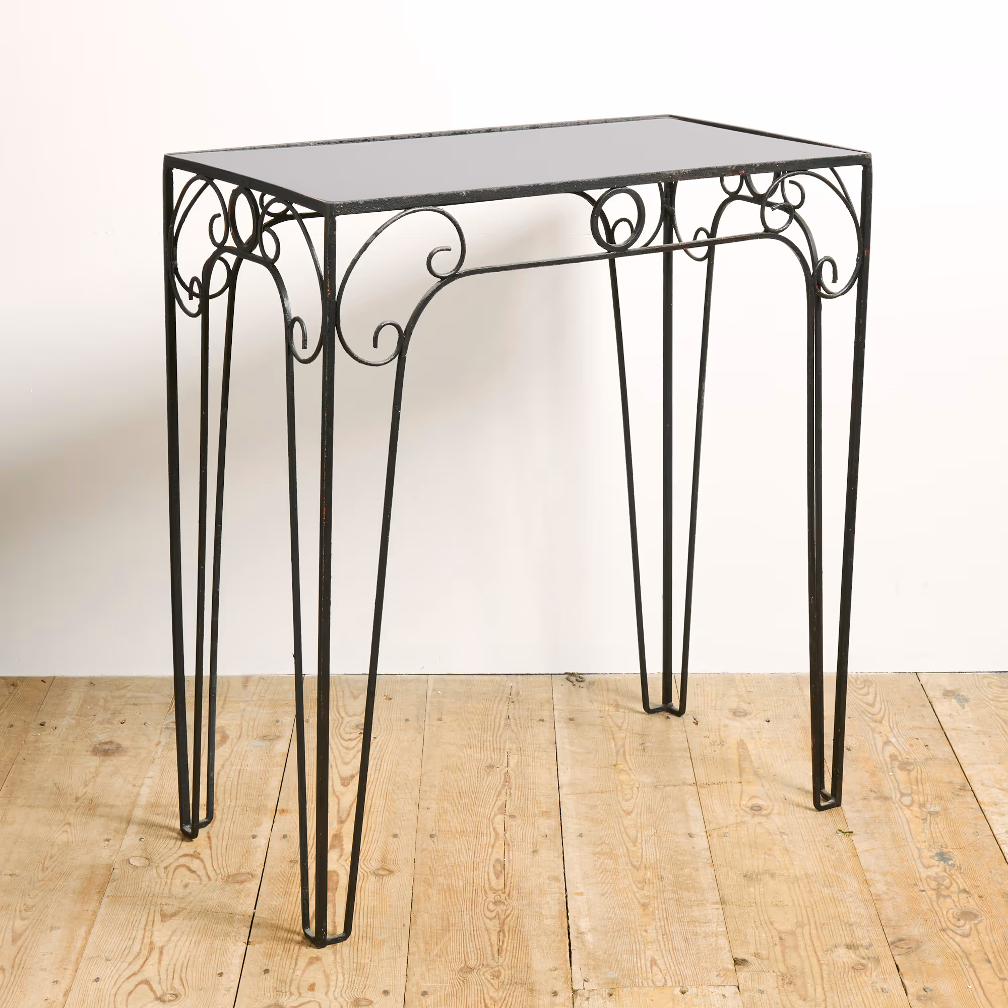 Art Deco hammered steel console table (recent black glass top).