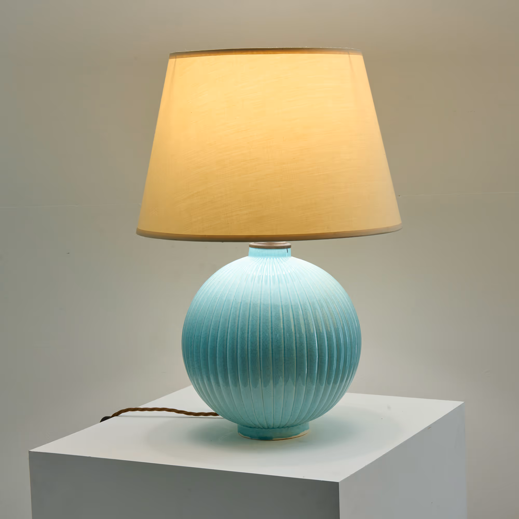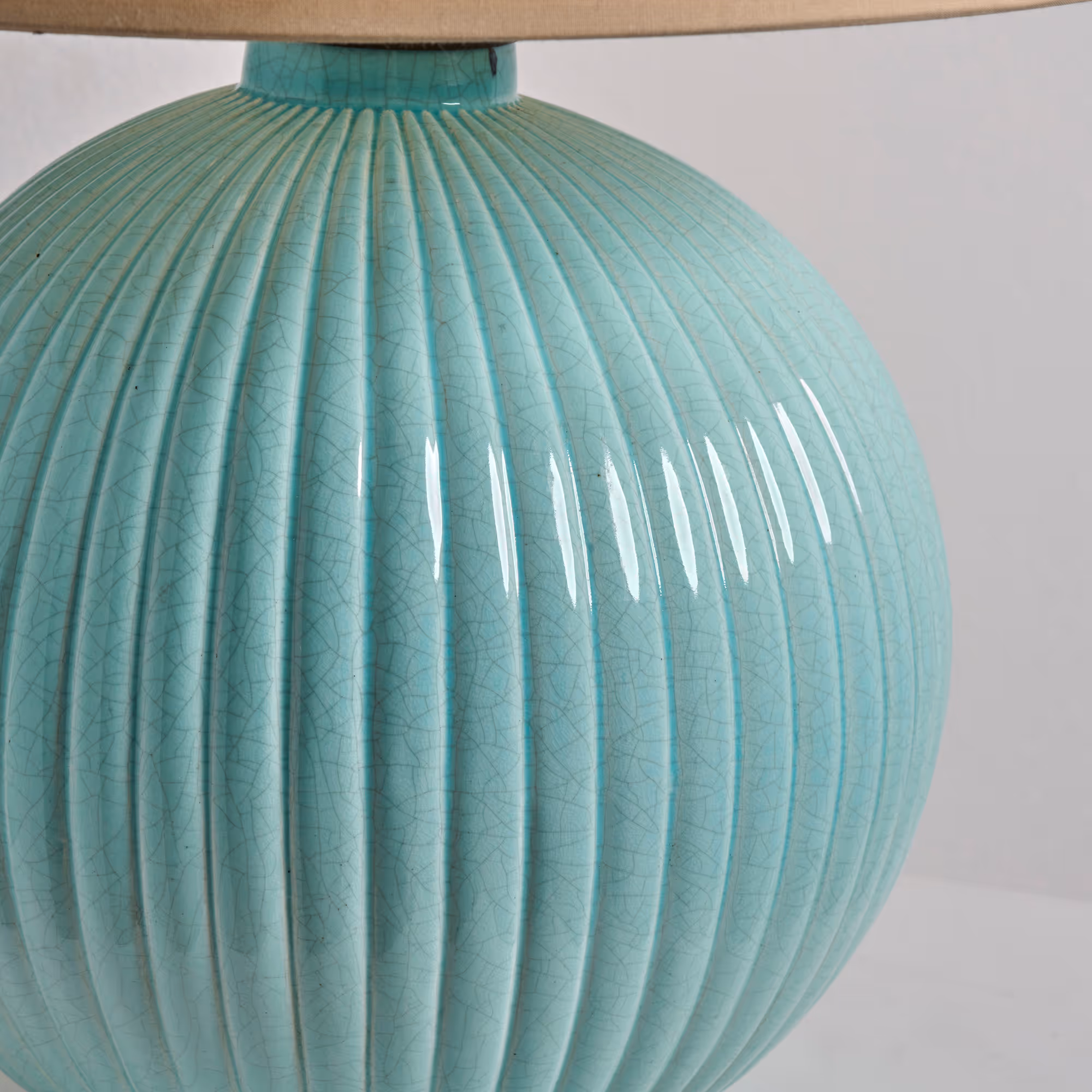 Ridged ball table lamp. Great crackle-glaze, ridged ceramic in a soft aqua hue.